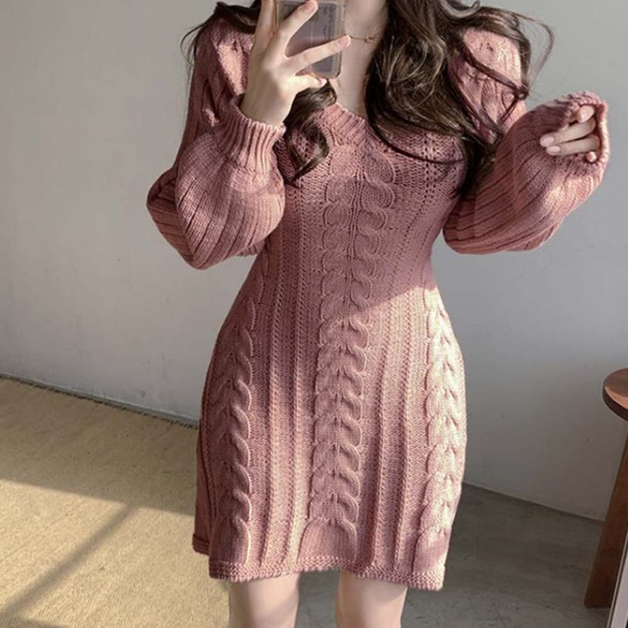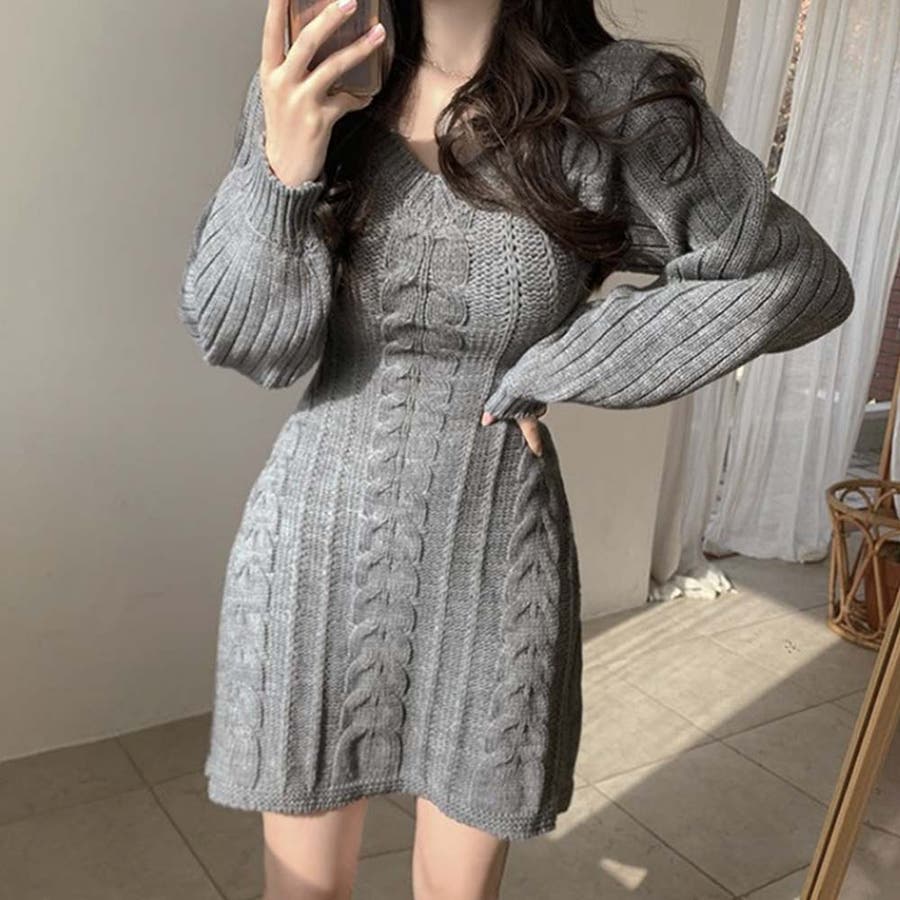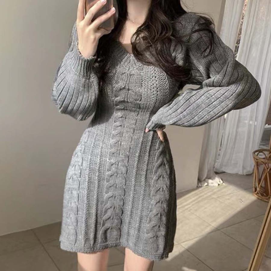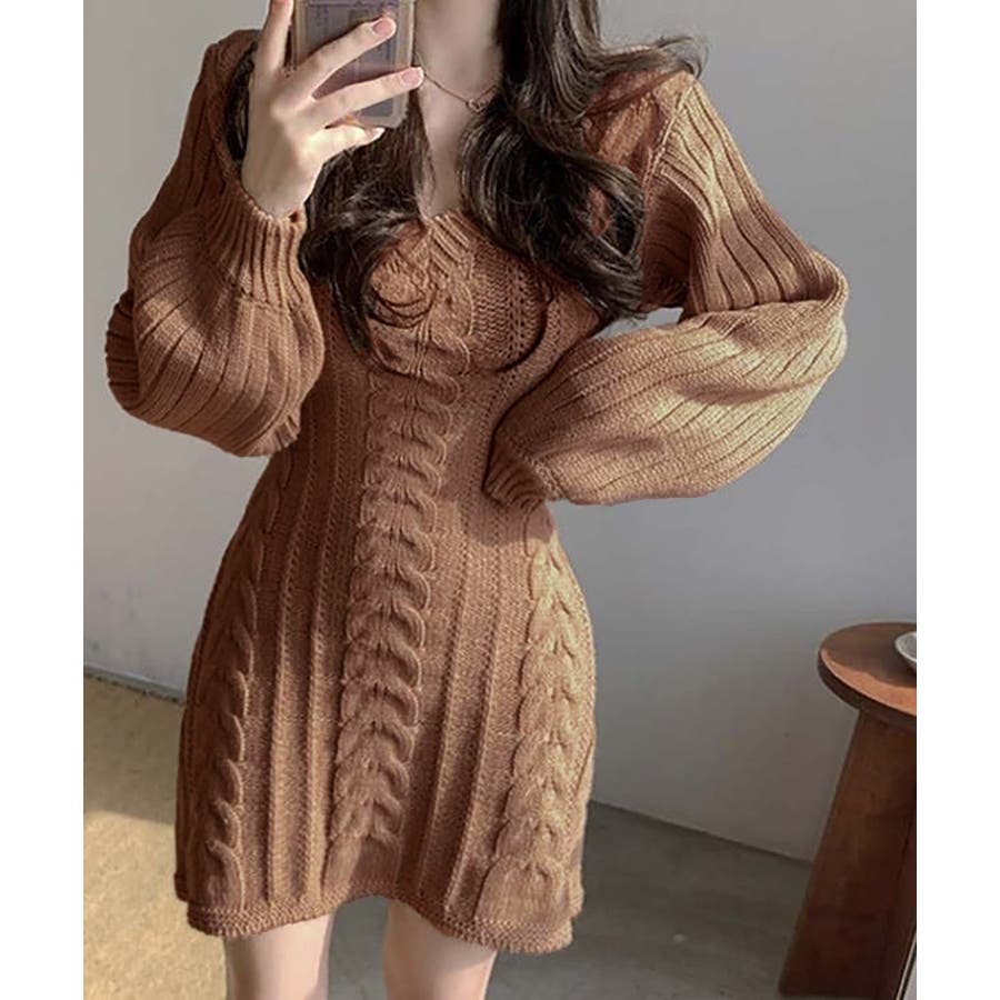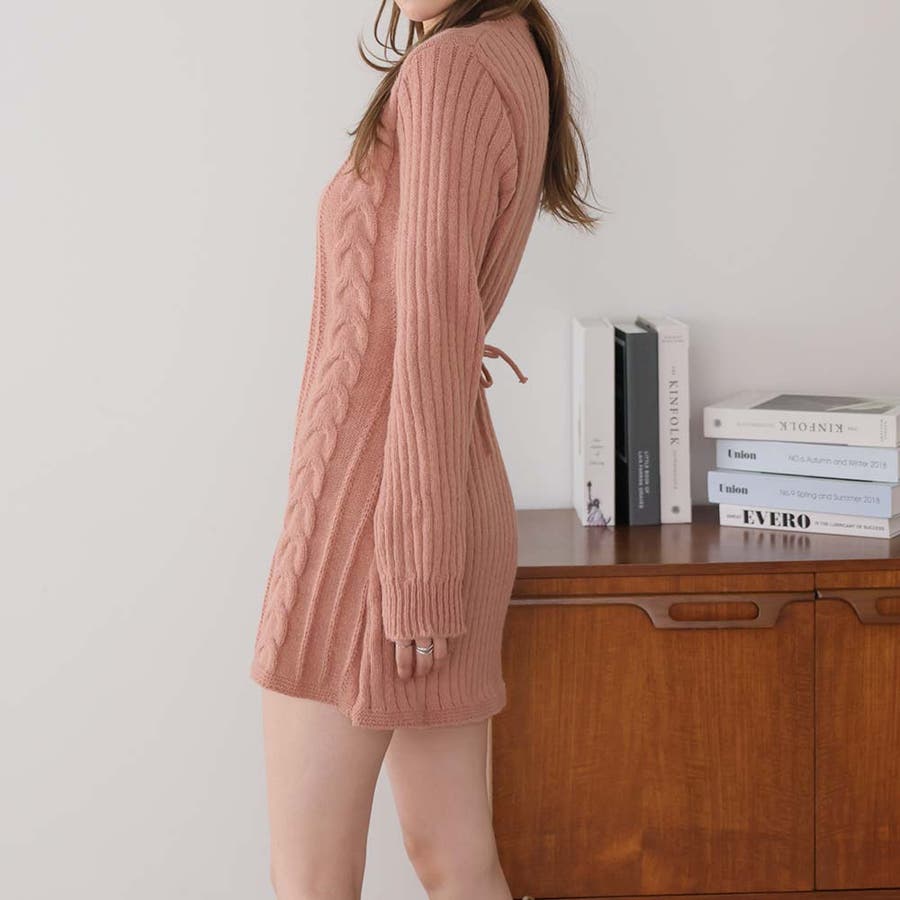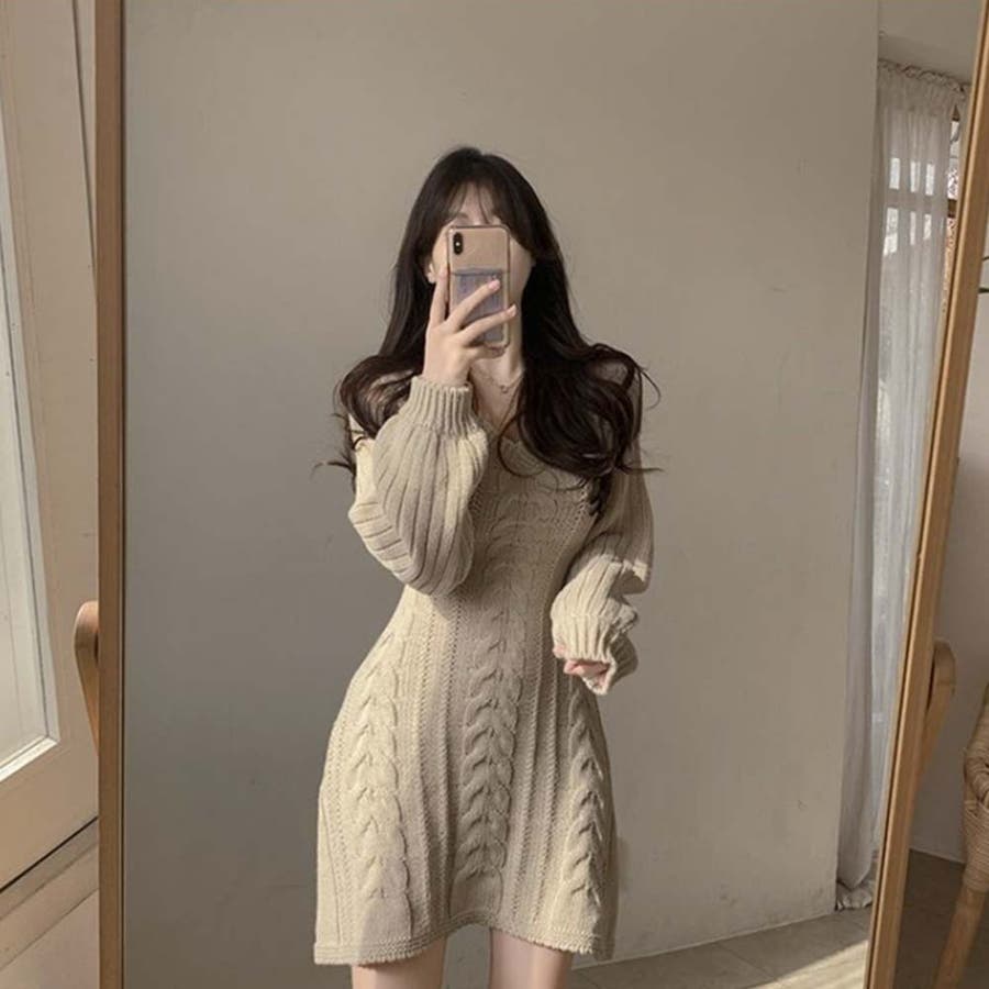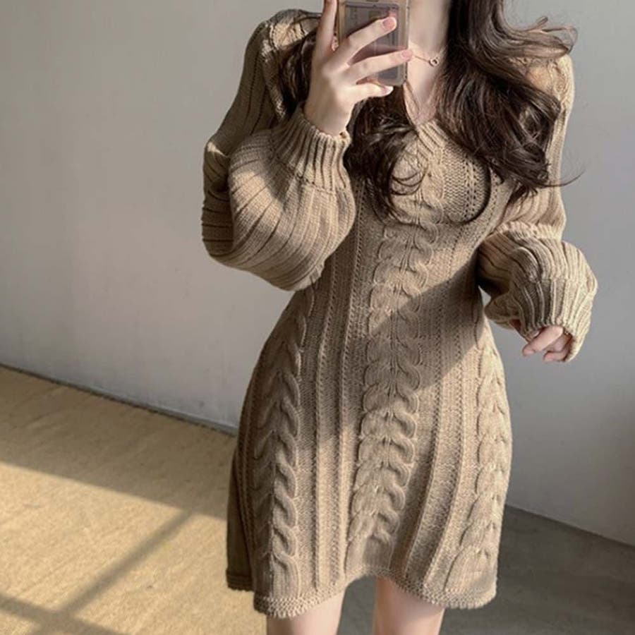 Vネックケーブルニットミニワンピース【韓国ファッション】