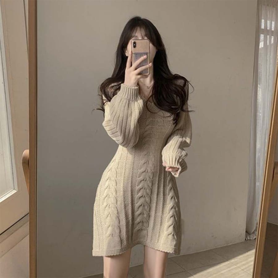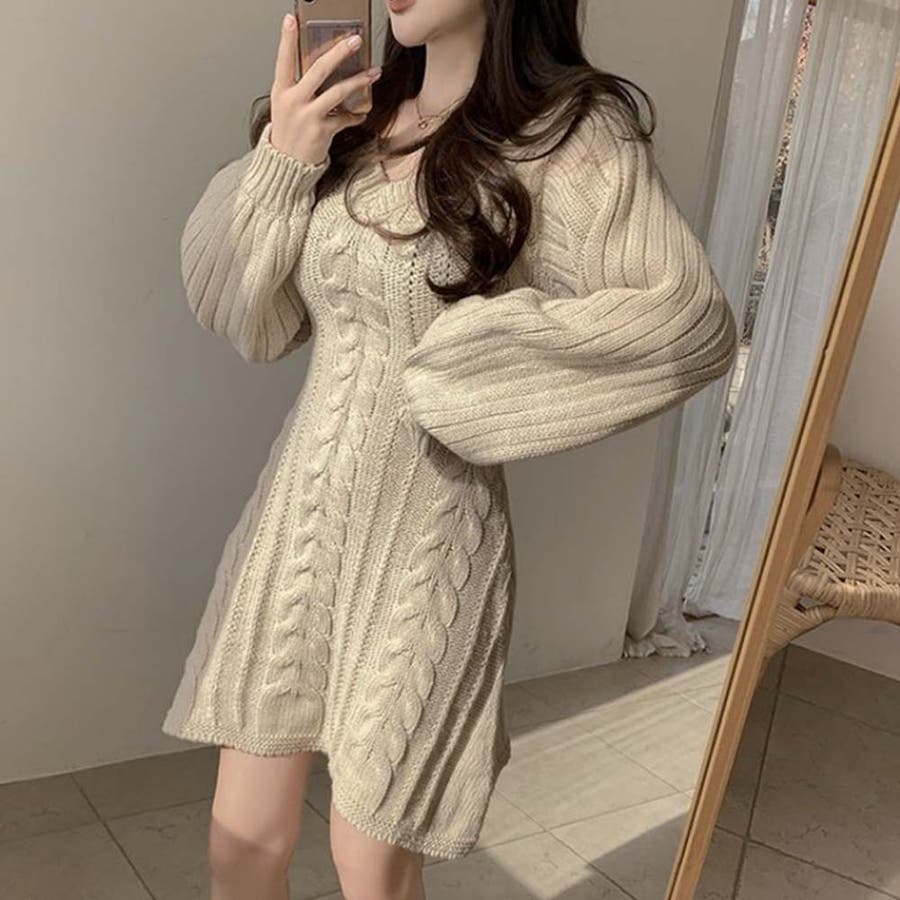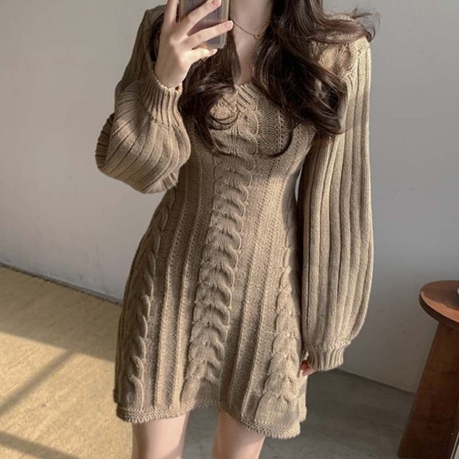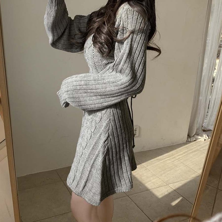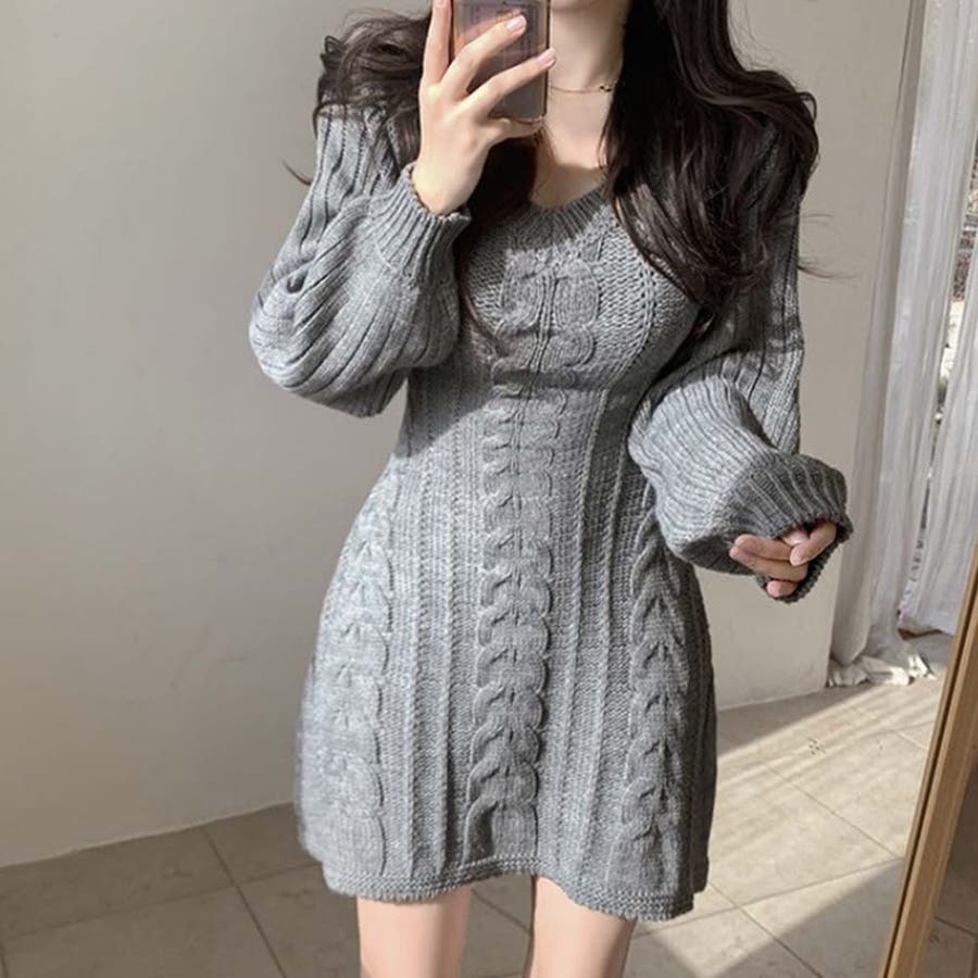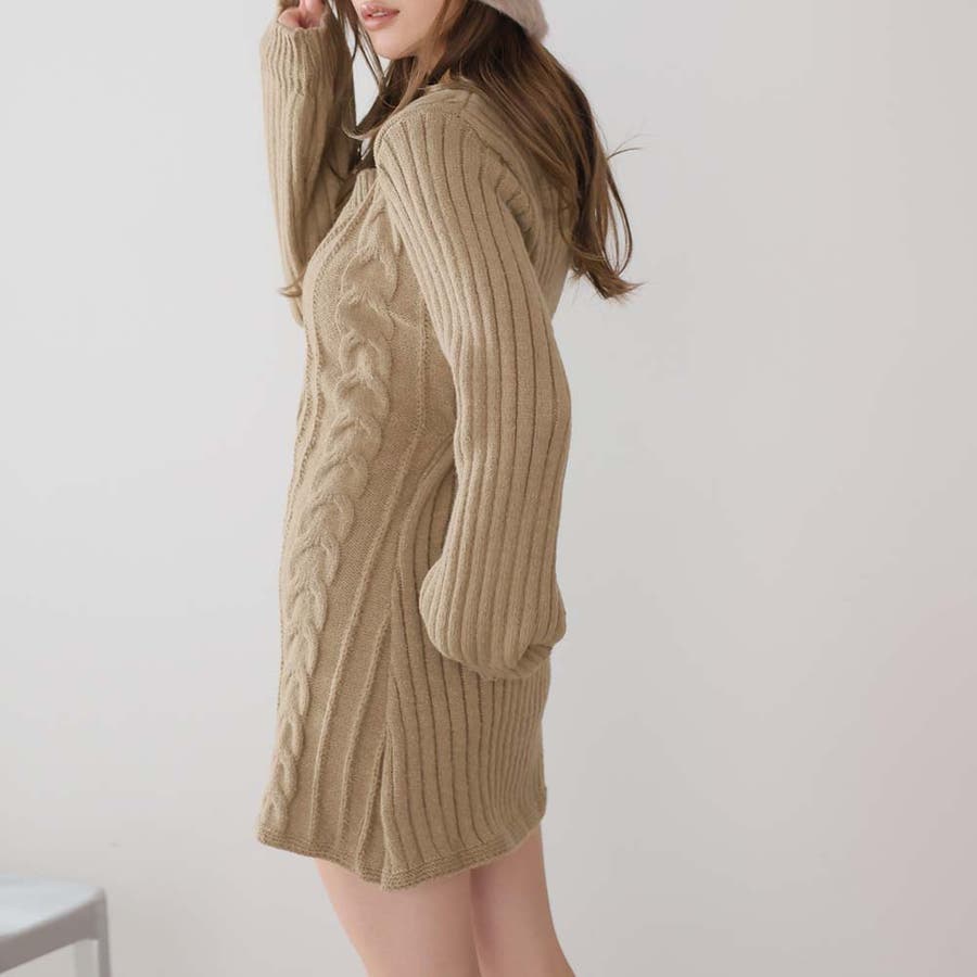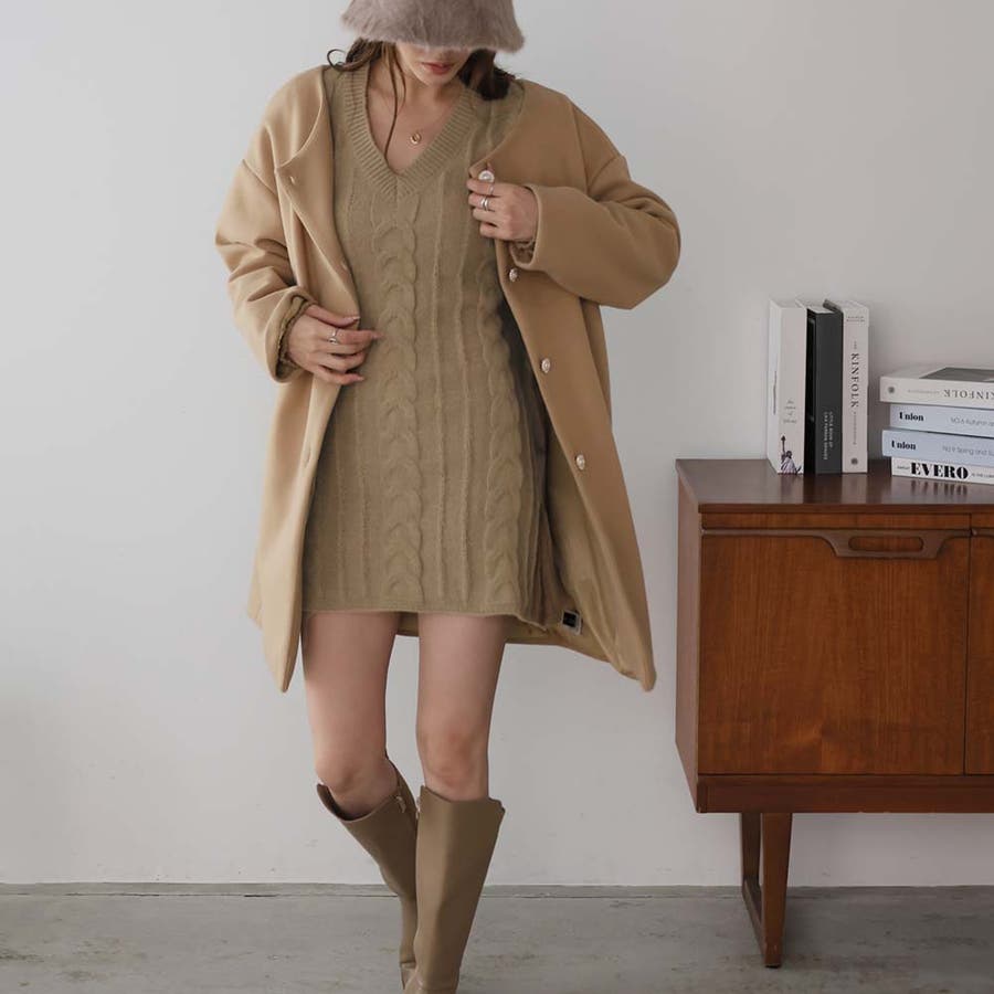 Vネックケーブルニットミニワンピース【韓国ファッション】