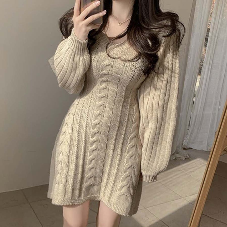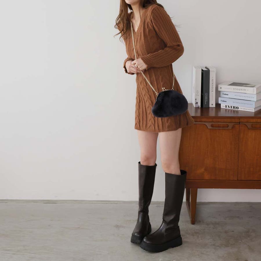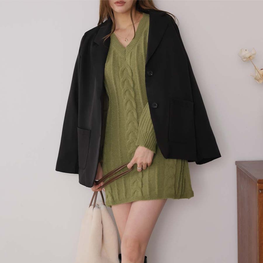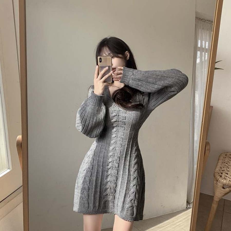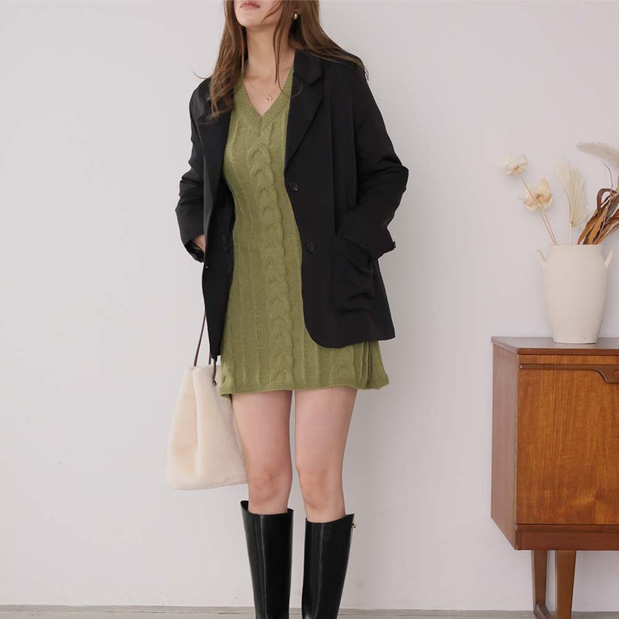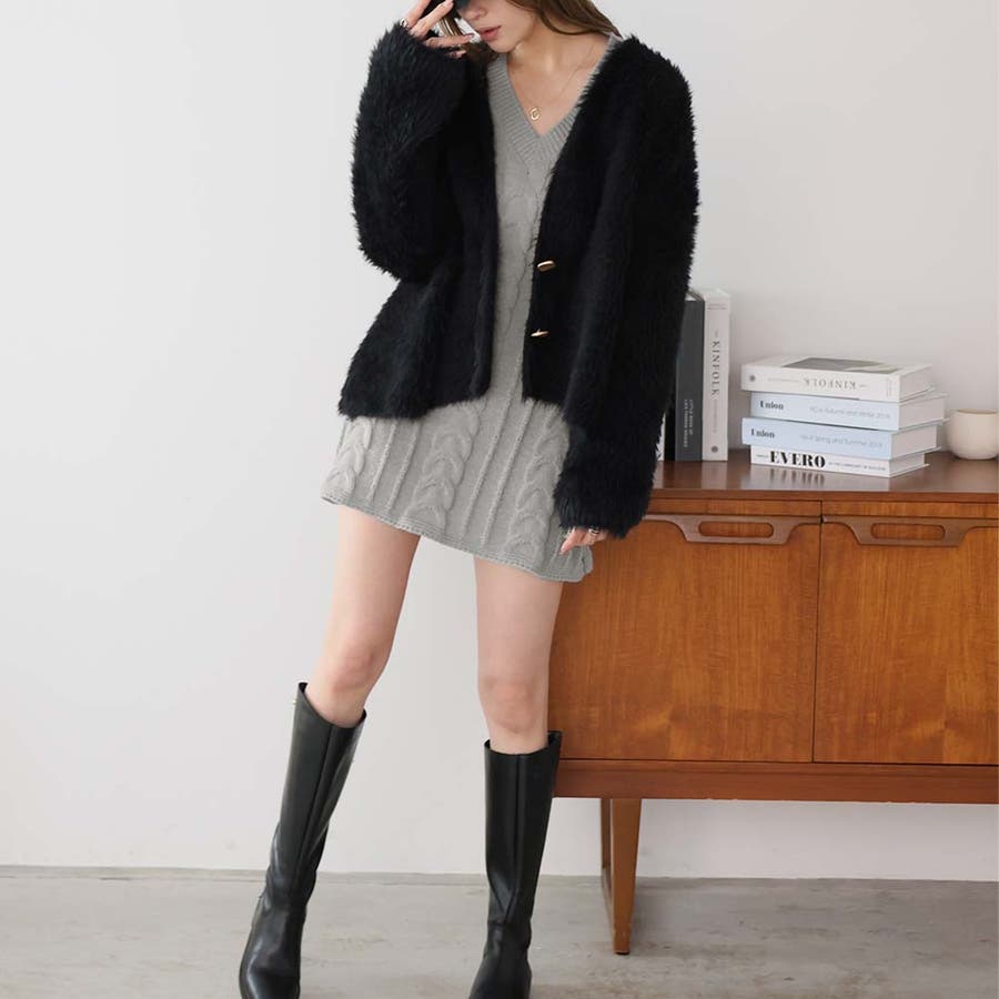 Vネックケーブルニットミニワンピース【韓国ファッション】