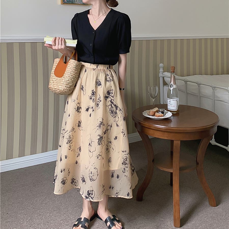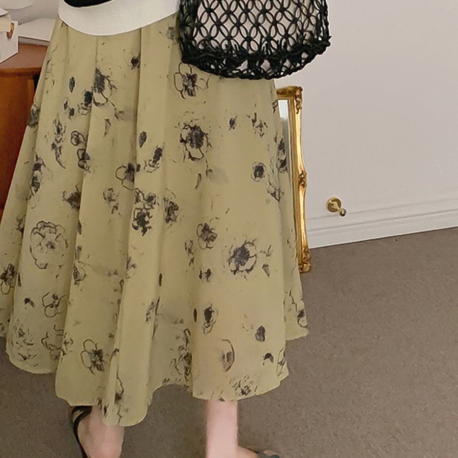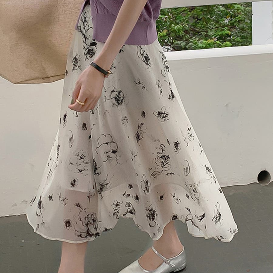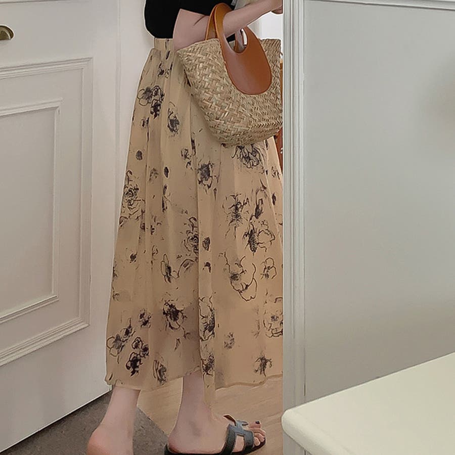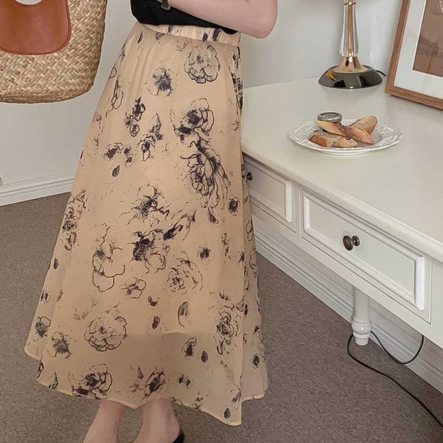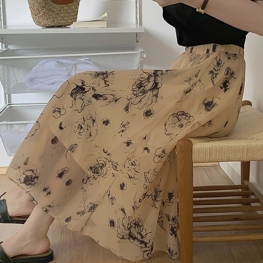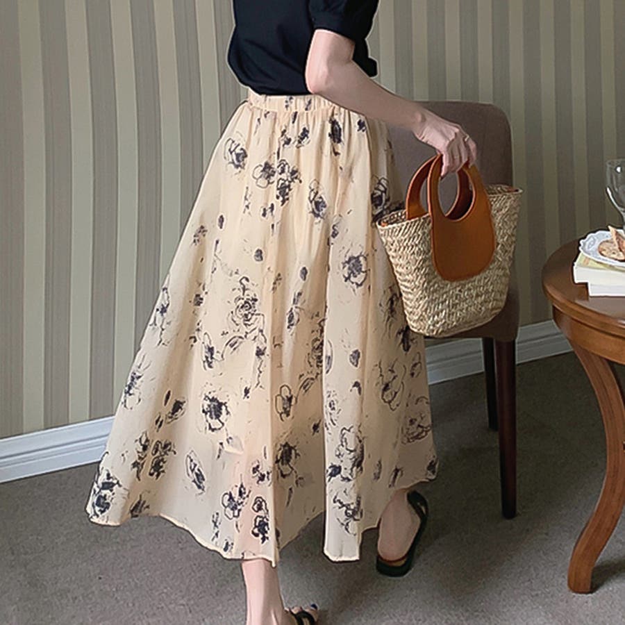 大人可愛い花柄。フレアシフォンロングスカート