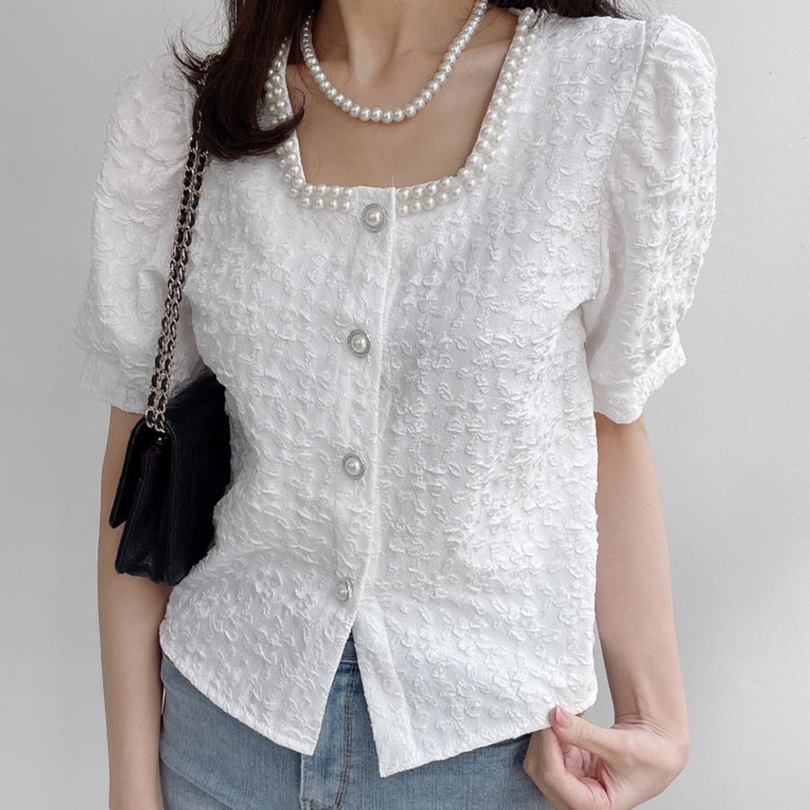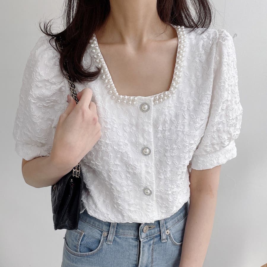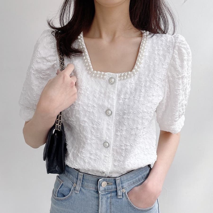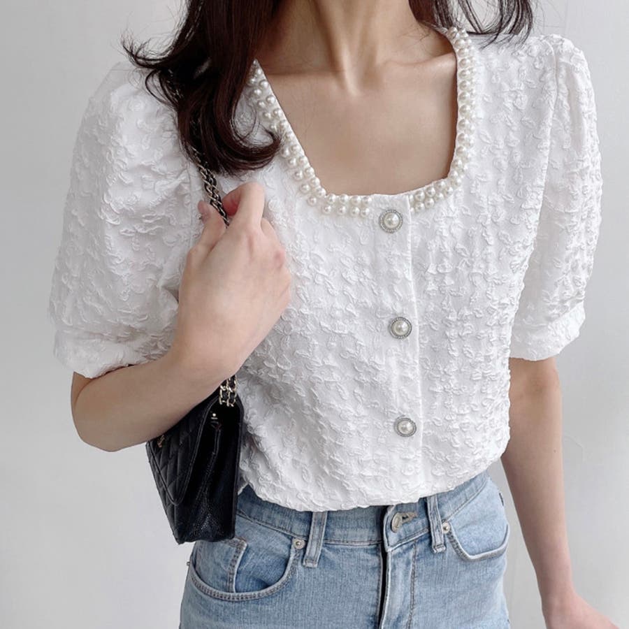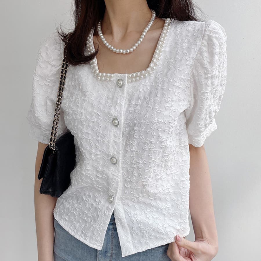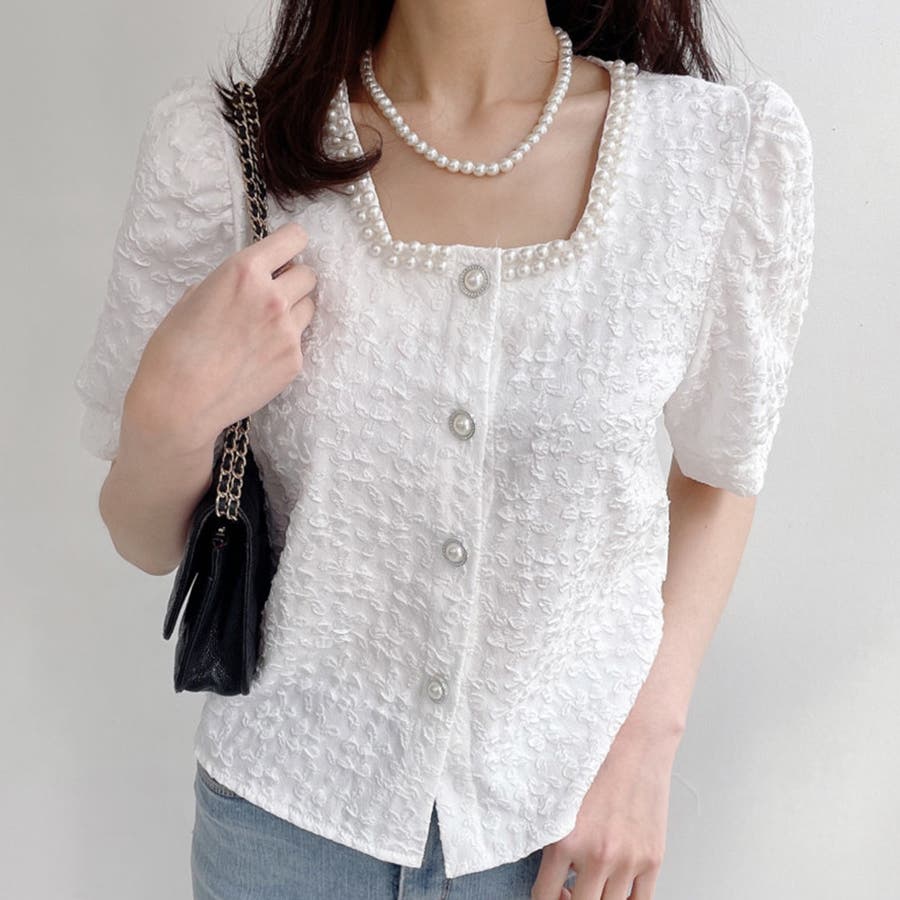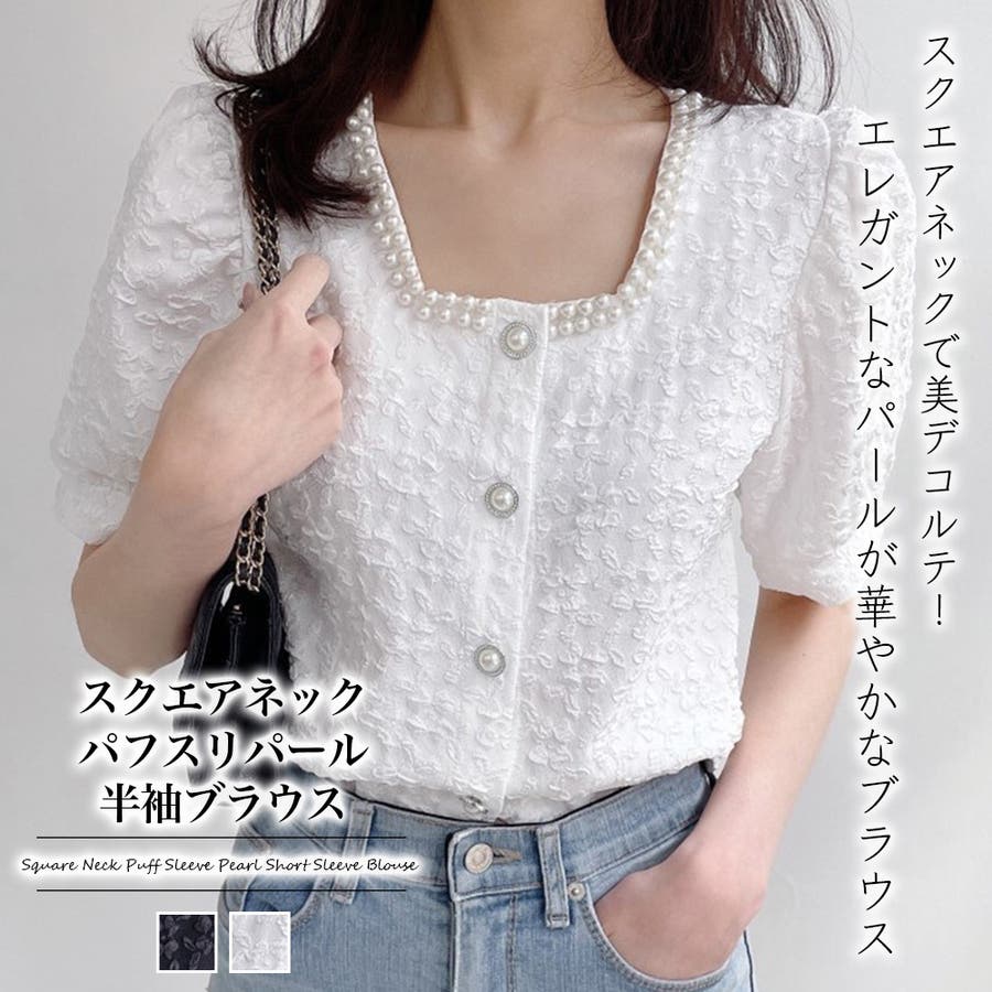パールで品よく。スクエアネックパフスリパール半袖ブラウス