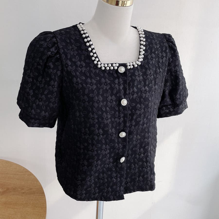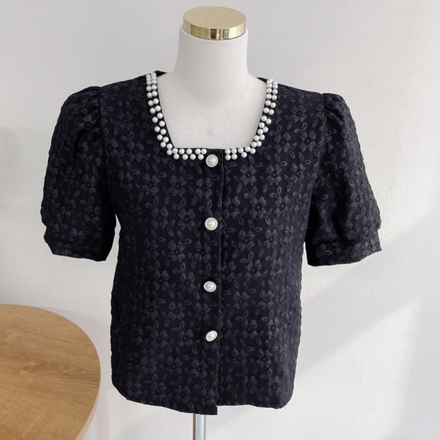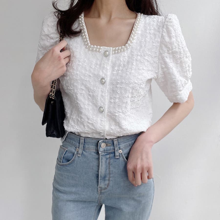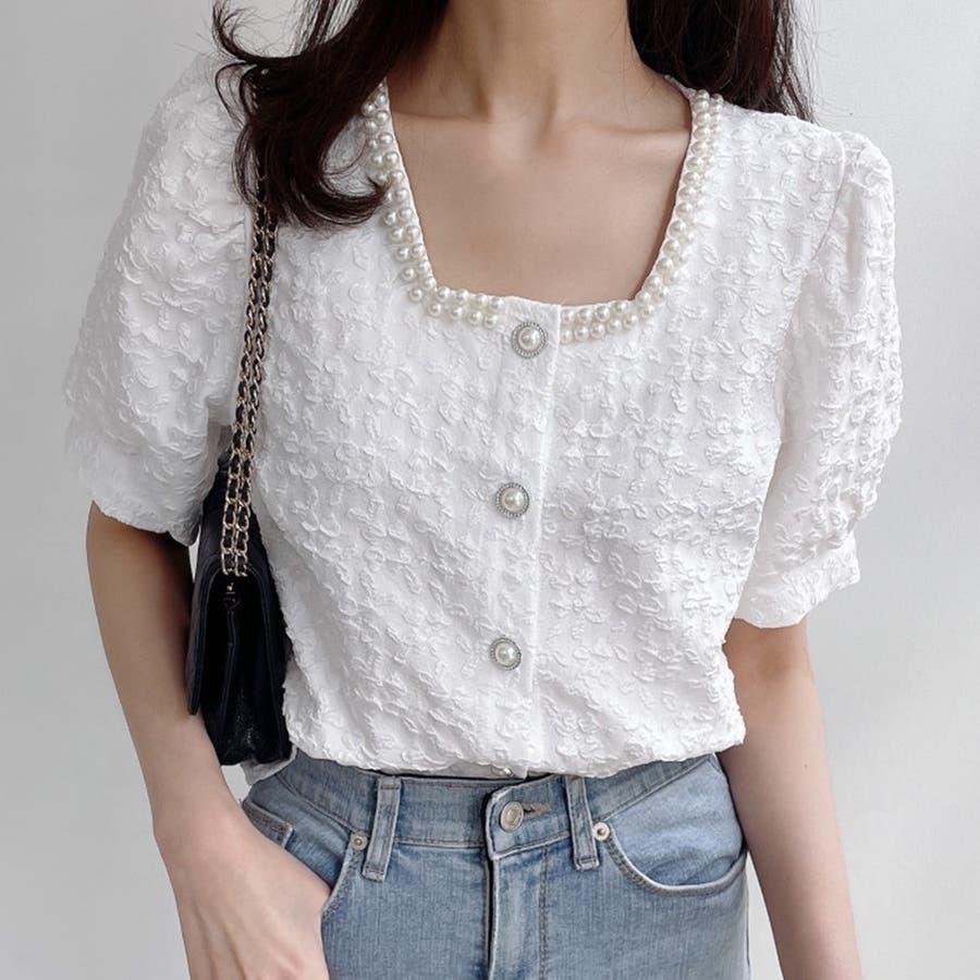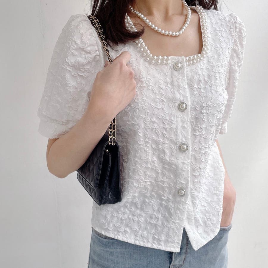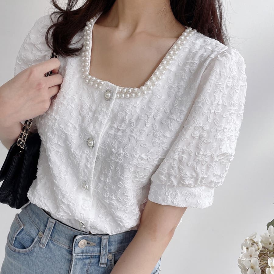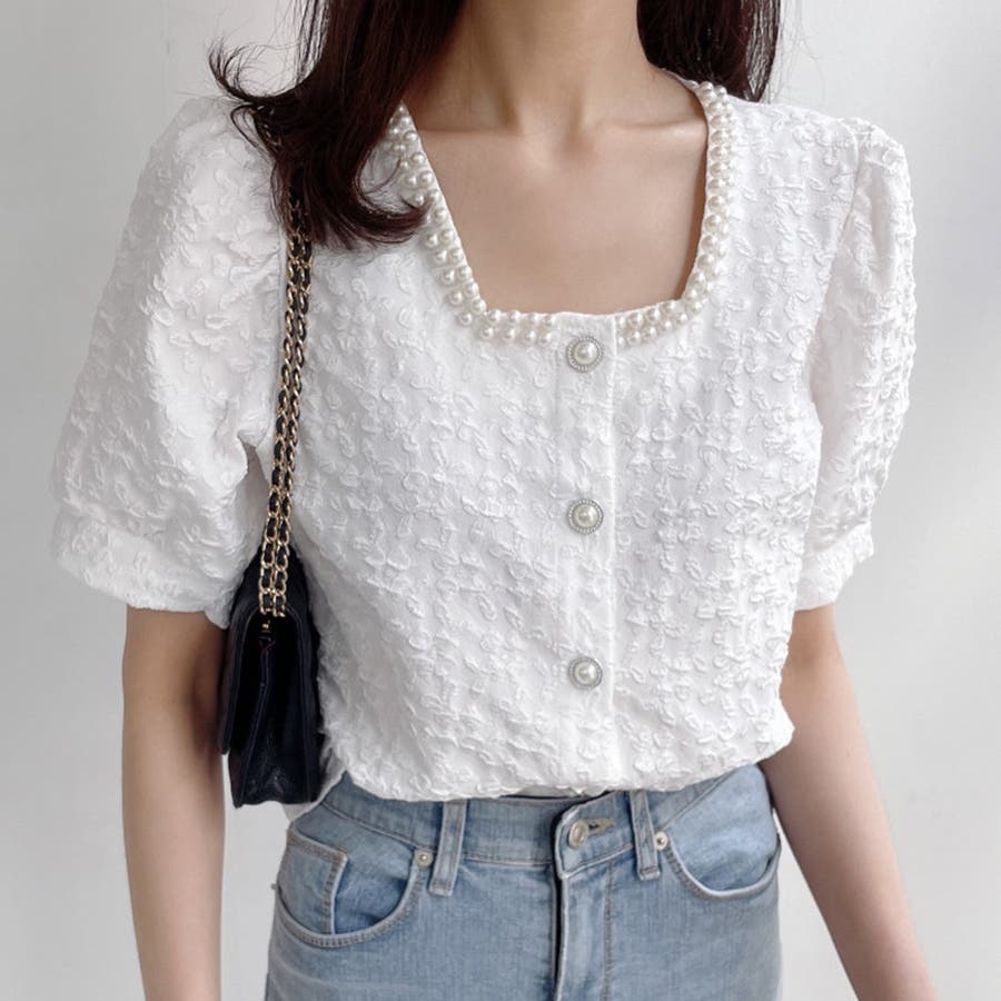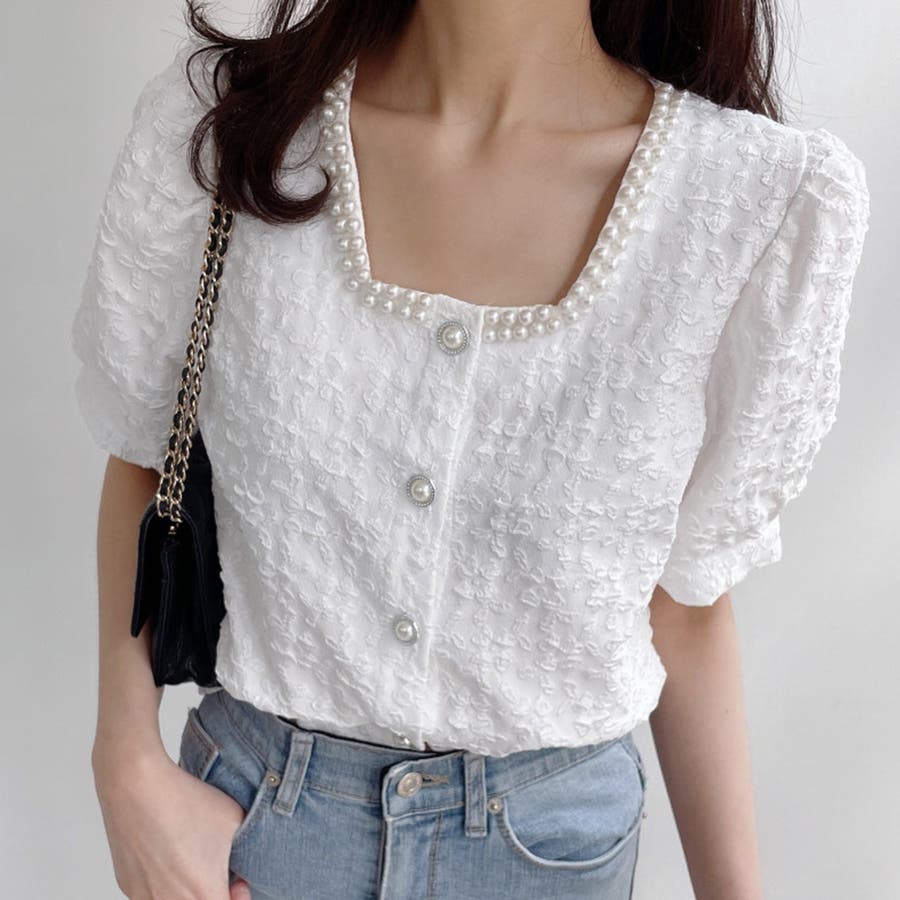 パールで品よく。スクエアネックパフスリパール半袖ブラウス
