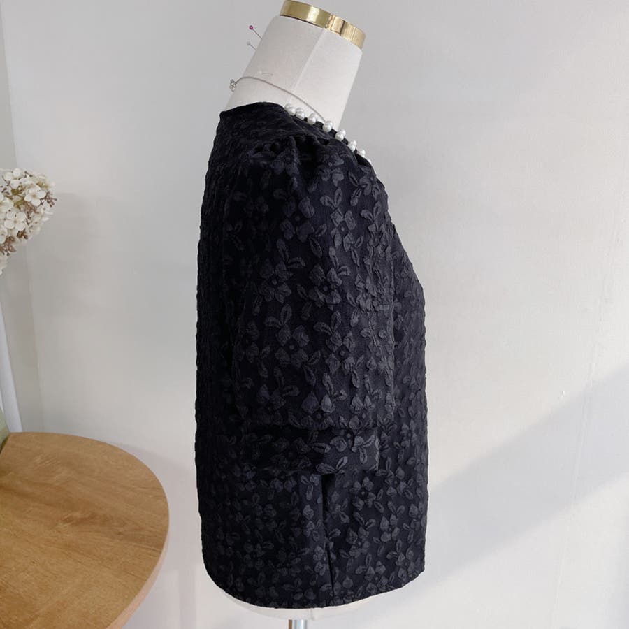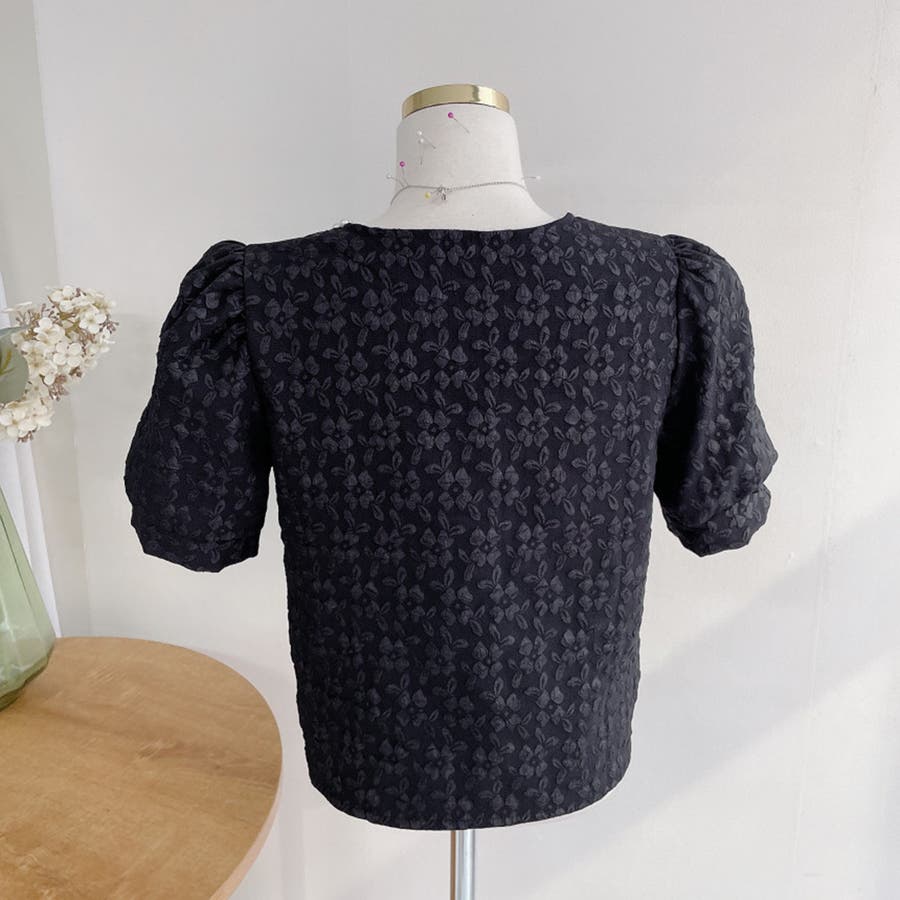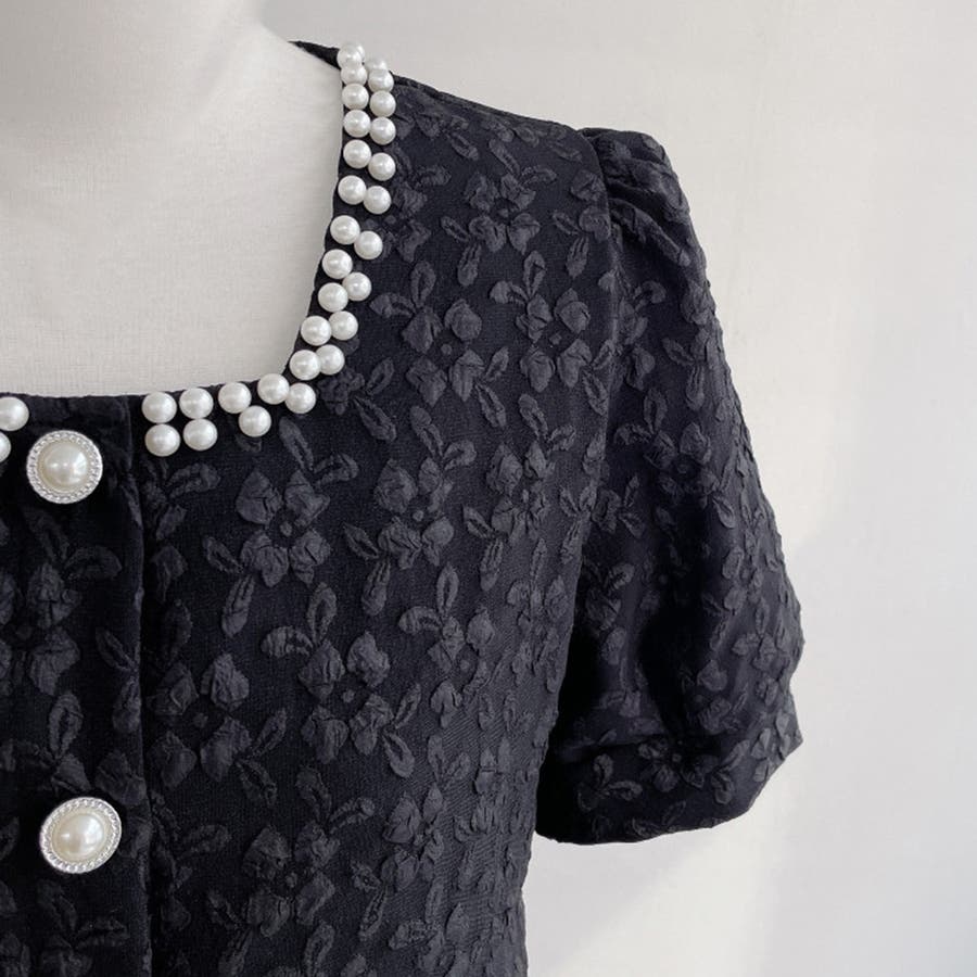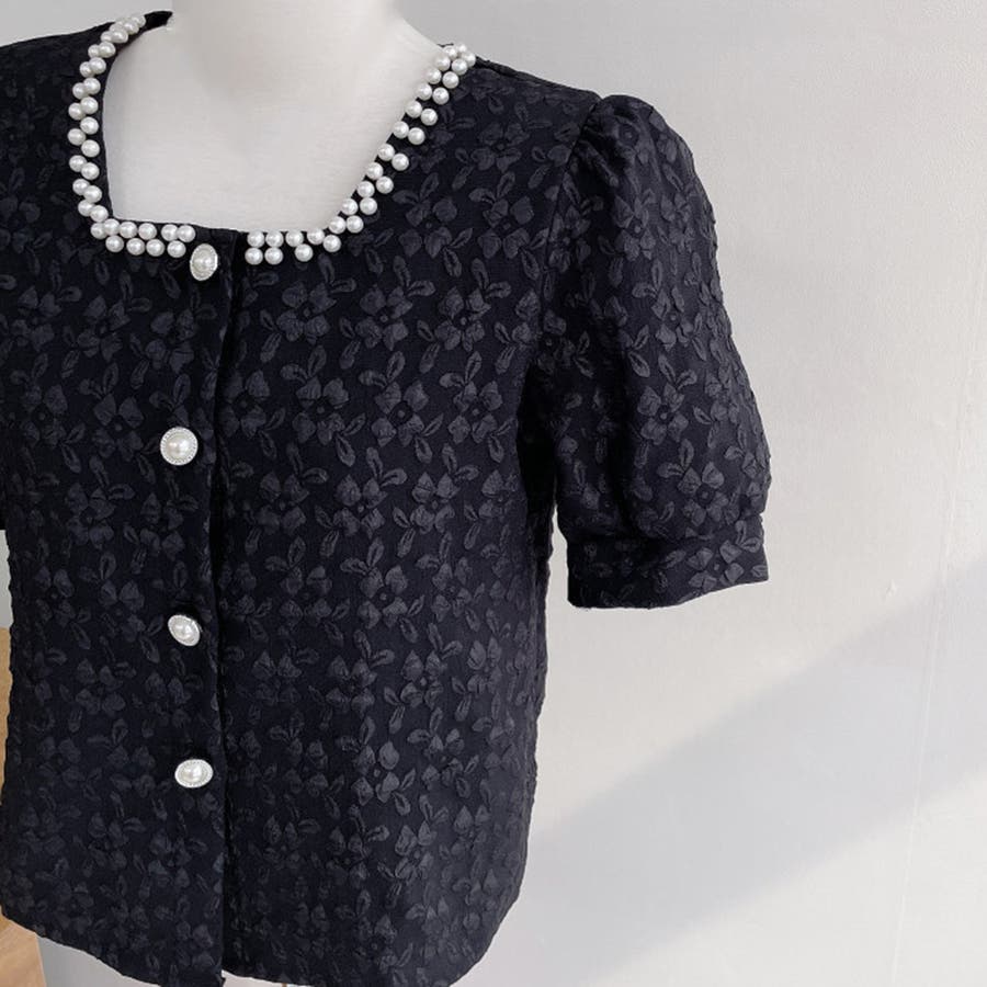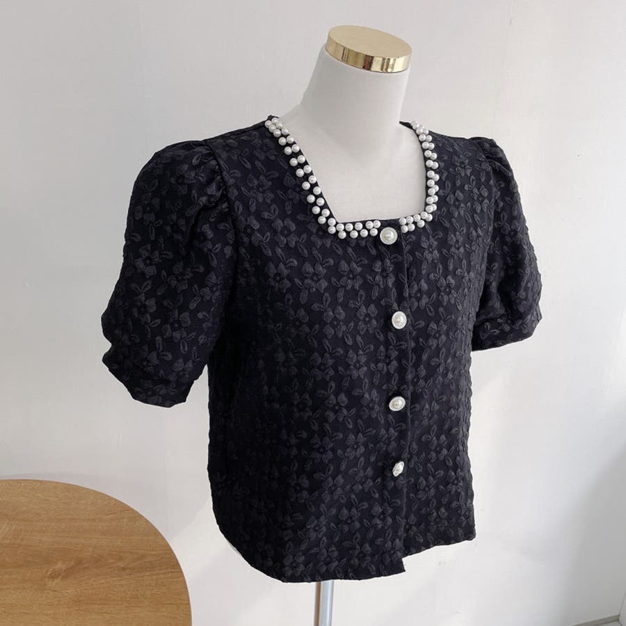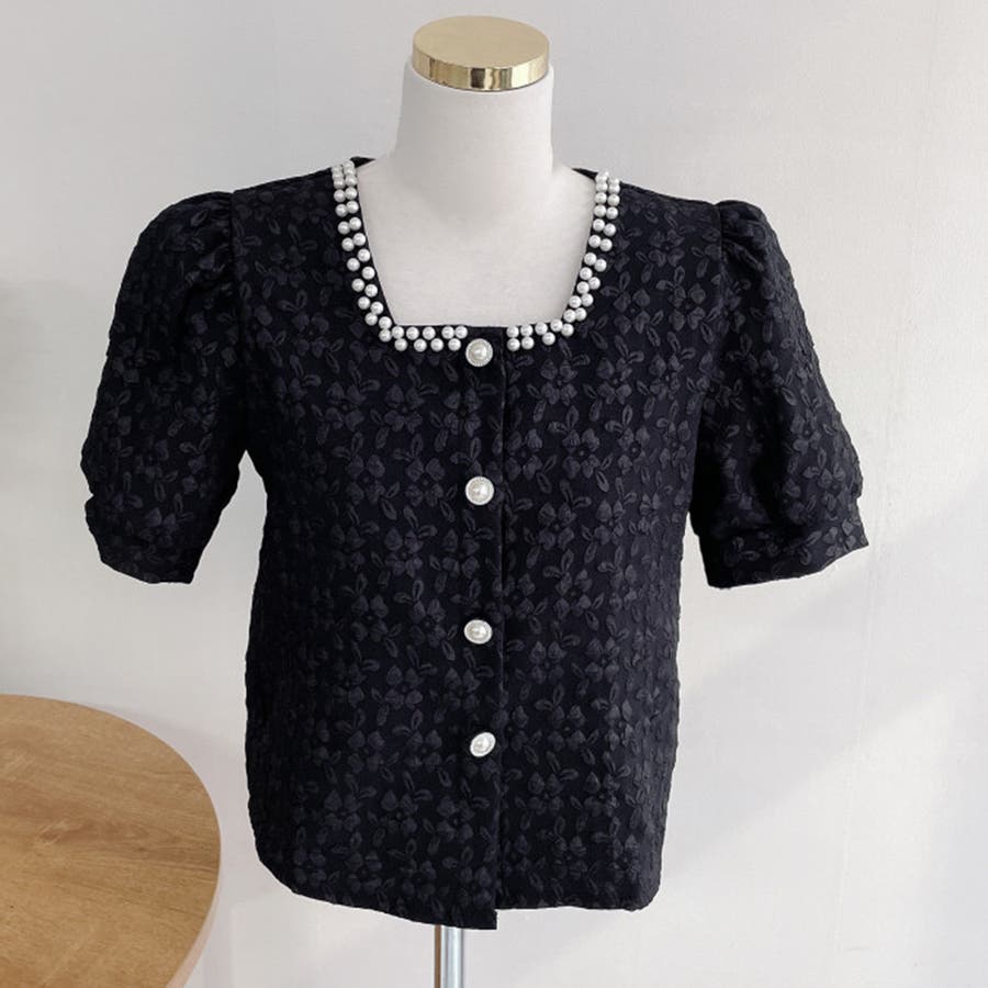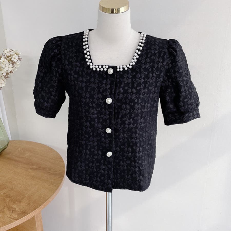 パールで品よく。スクエアネックパフスリパール半袖ブラウス