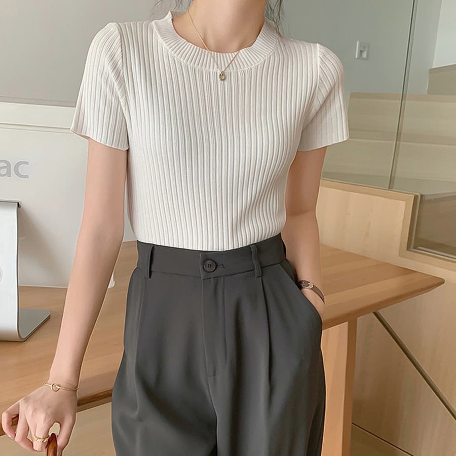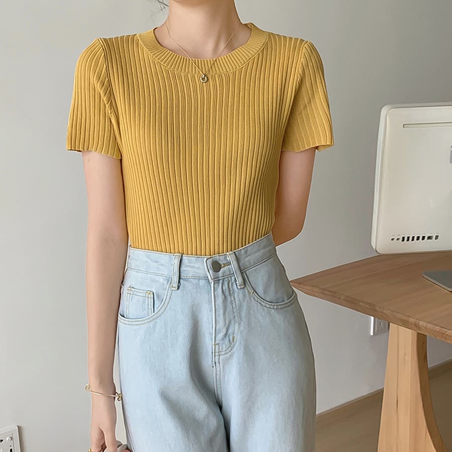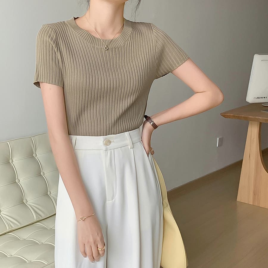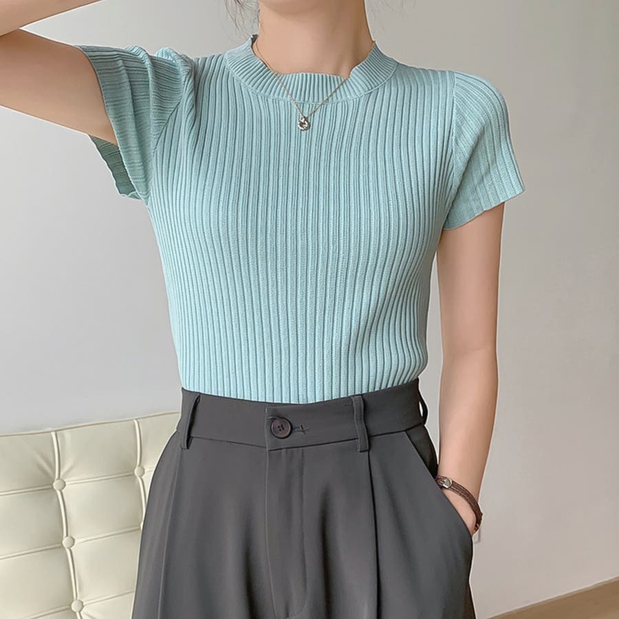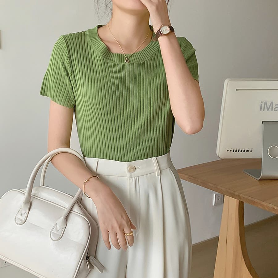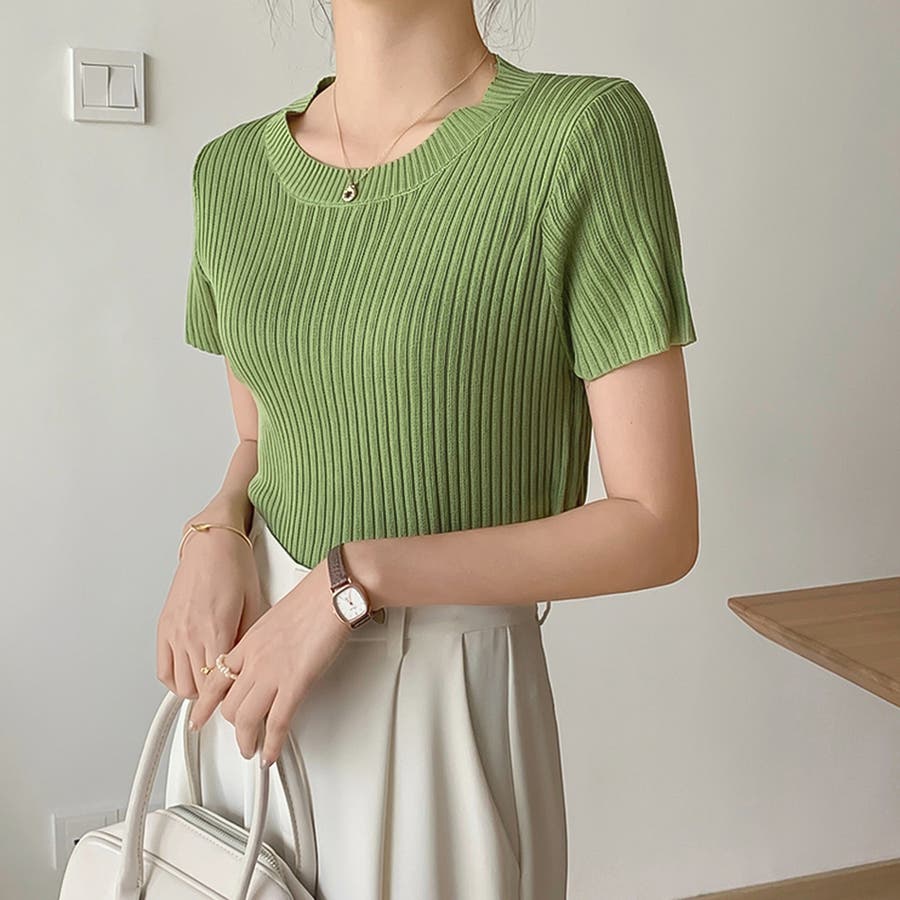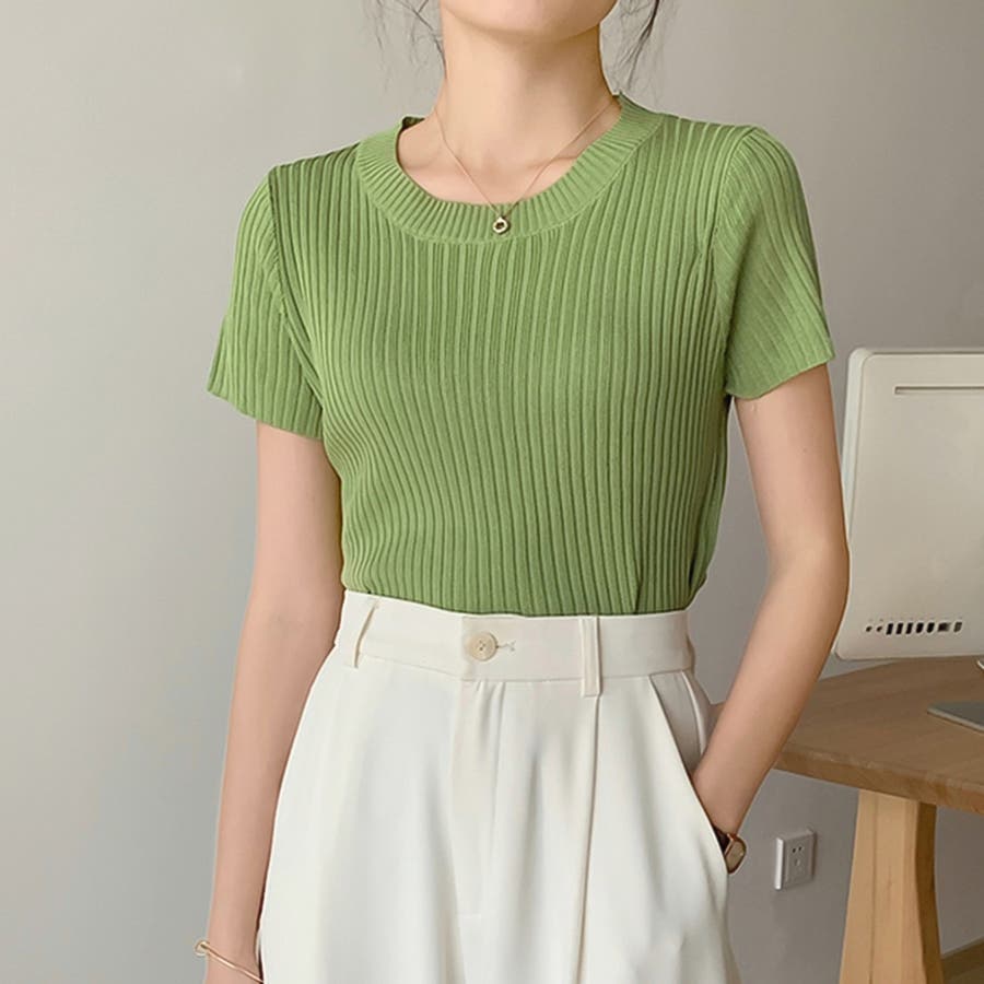 【グリーン】リブクルーネック半袖トップス【韓国ファッション】
