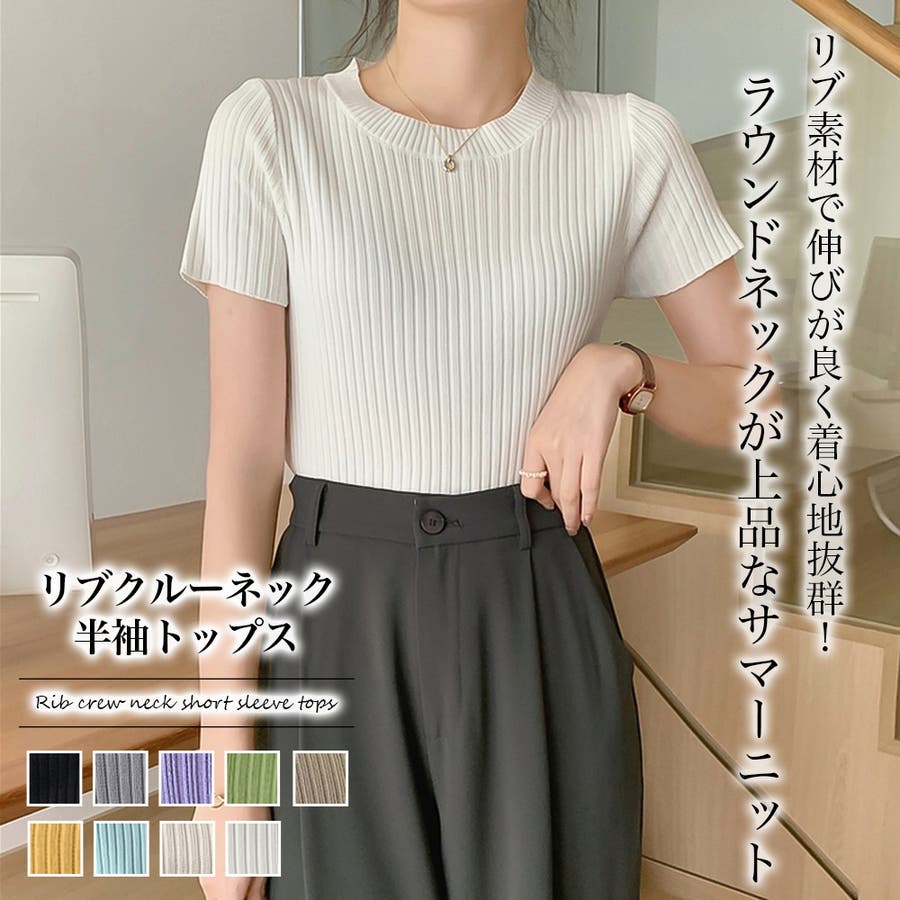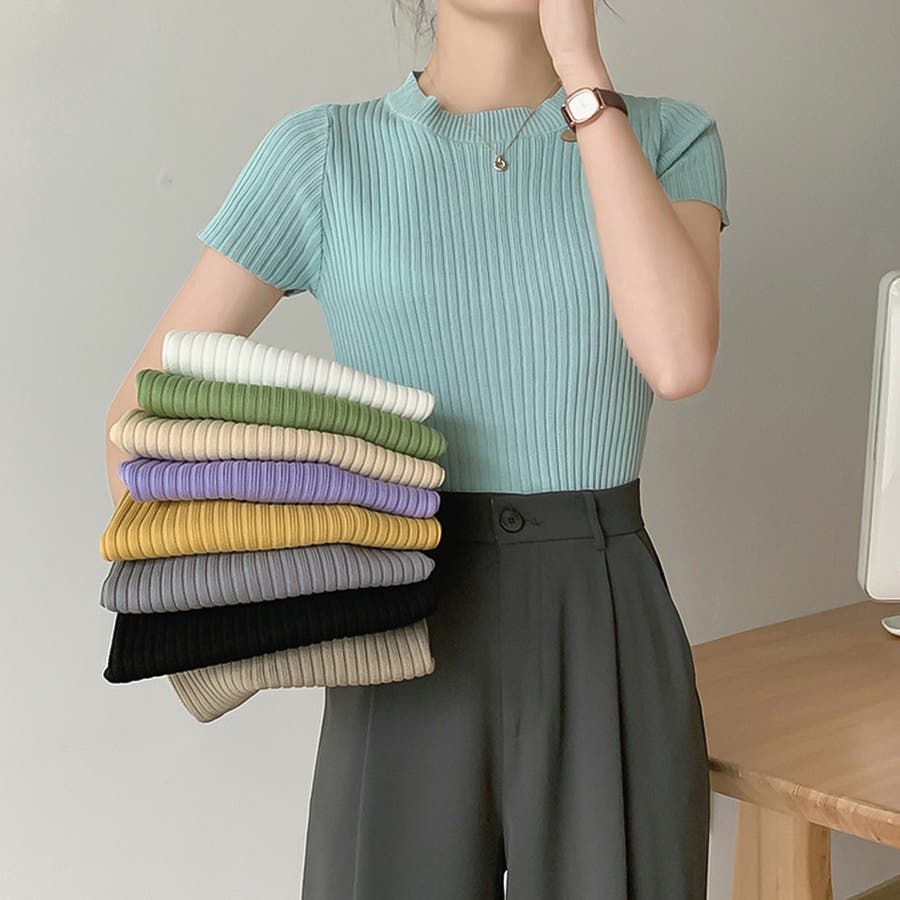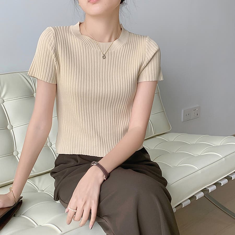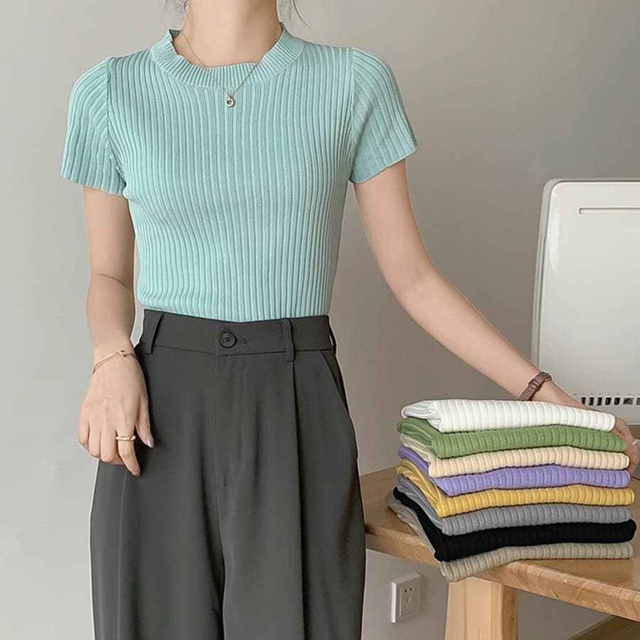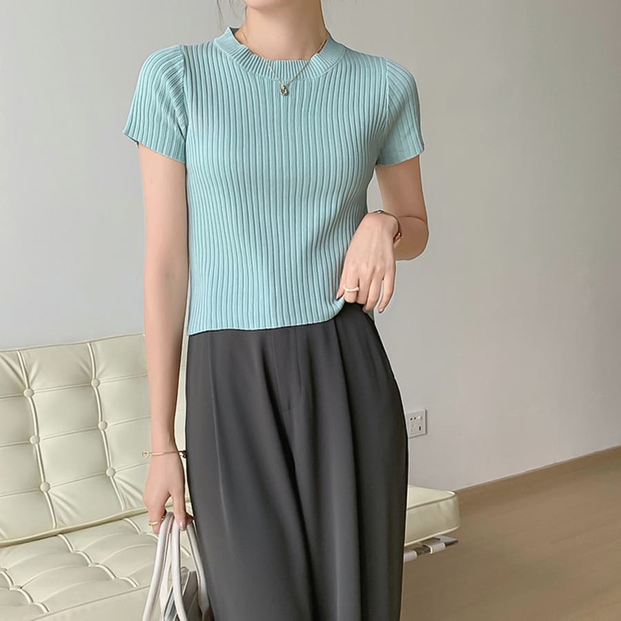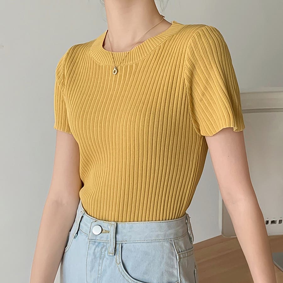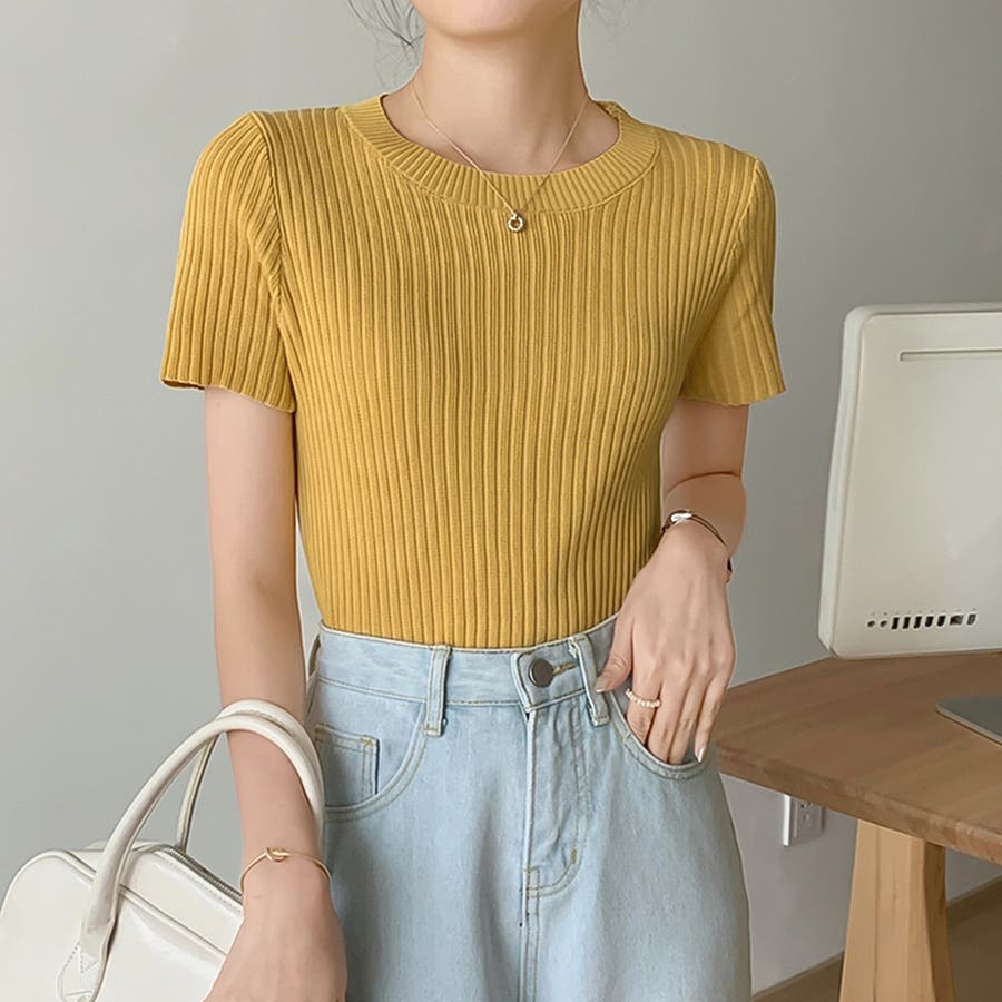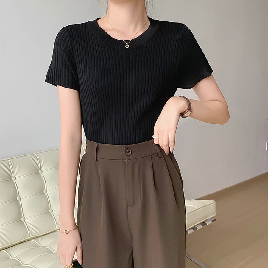 【グリーン】リブクルーネック半袖トップス【韓国ファッション】