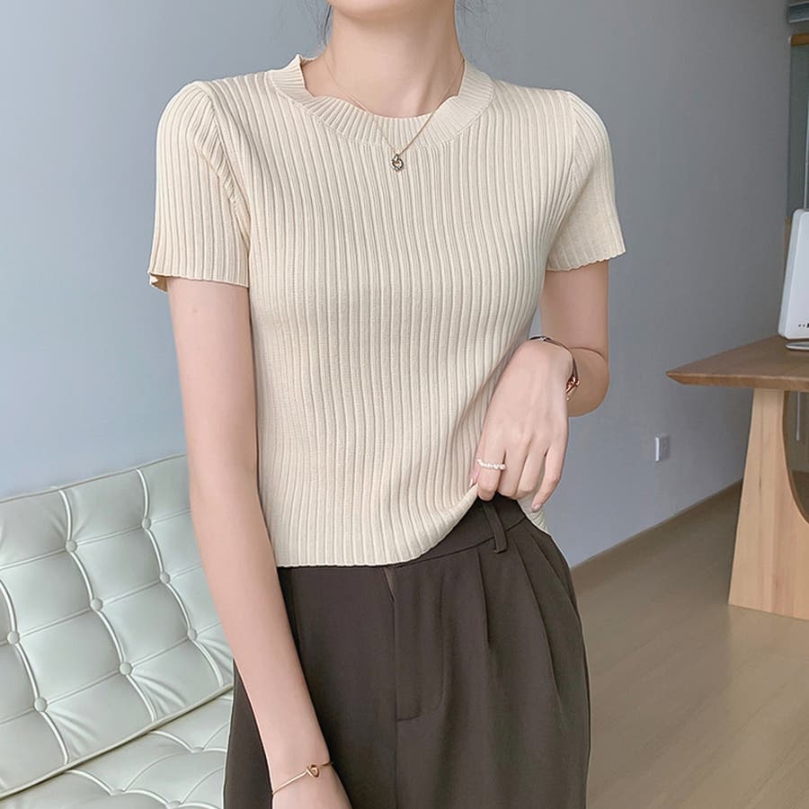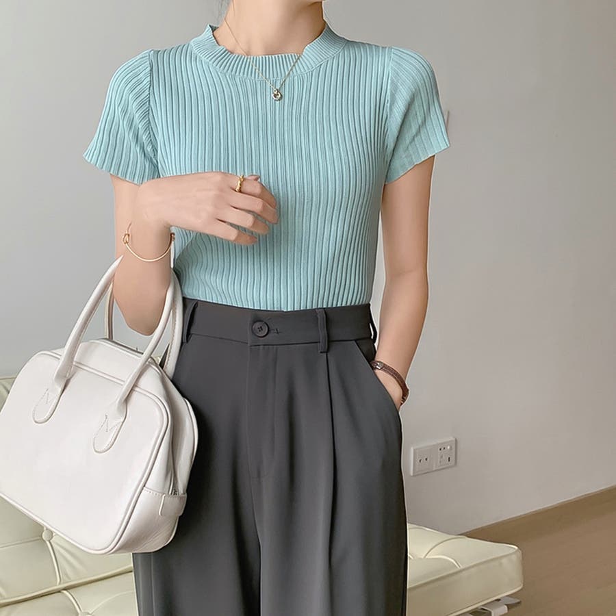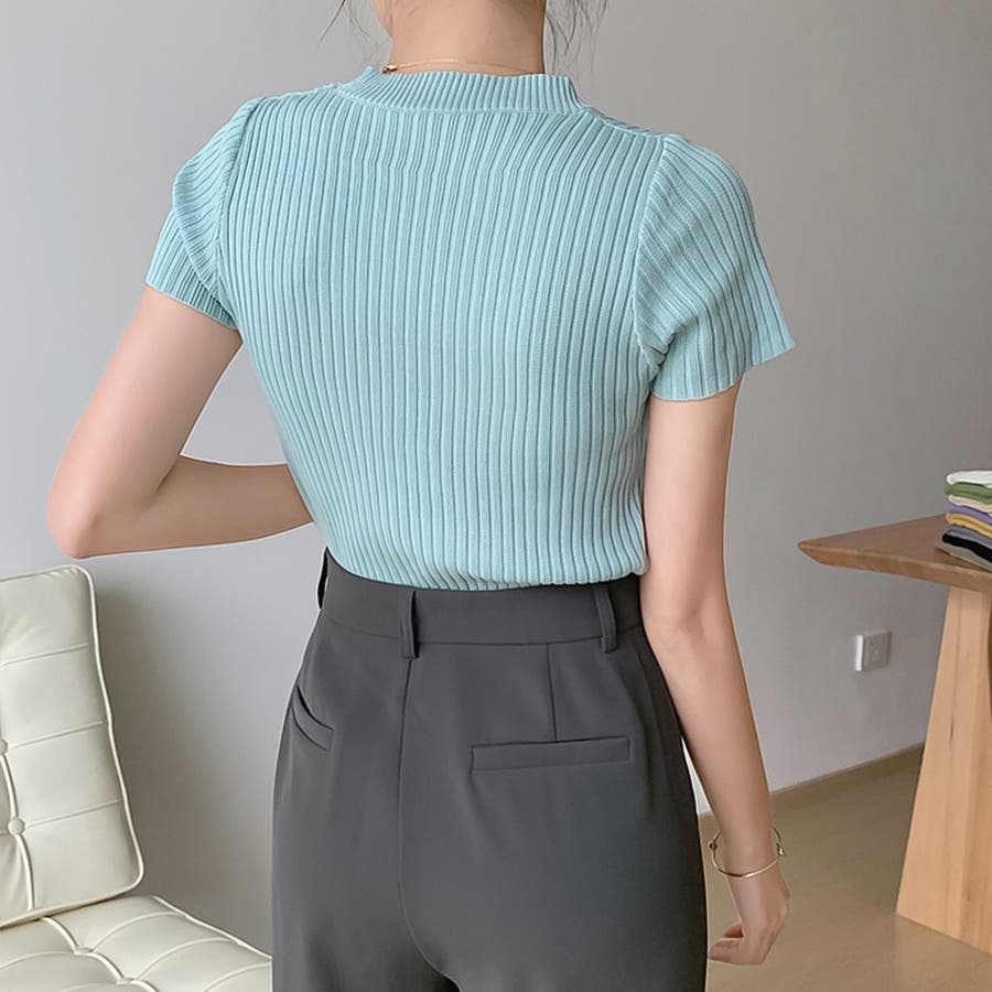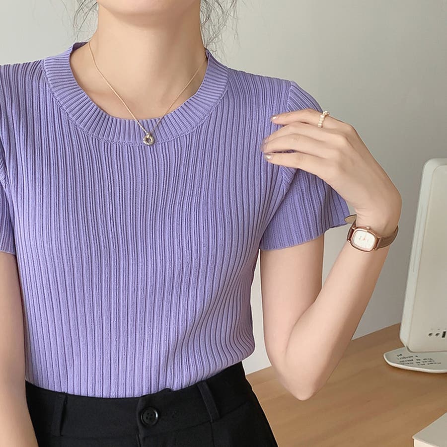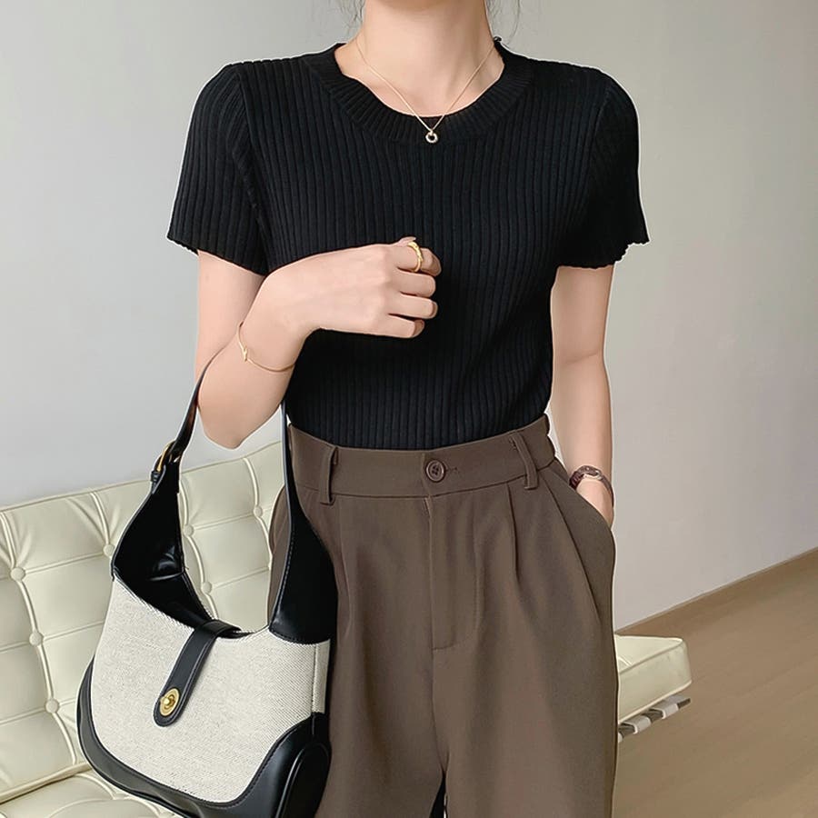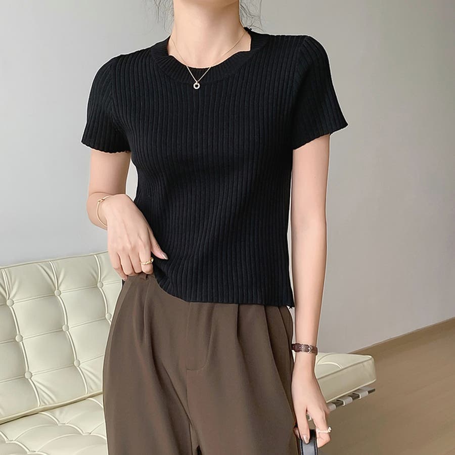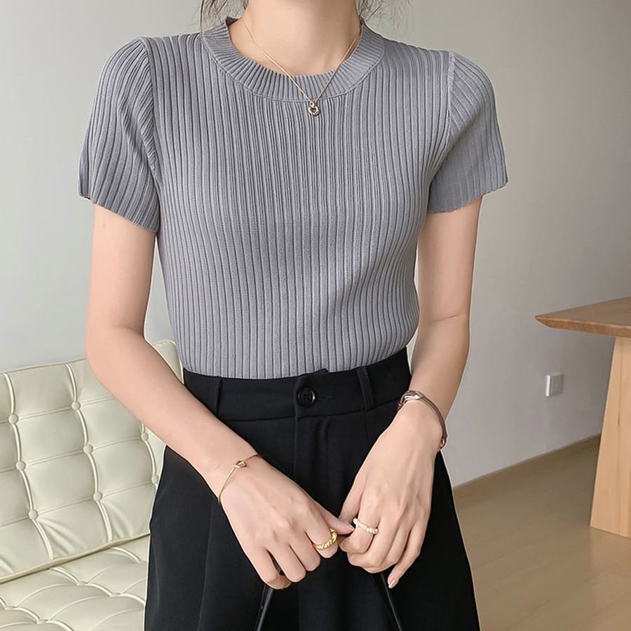 【グリーン】リブクルーネック半袖トップス【韓国ファッション】