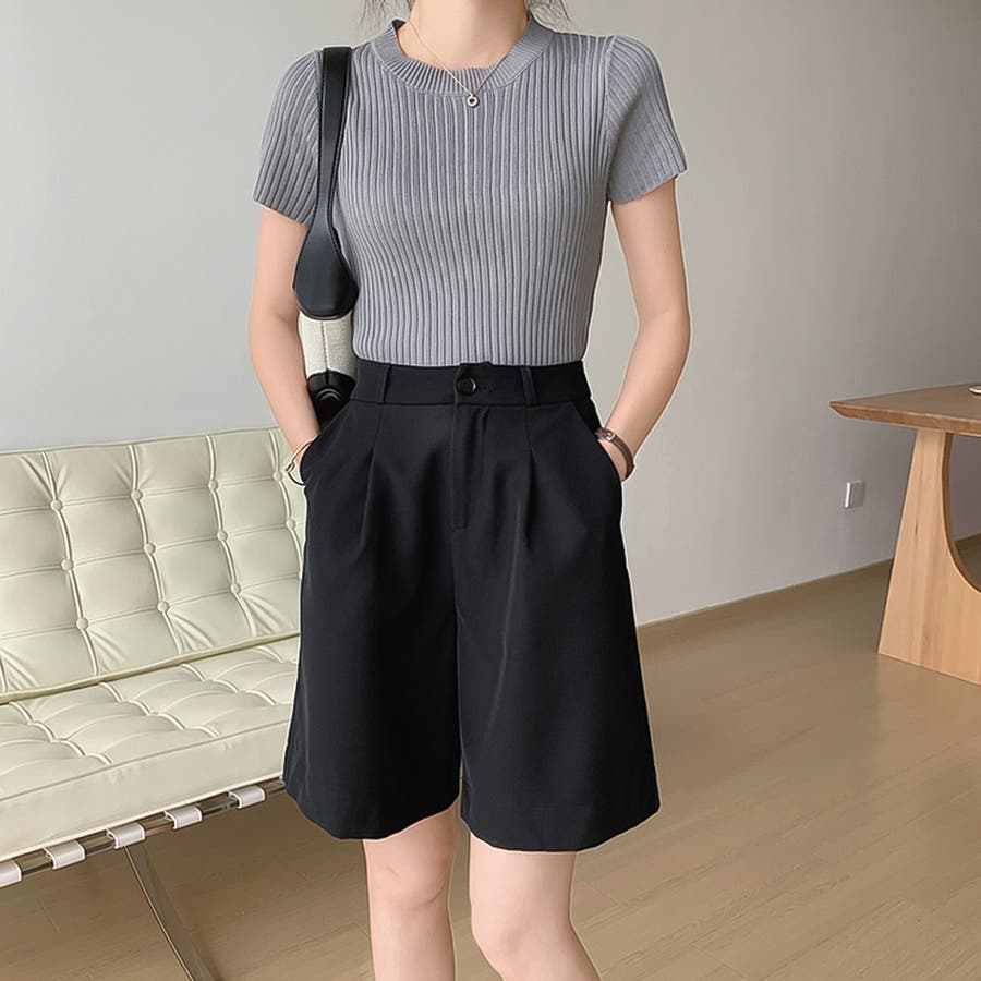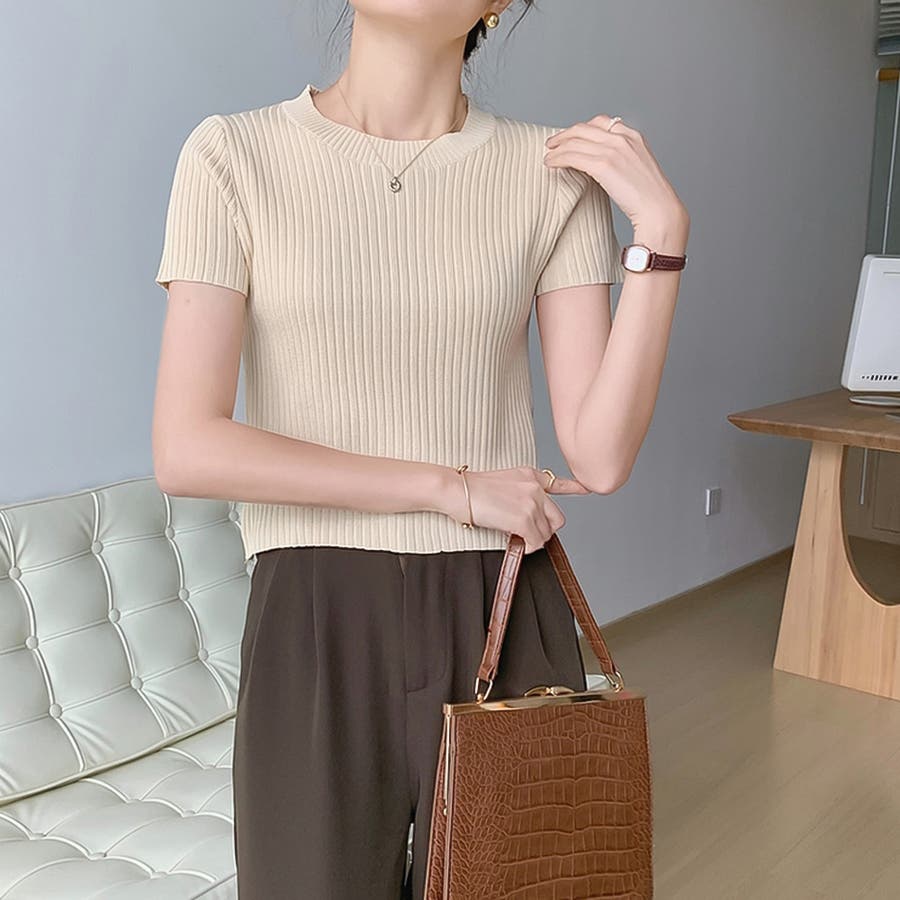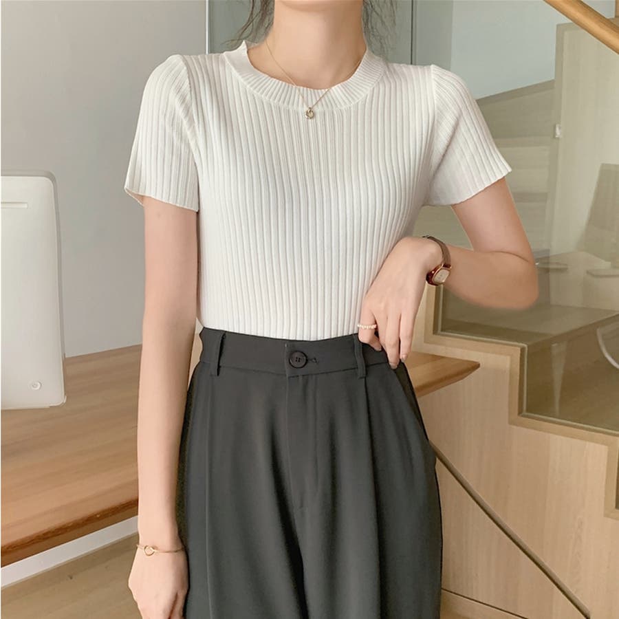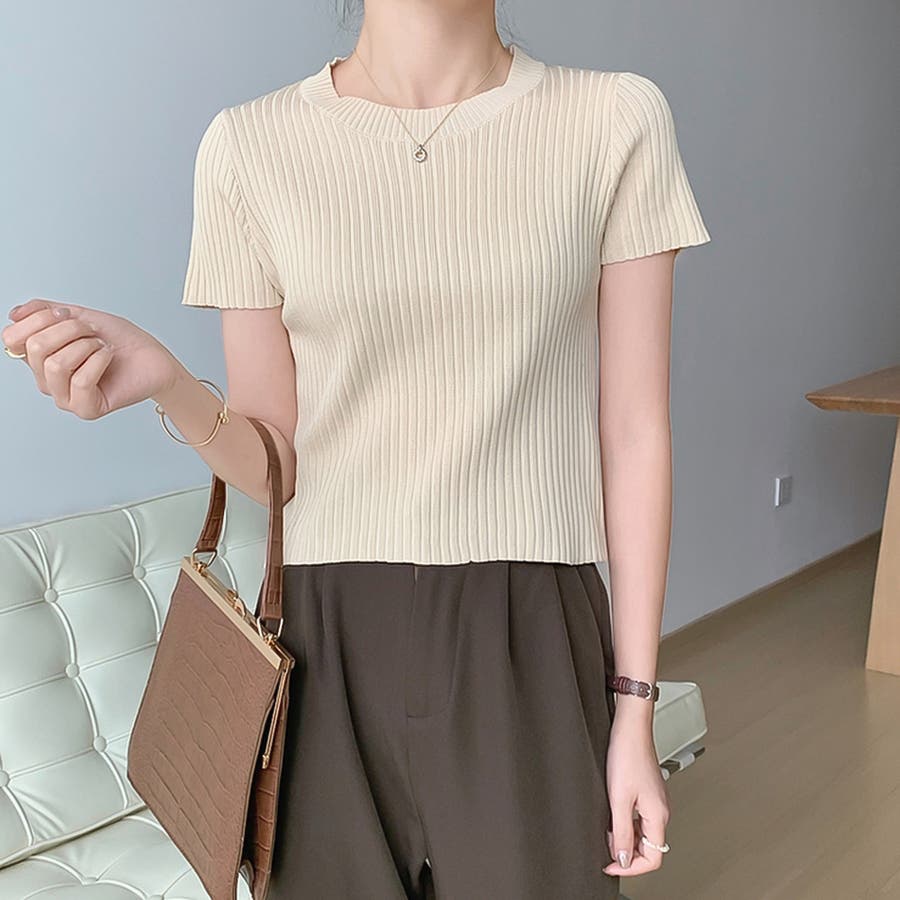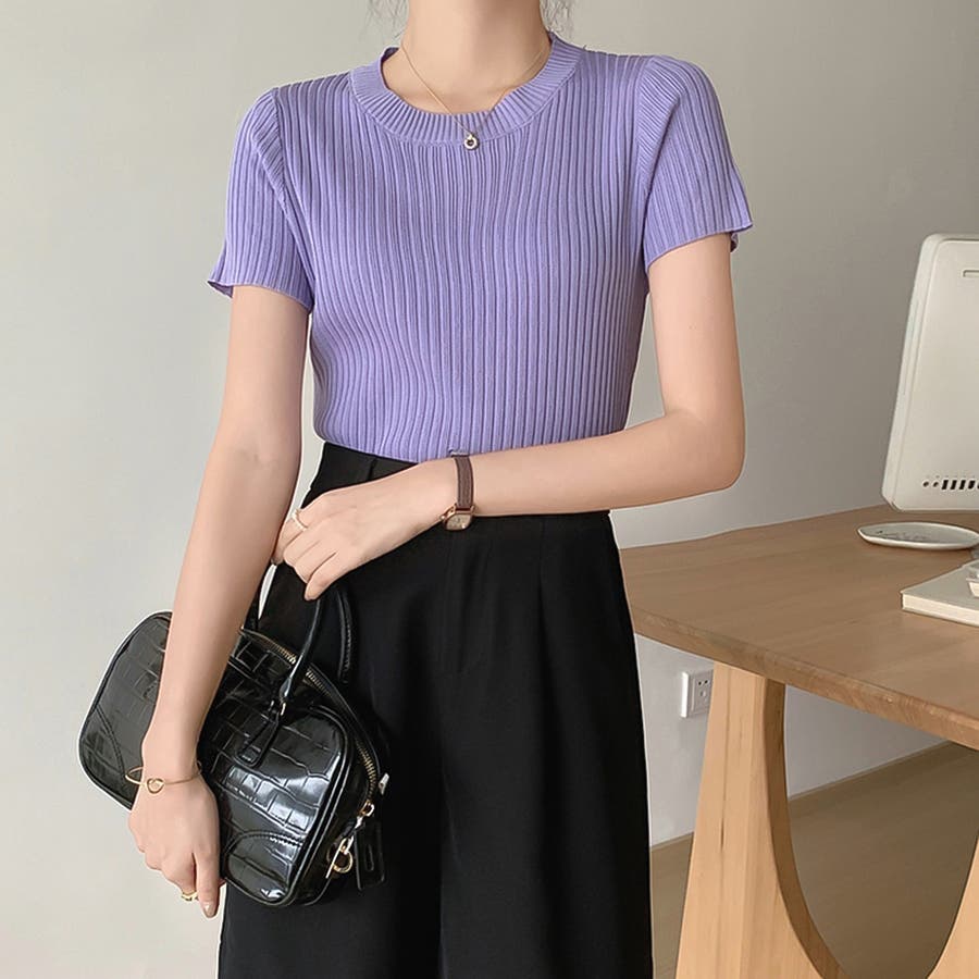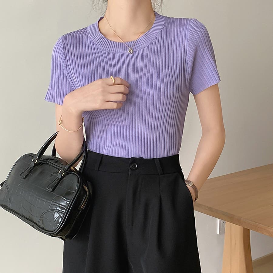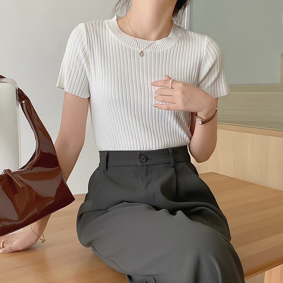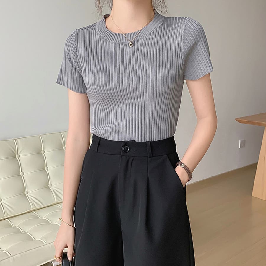 【グリーン】リブクルーネック半袖トップス【韓国ファッション】