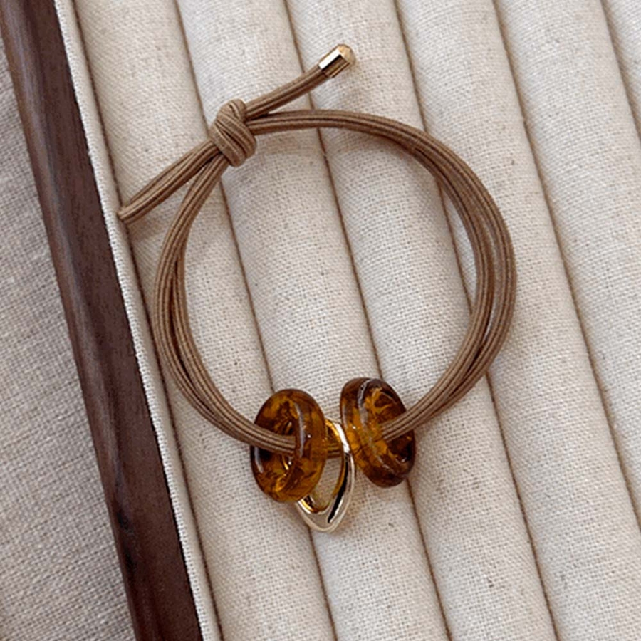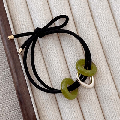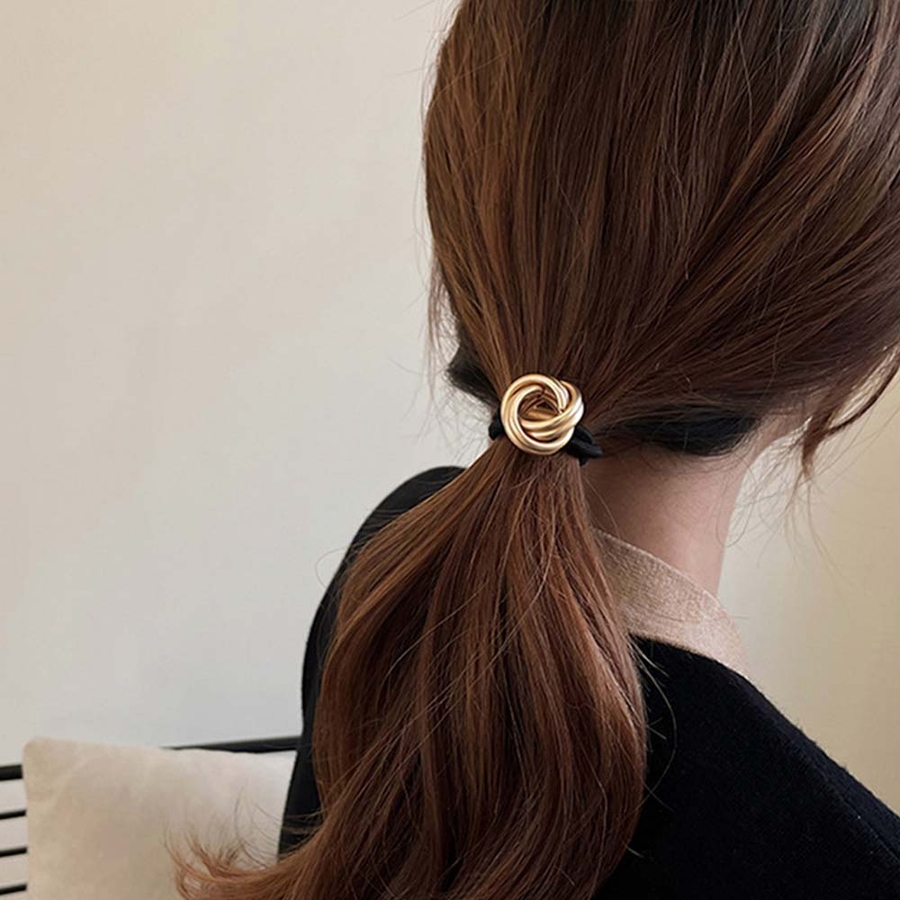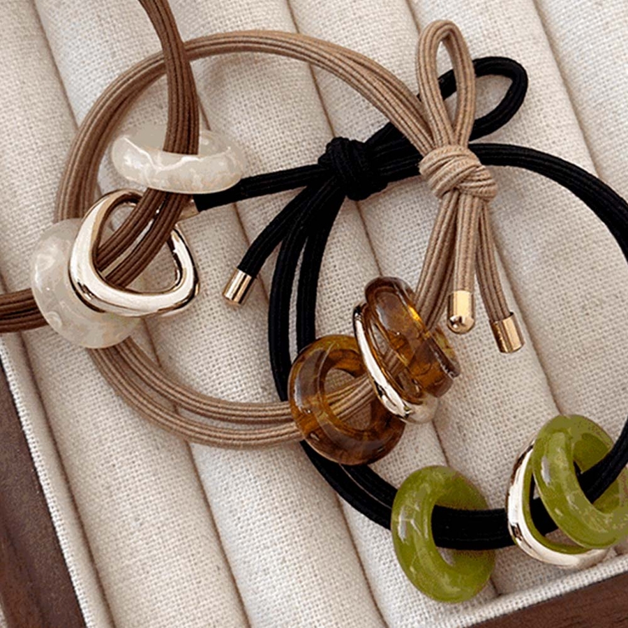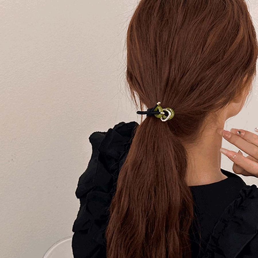 メタル素材のリングモチーフとべっこう調のリングが洗練感を添えるヘアゴム。