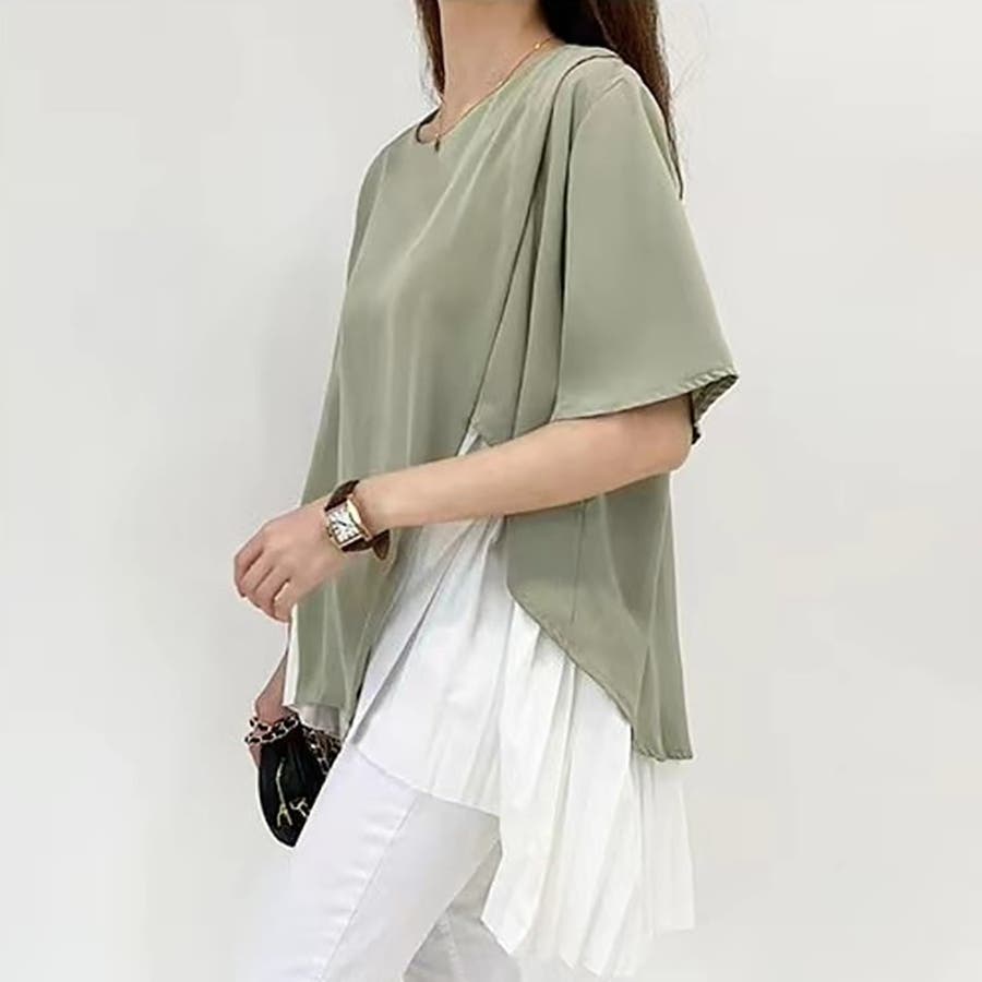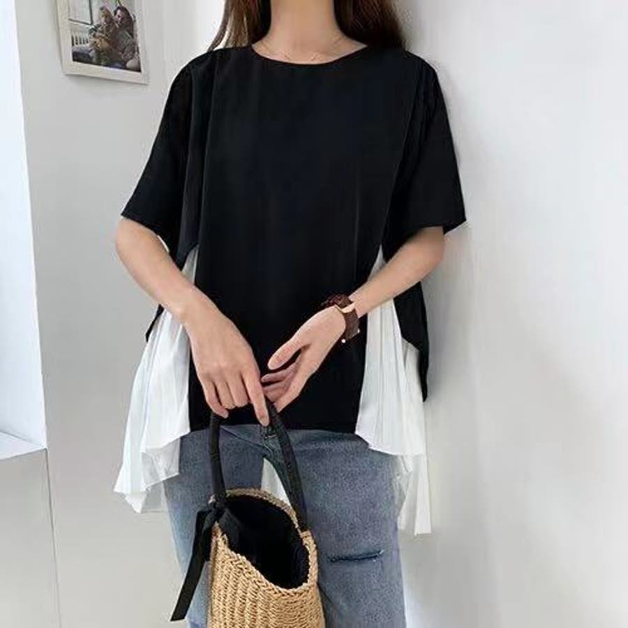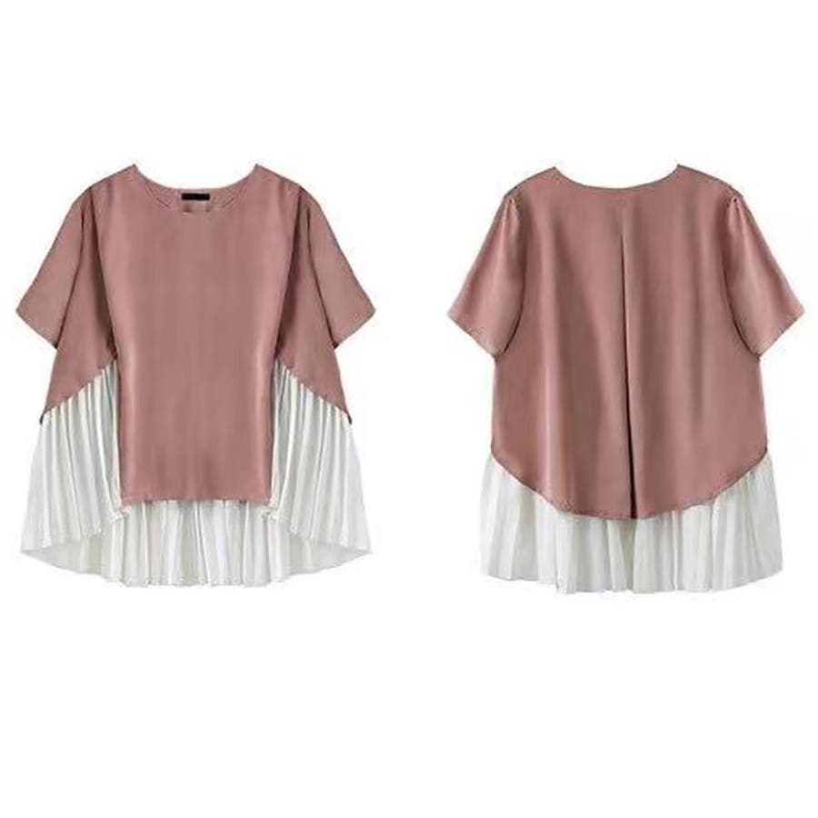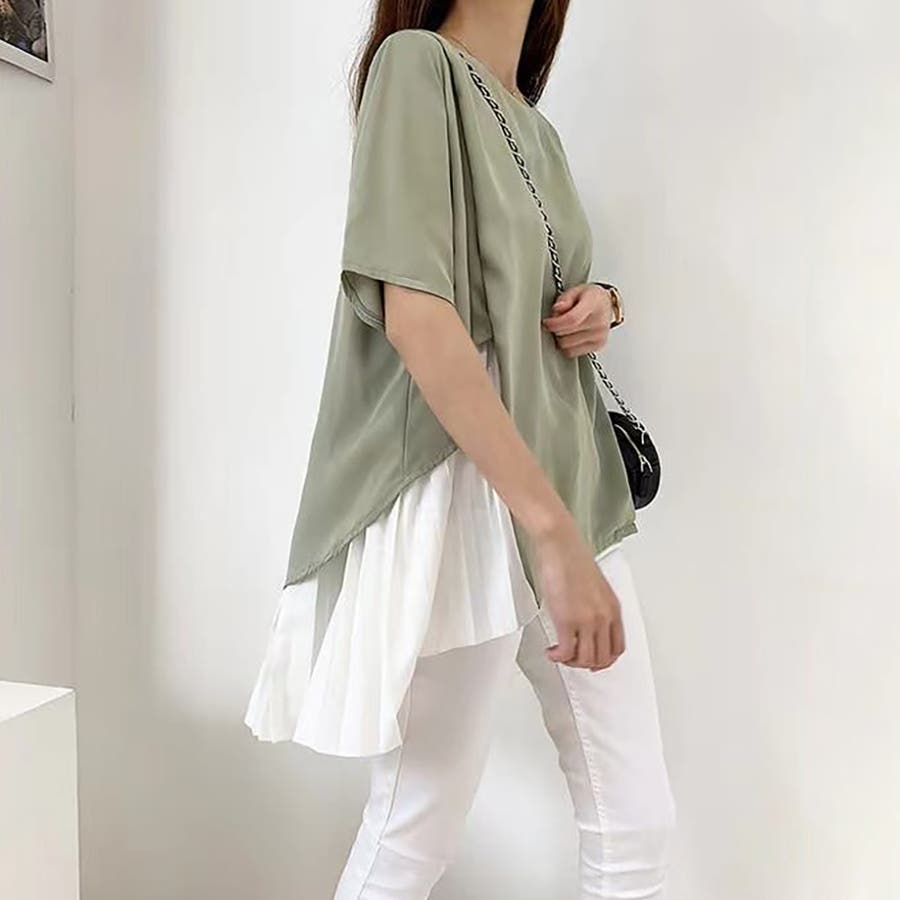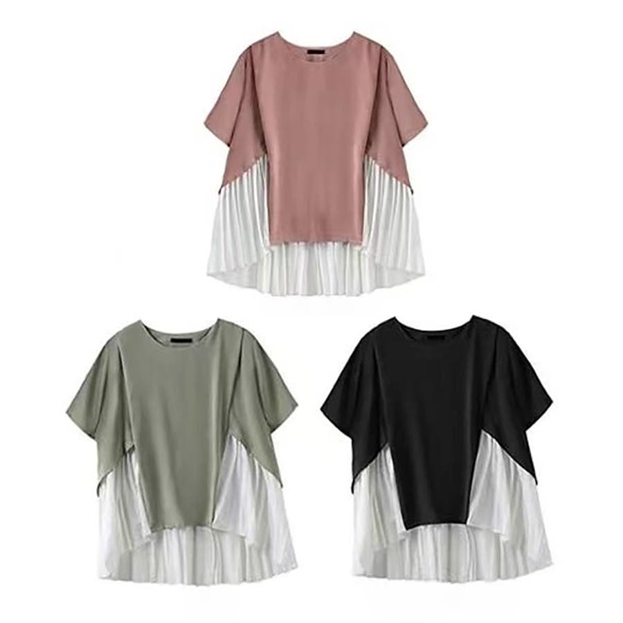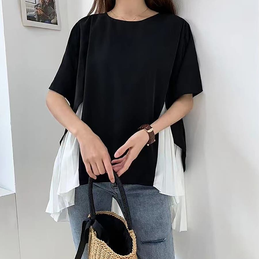 イレギュラーヘムプリーツシフォンドッキング半袖トップス【韓国ファッション】