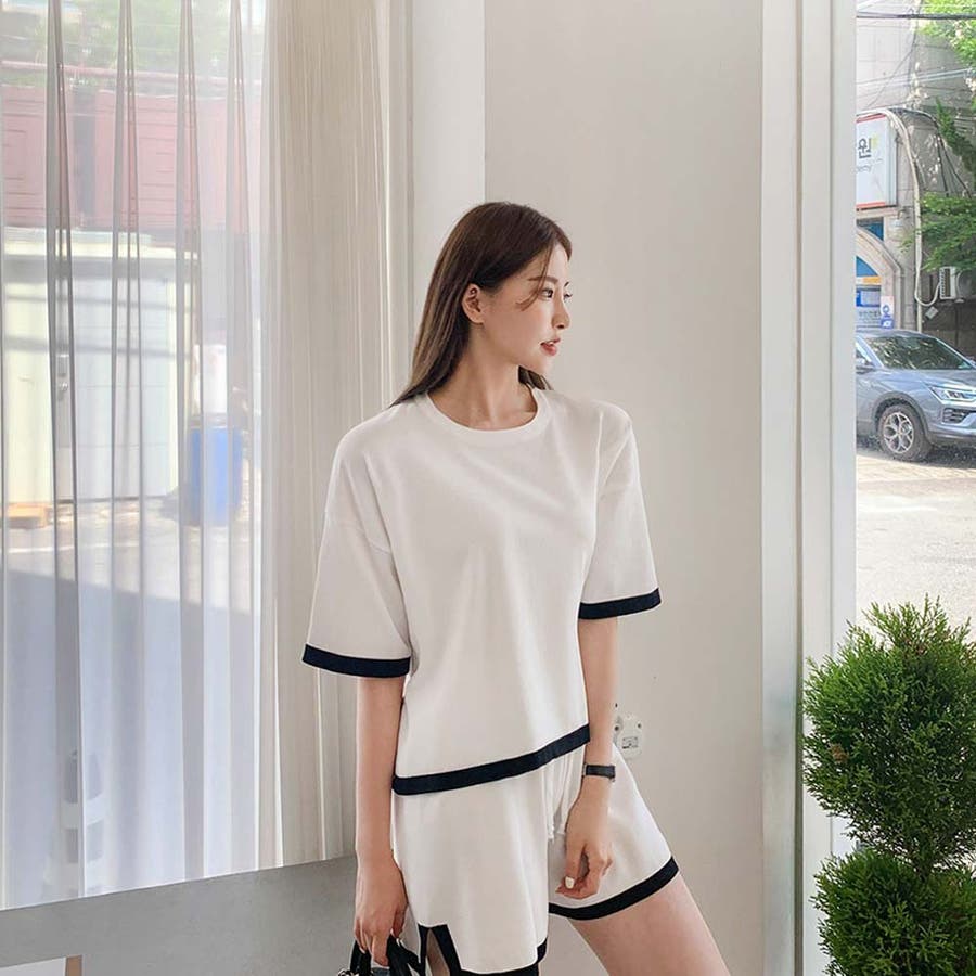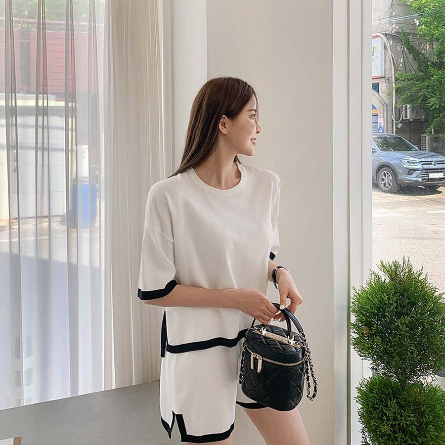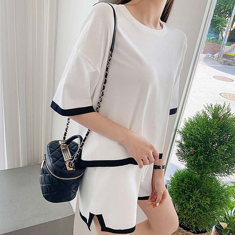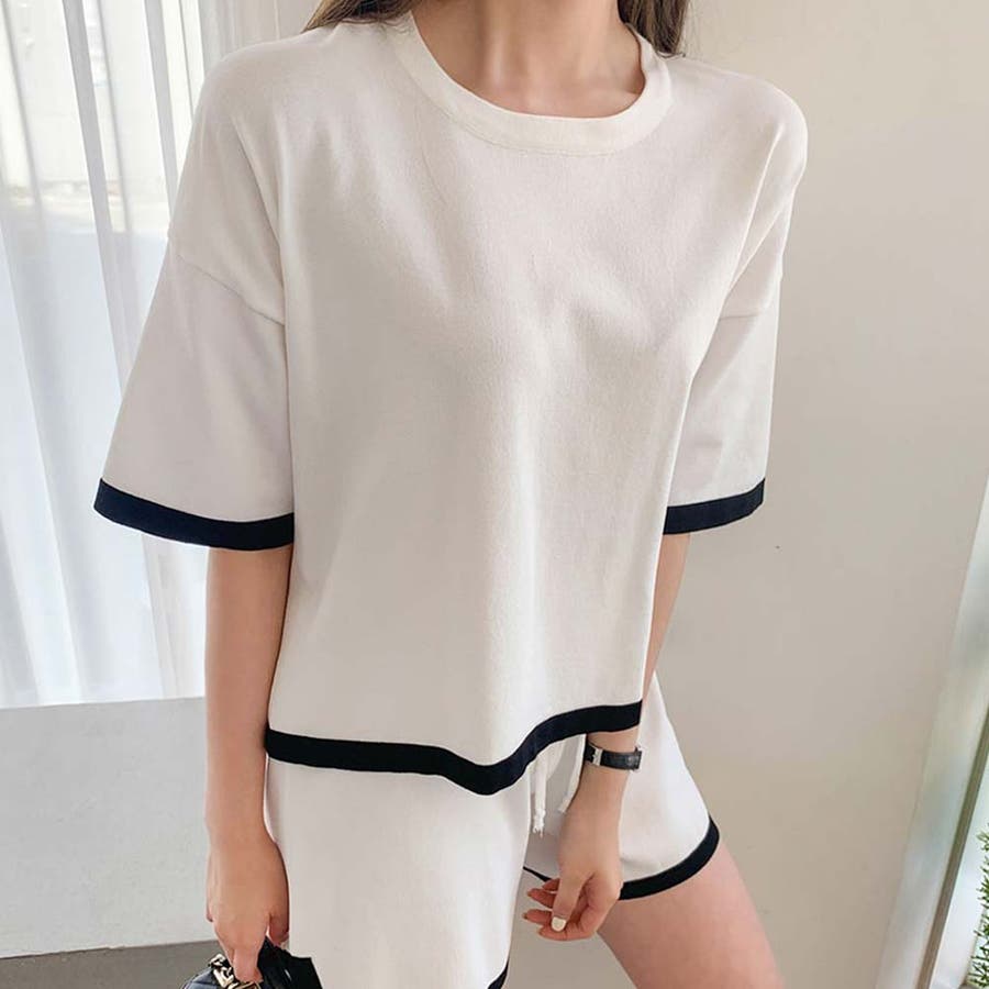 2点セット パイピングカラー半袖ニットトップス&ショートパンツセットアップ【韓国…