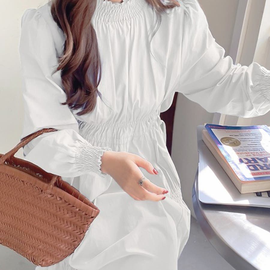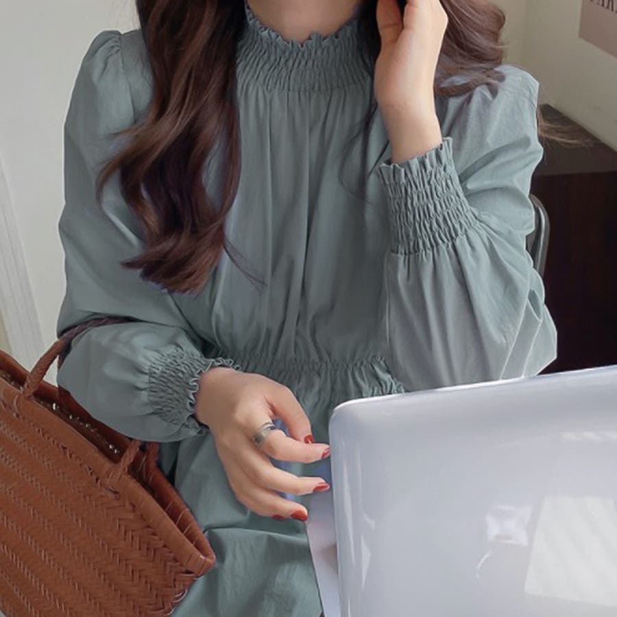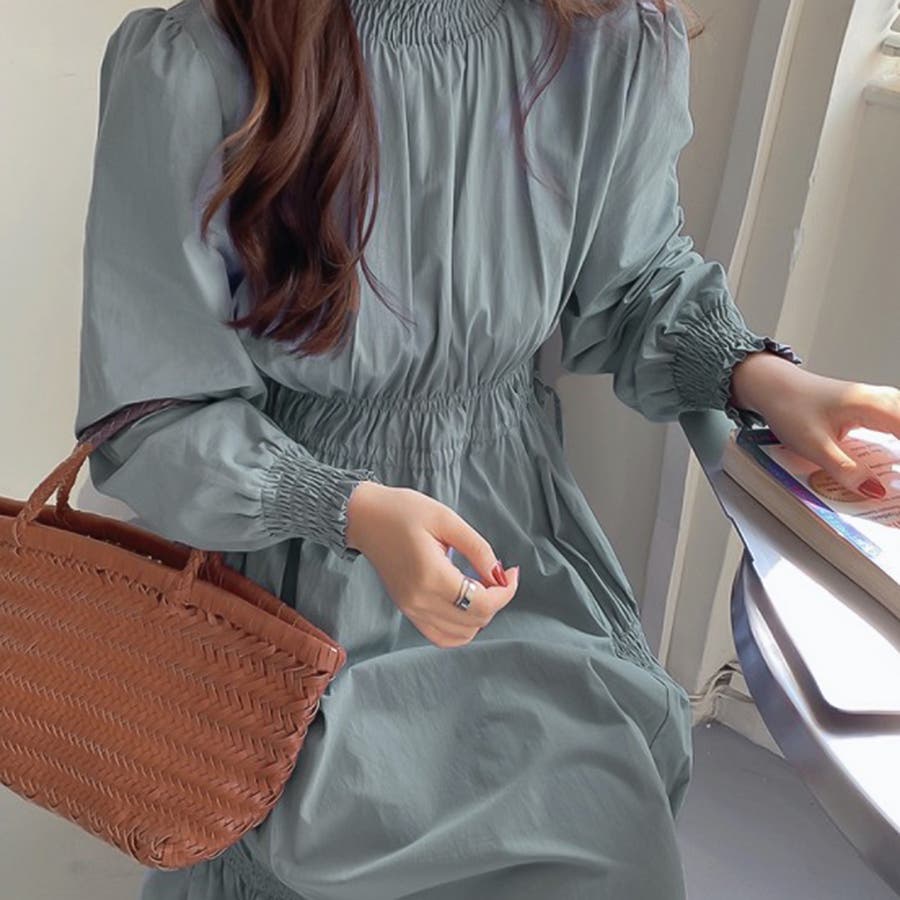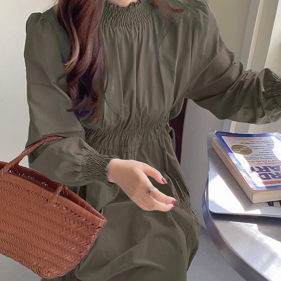 ウエスト、袖口にシャーリングを施したワンピースです。