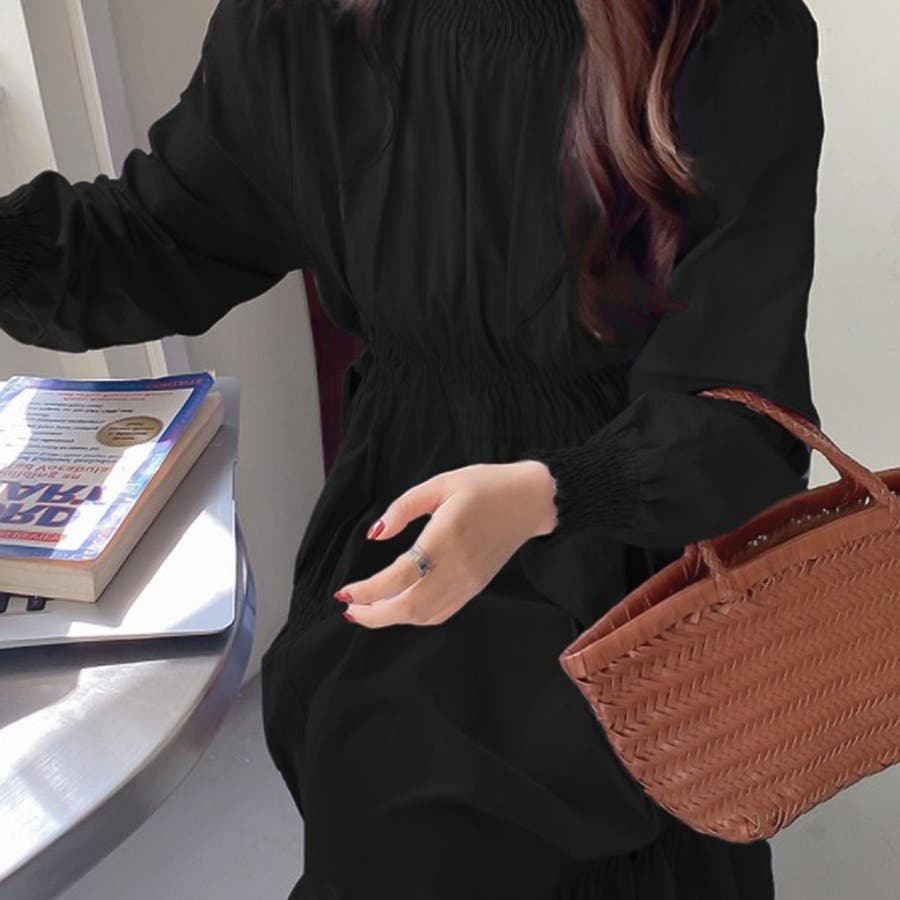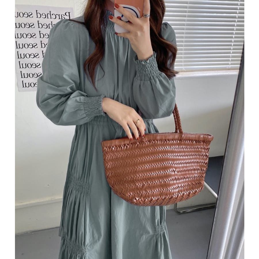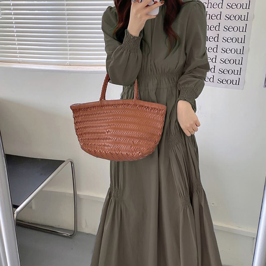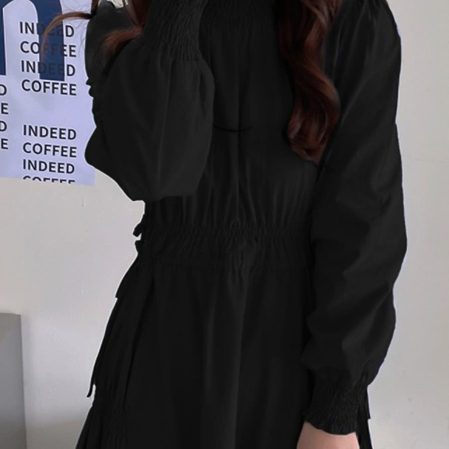 ウエスト、袖口にシャーリングを施したワンピースです。