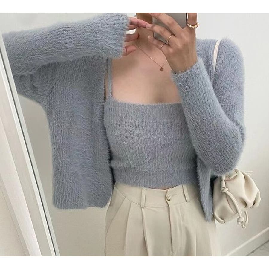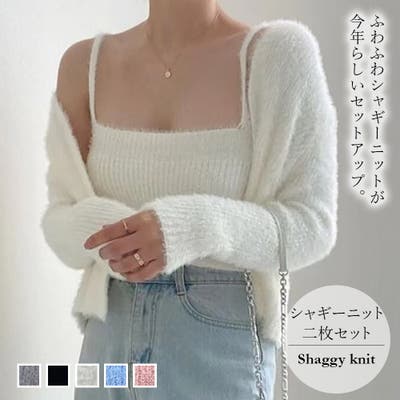 シャギーニットトップス+カーディガン 二枚セット【韓国ファッション】