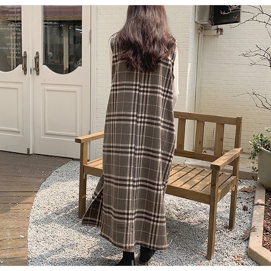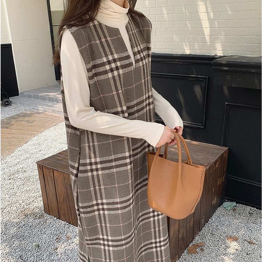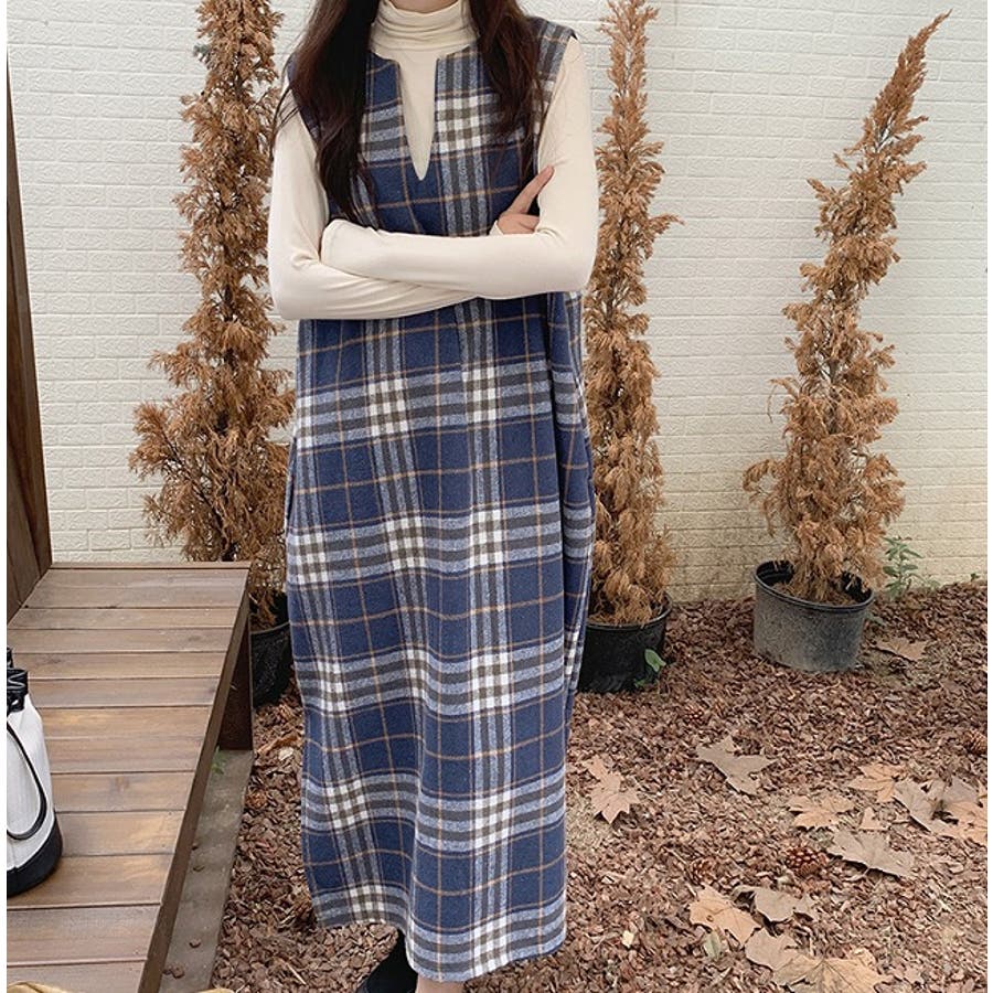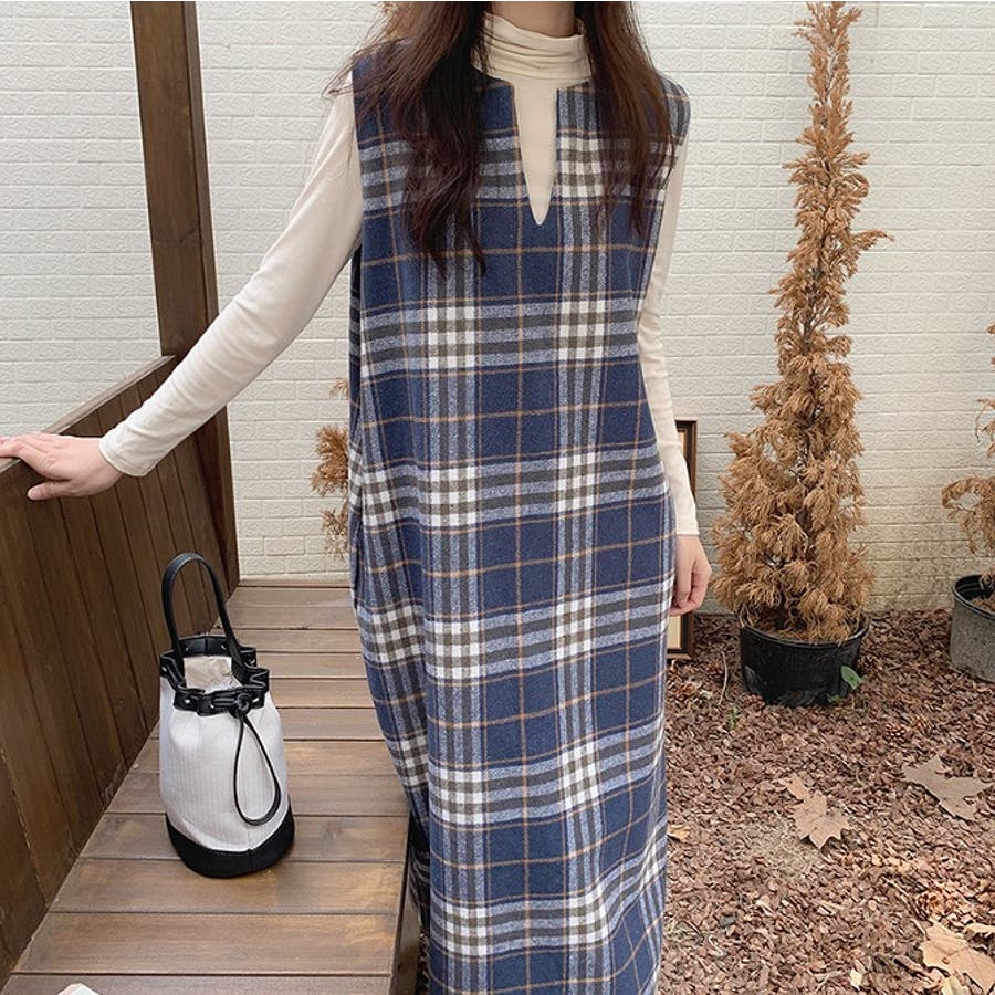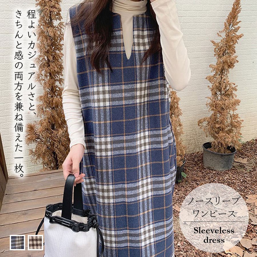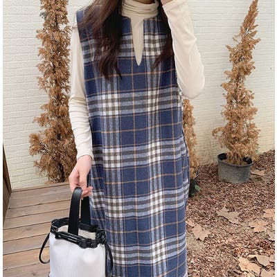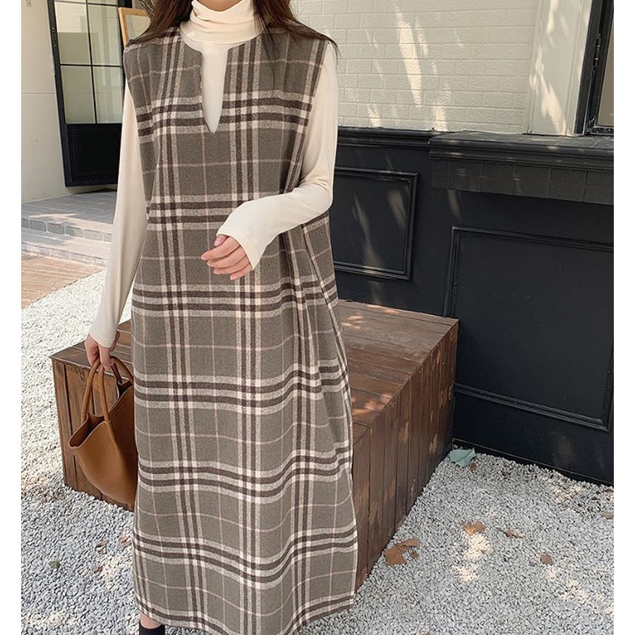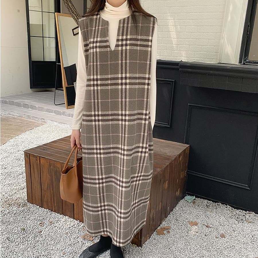 Vネックウールチェックロングノースリワンピース【韓国ファッション】