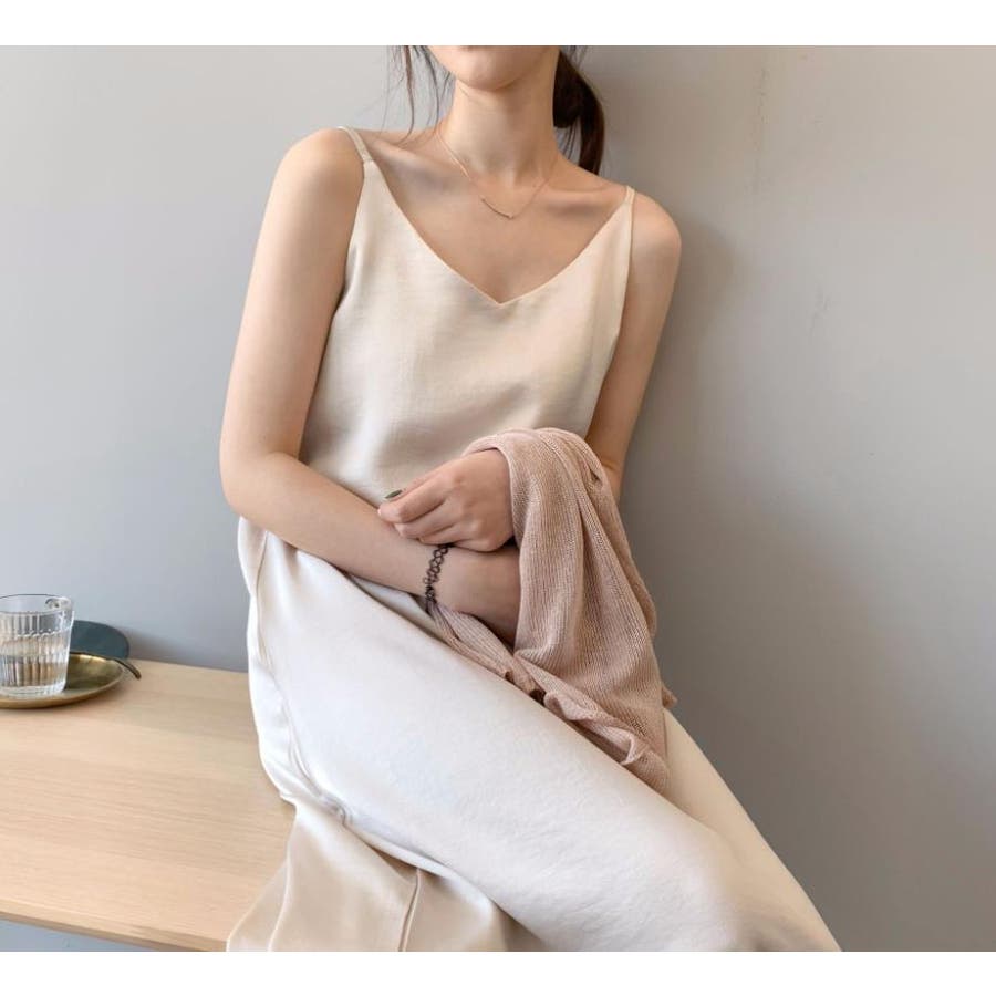 ・華奢見えする細いストラップと抜け感のあるデコルテ見せデザインのVネックがフェミニンな印象をプラス。