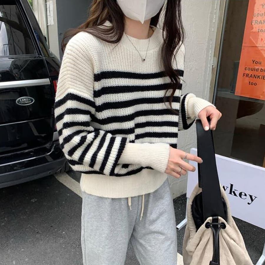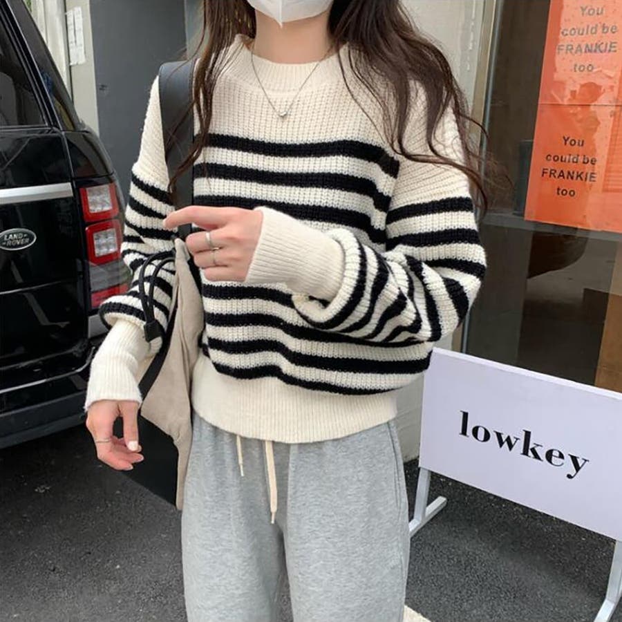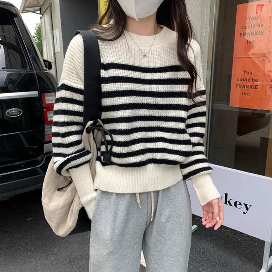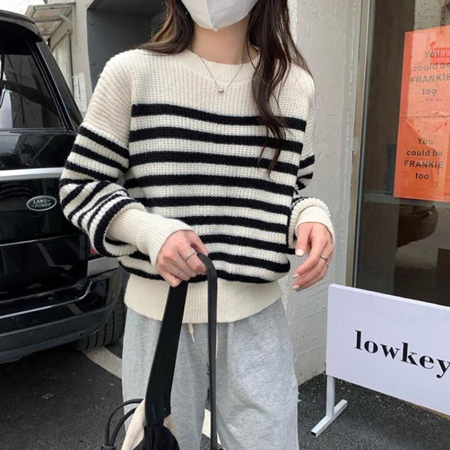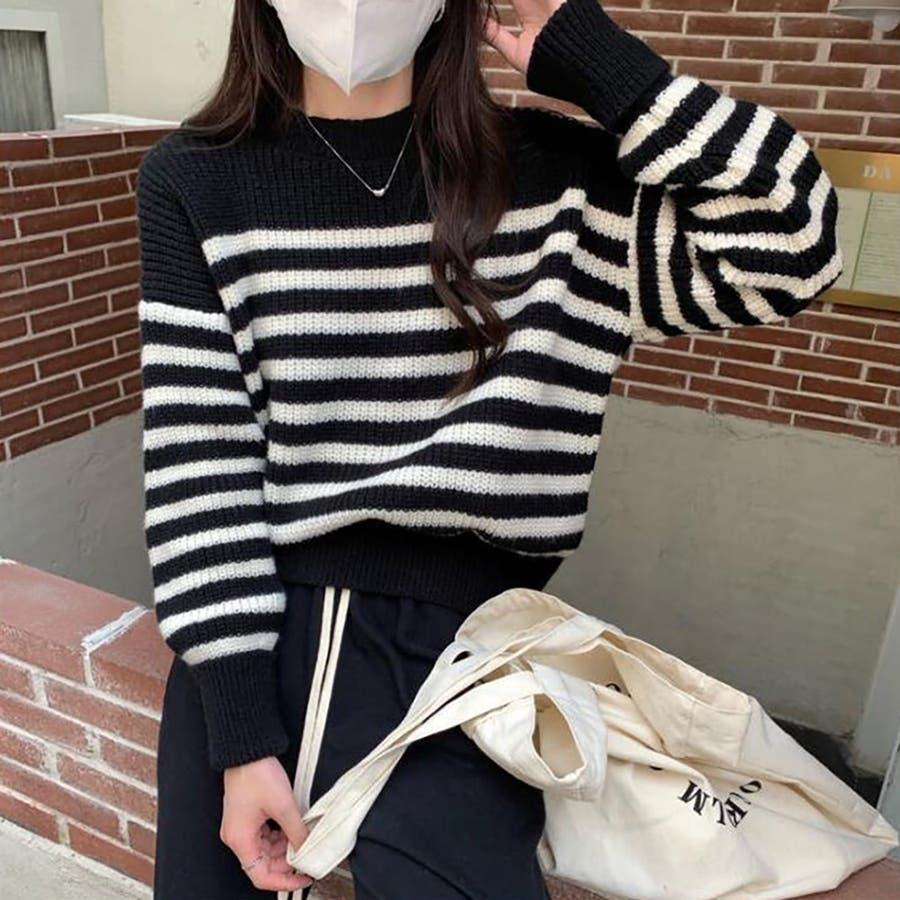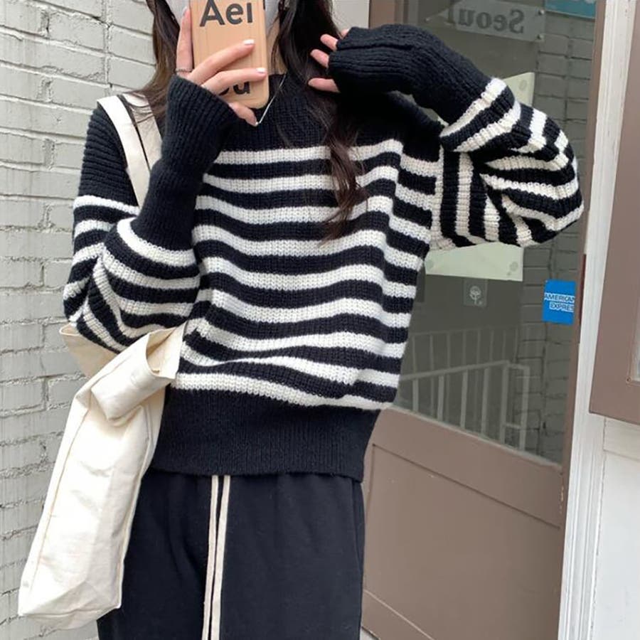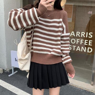 ざっくりとしたニットとボーダーでカジュアルな雰囲気。
