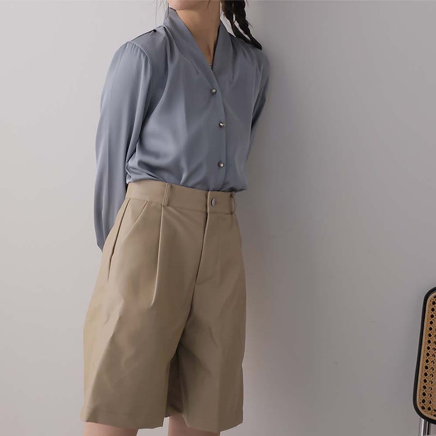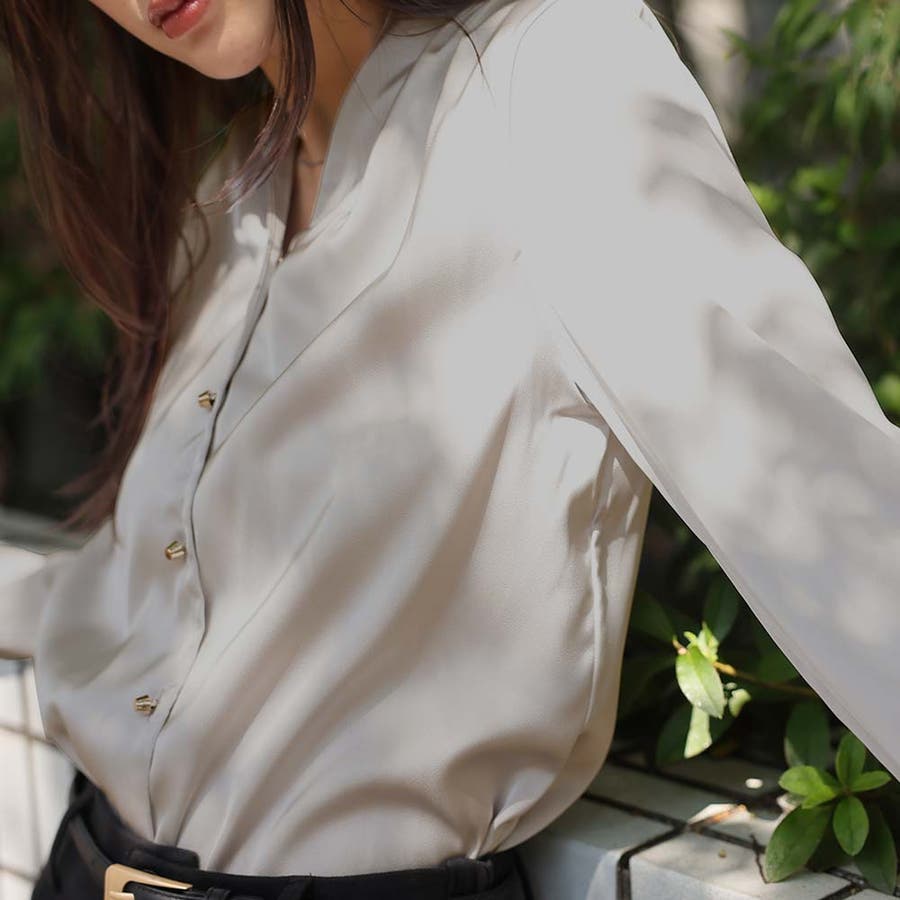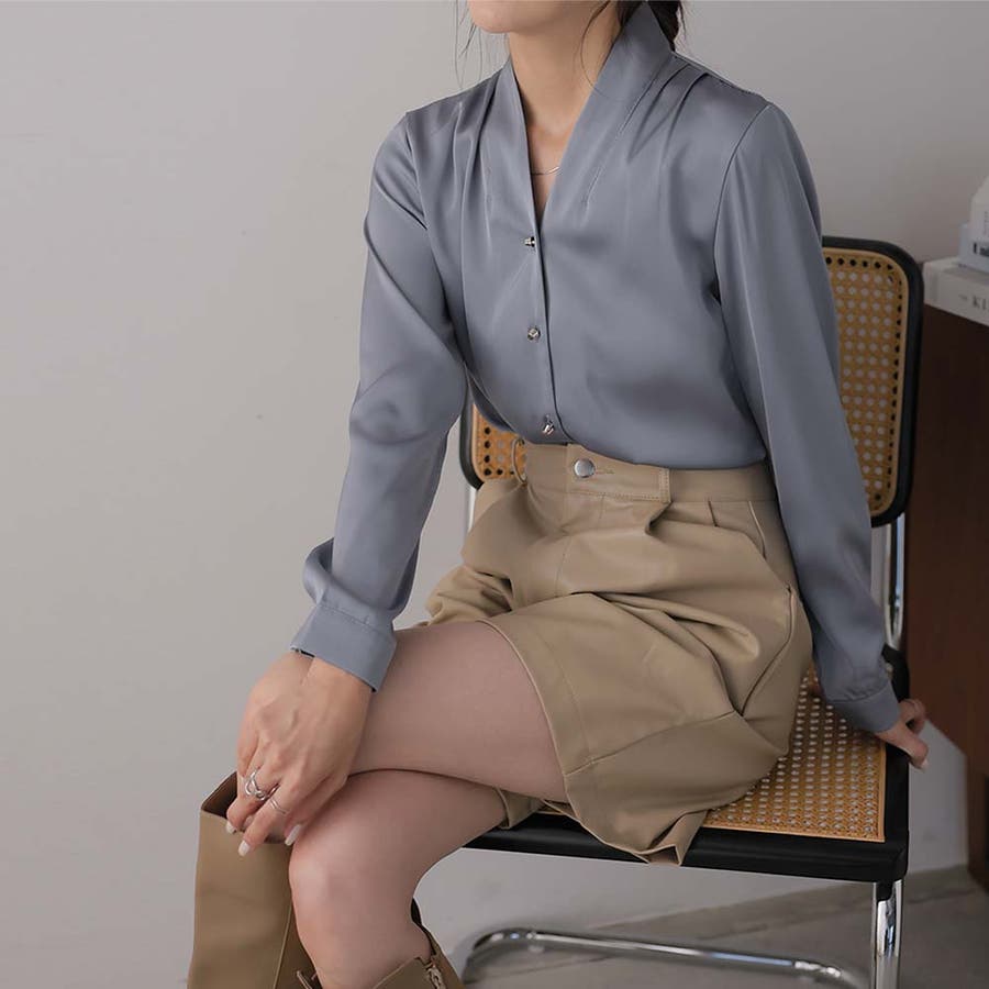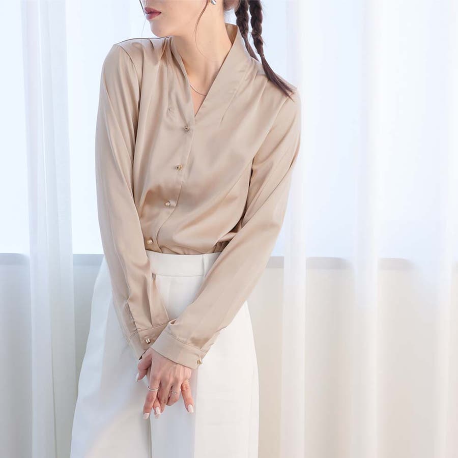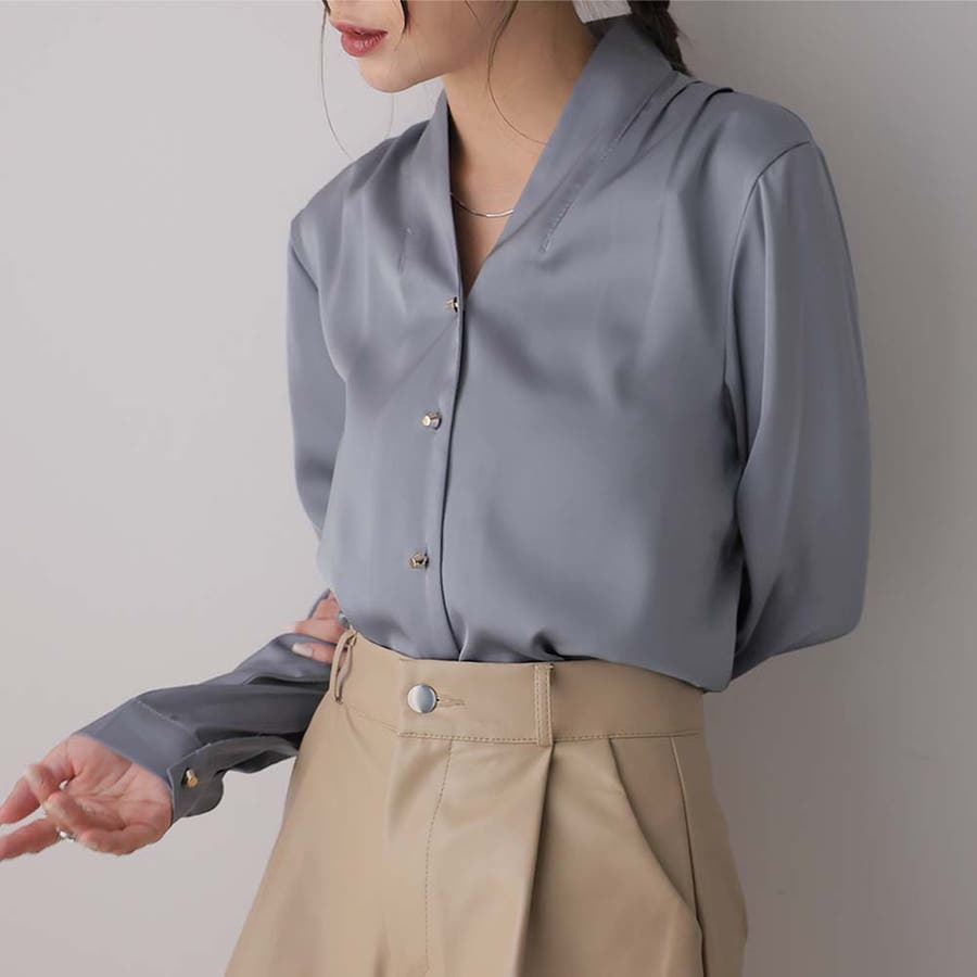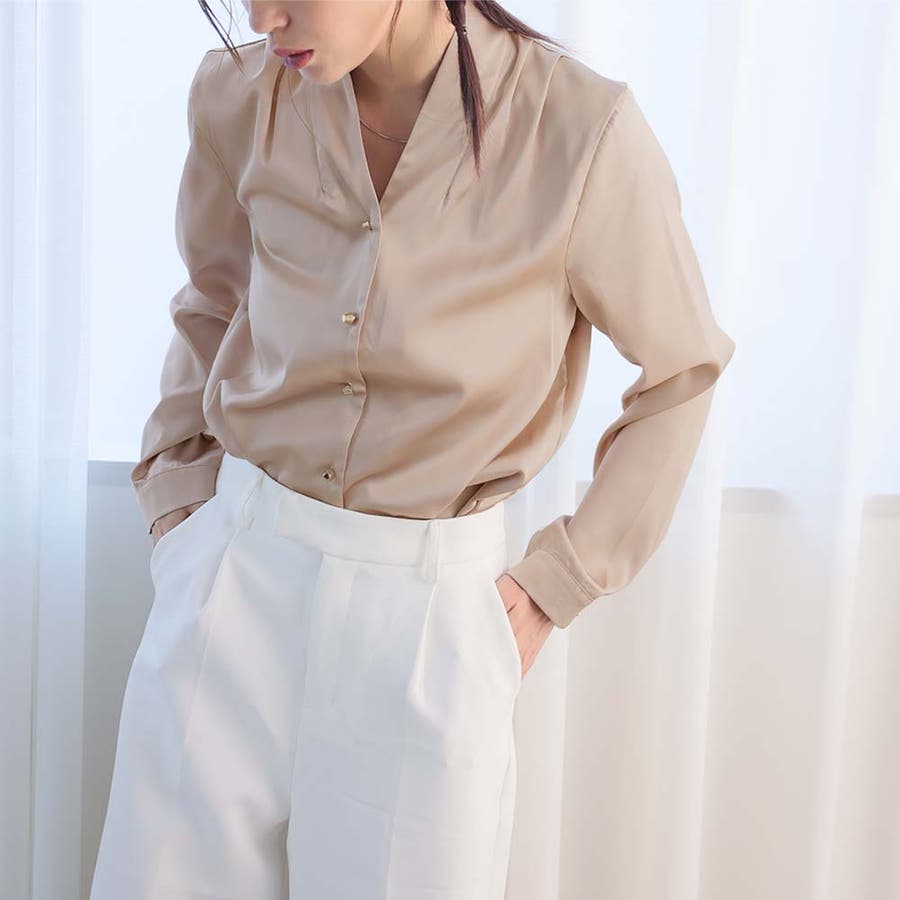 ノーカラーでスッキリとした印象のVネックブラウス。