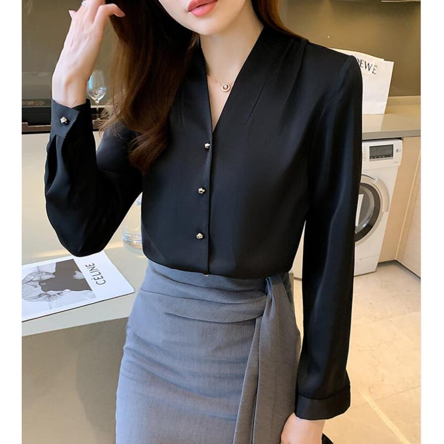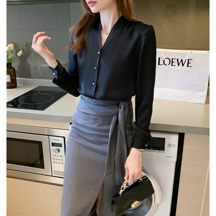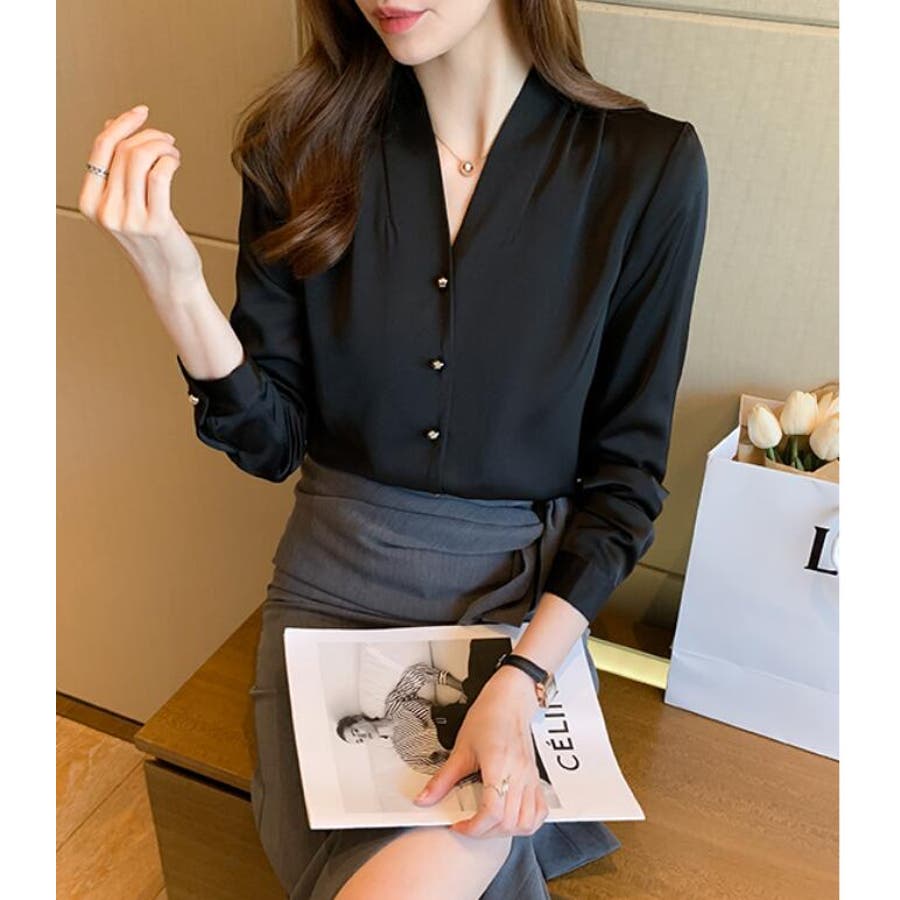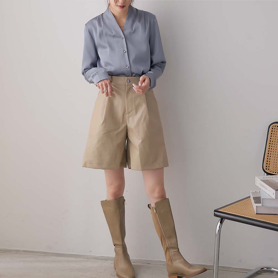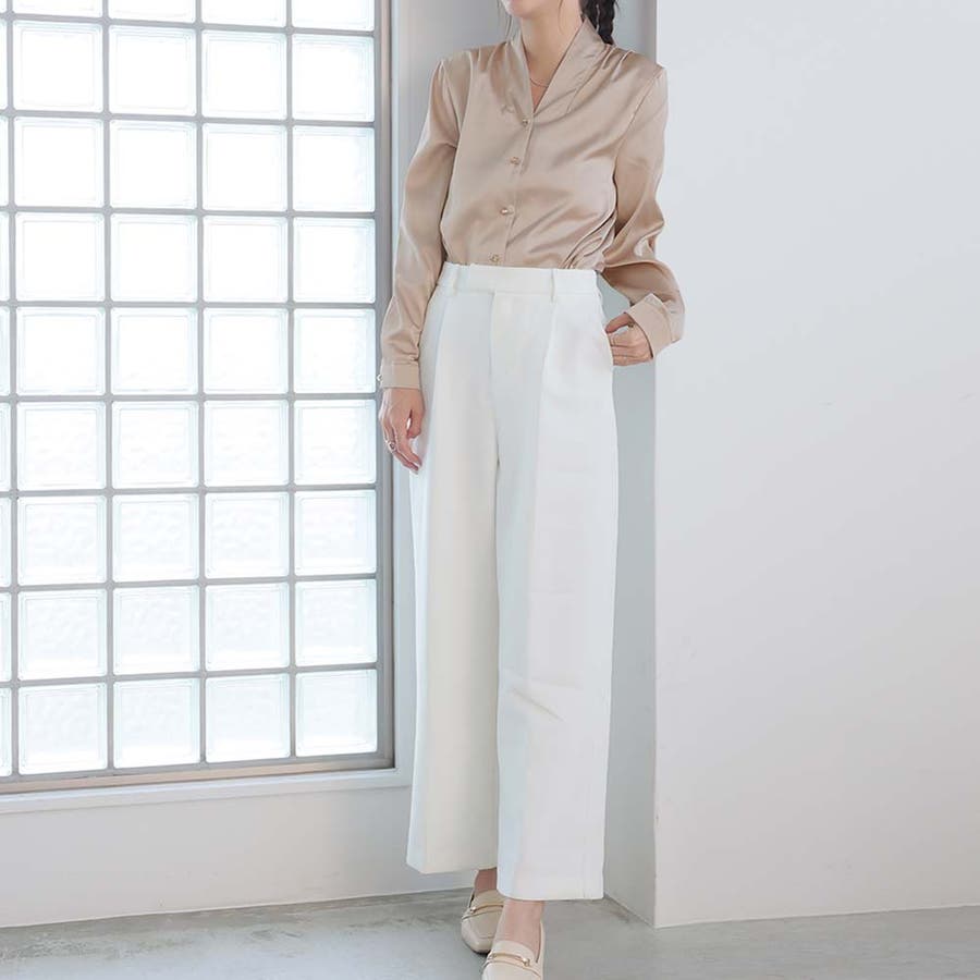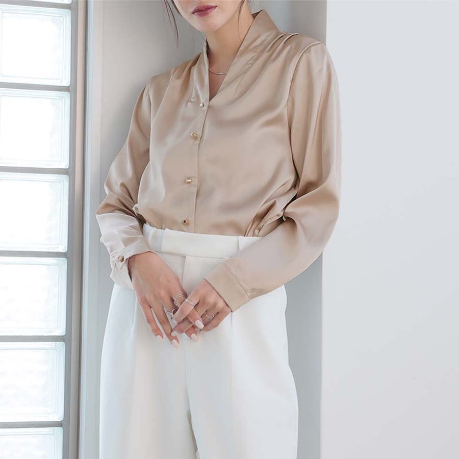 ノーカラーでスッキリとした印象のVネックブラウス。