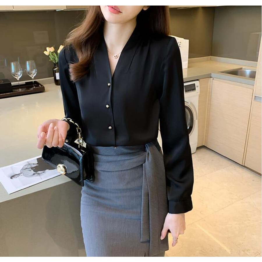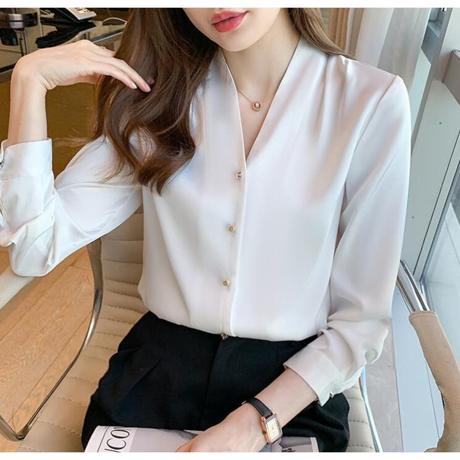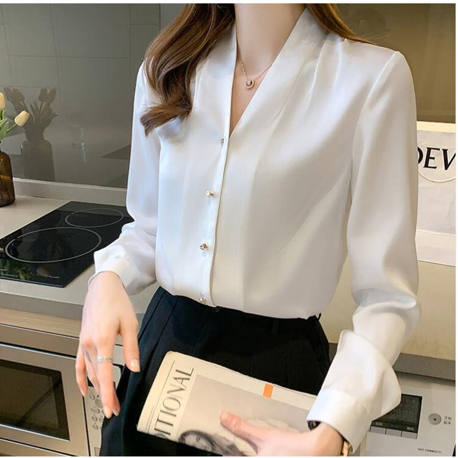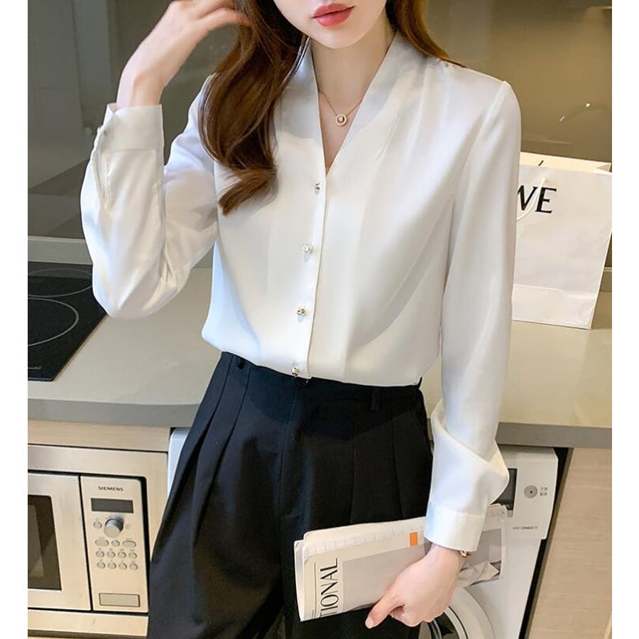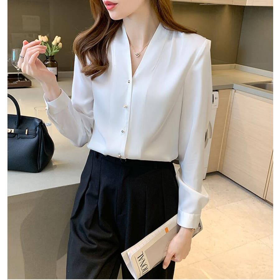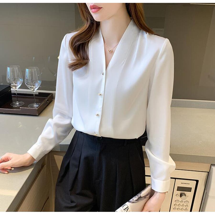 ノーカラーでスッキリとした印象のVネックブラウス。