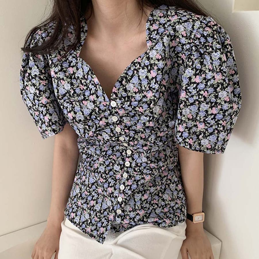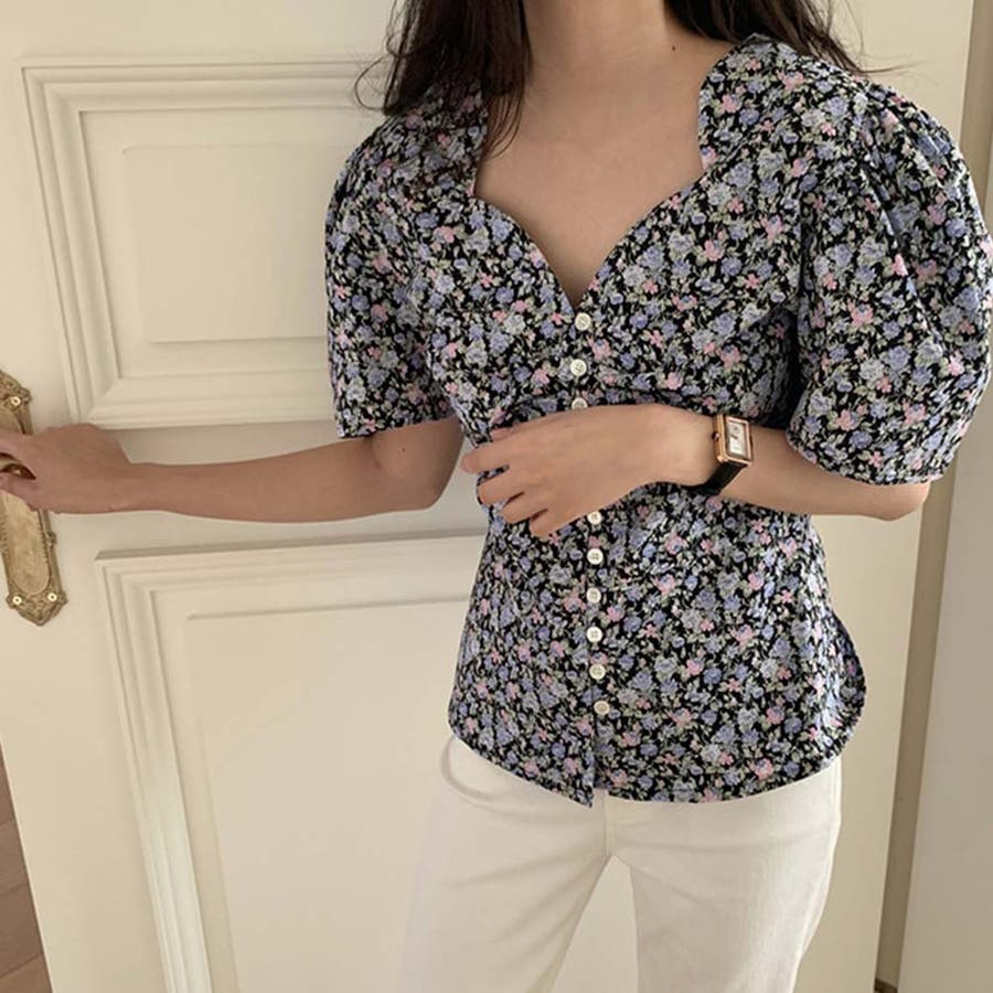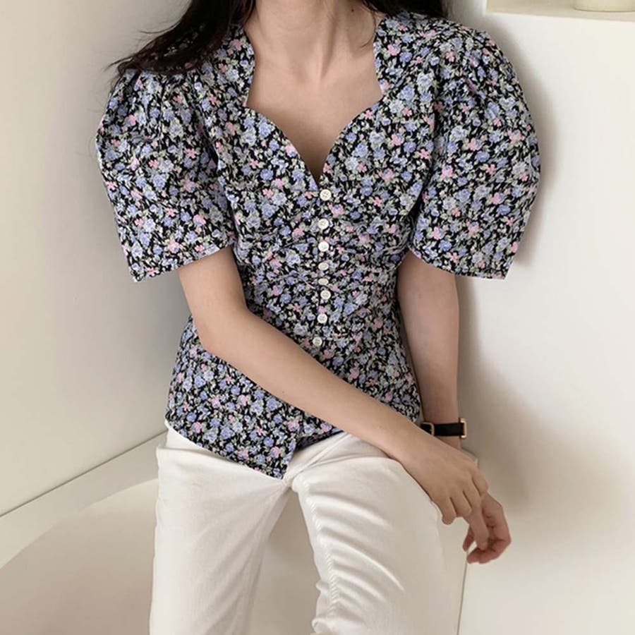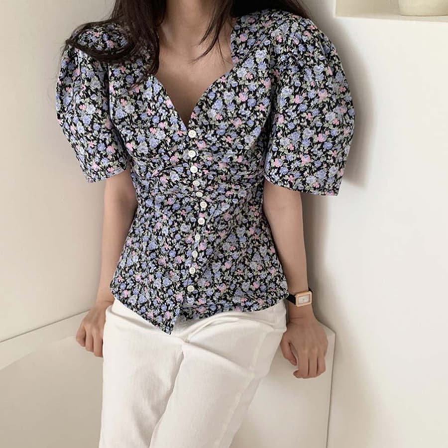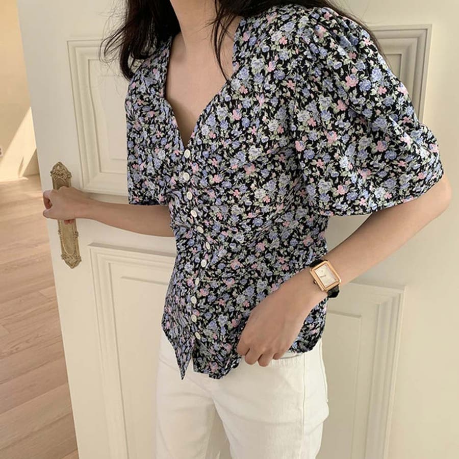 Vネックボリュームパフスリーブレトロ小花柄半袖ブラウスシャツ