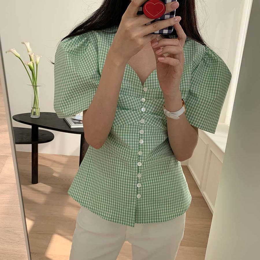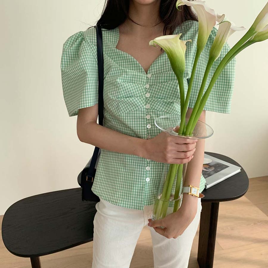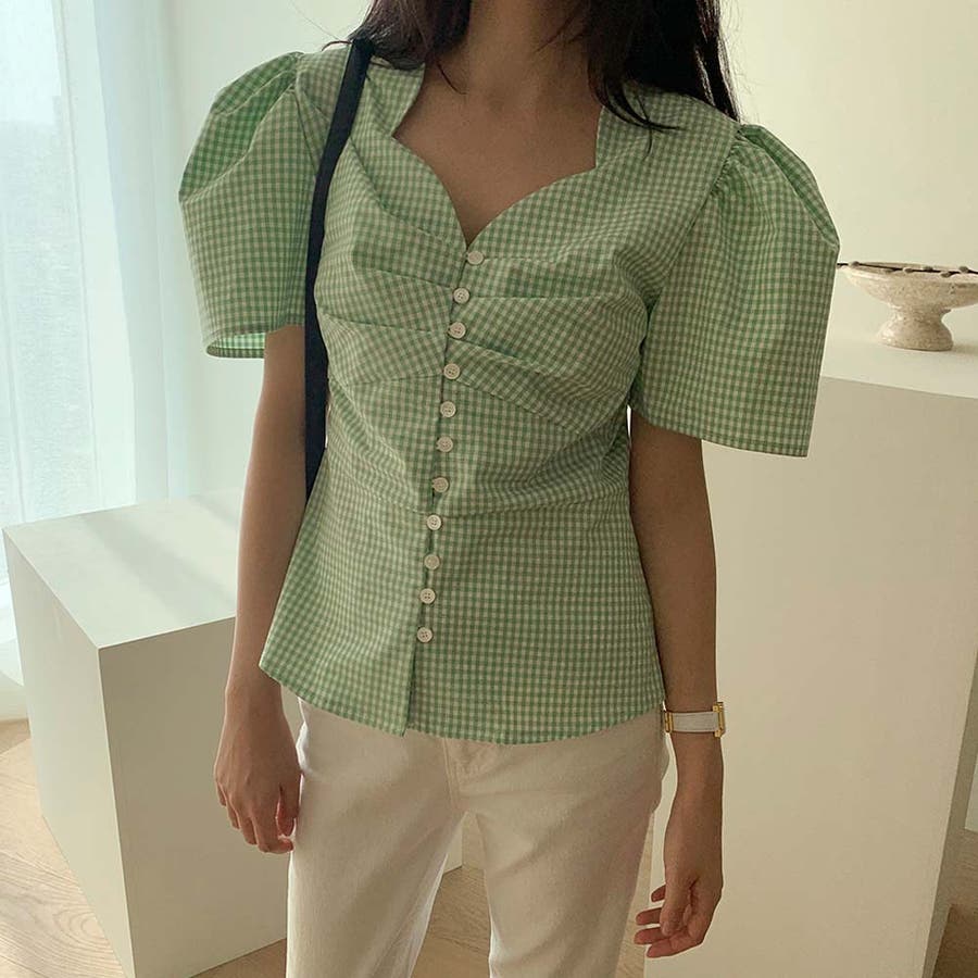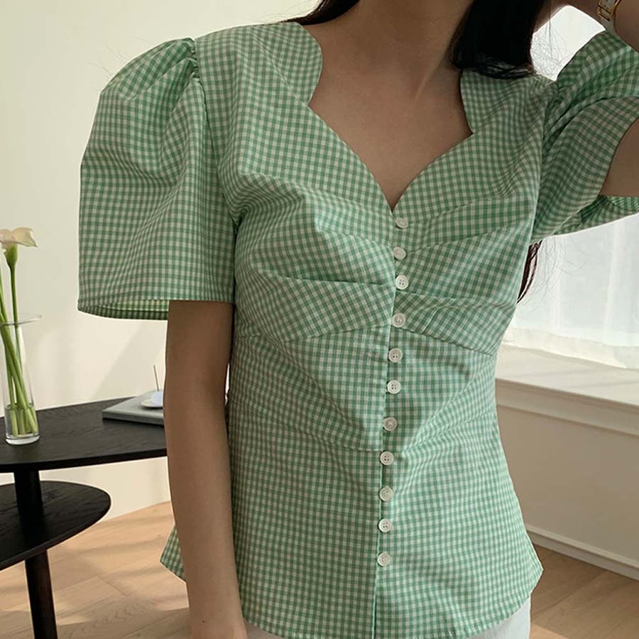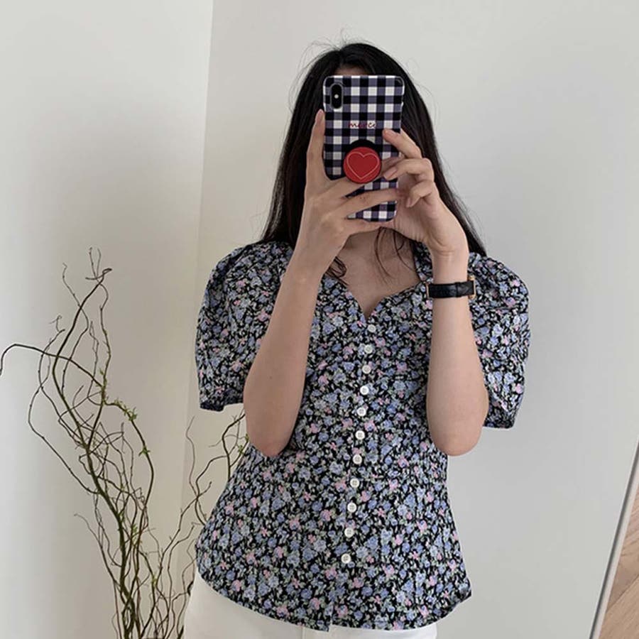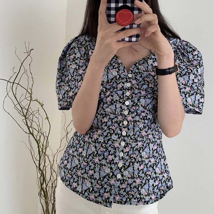 Vネックボリュームパフスリーブレトロ小花柄半袖ブラウスシャツ