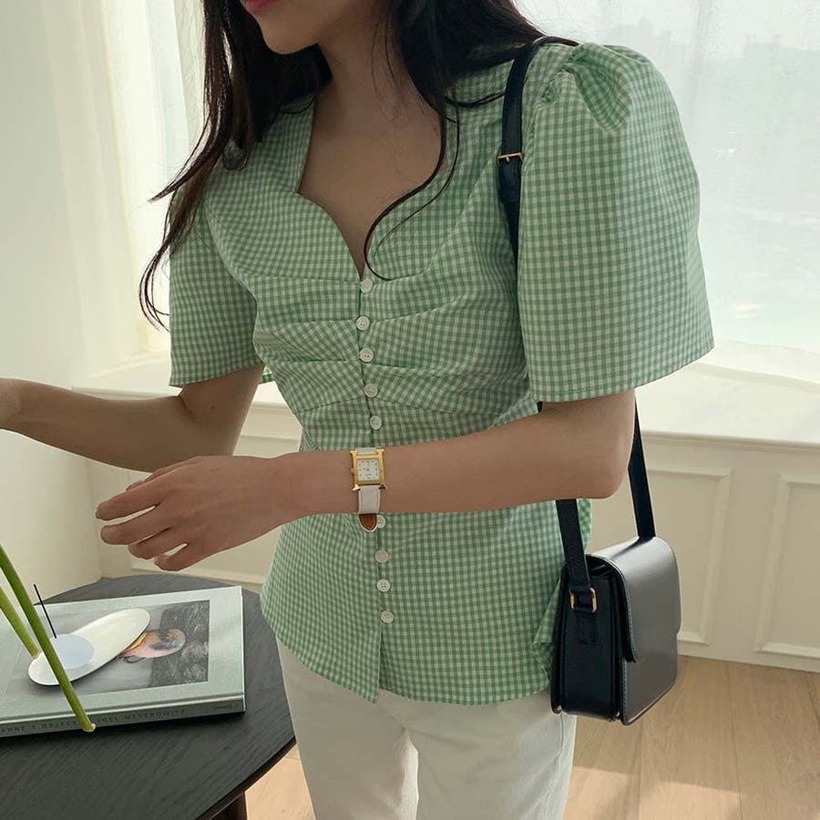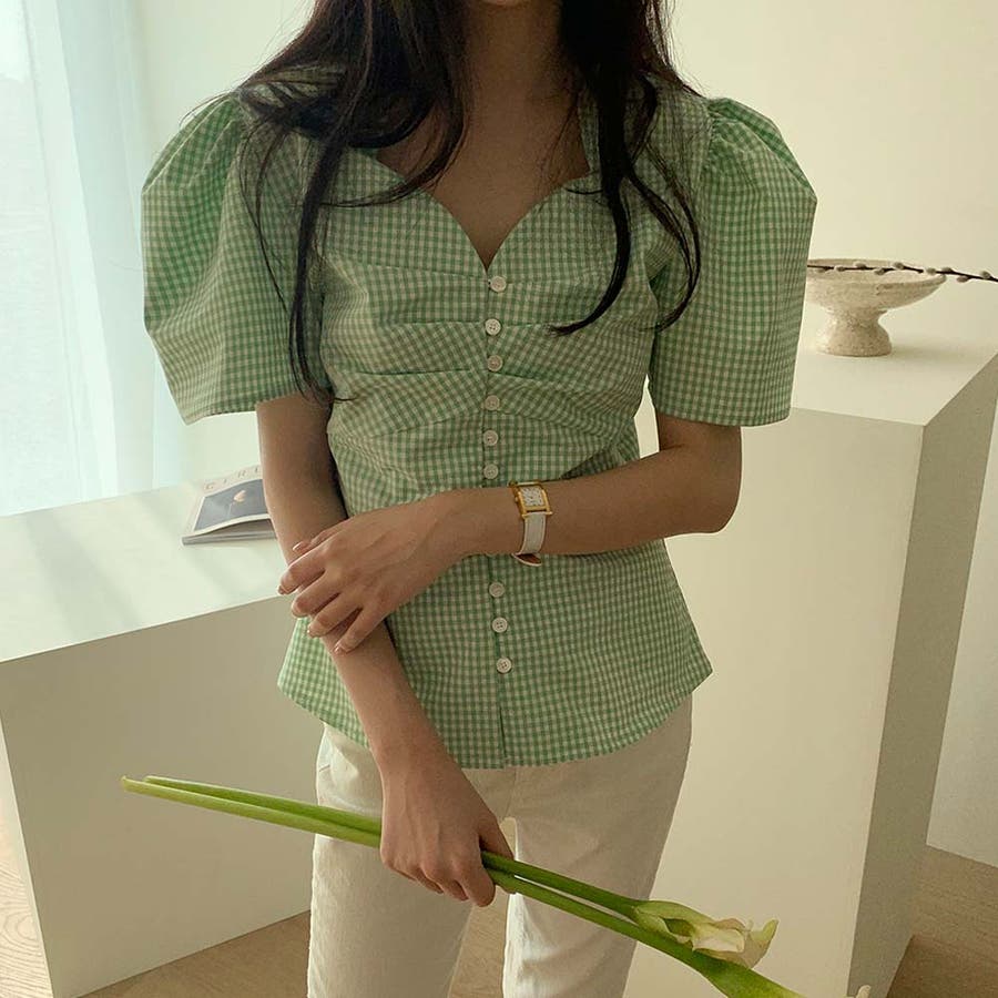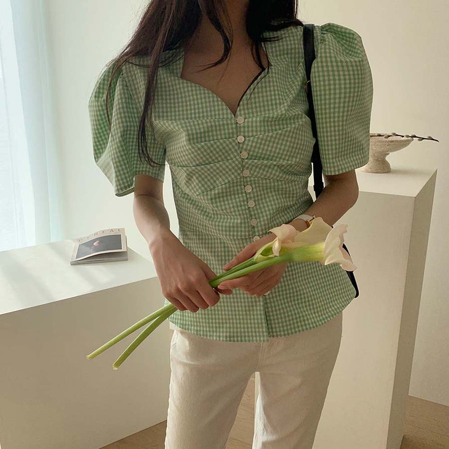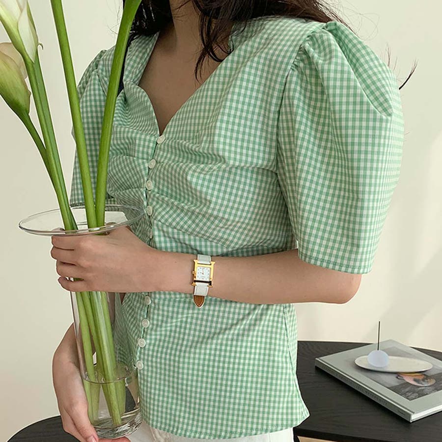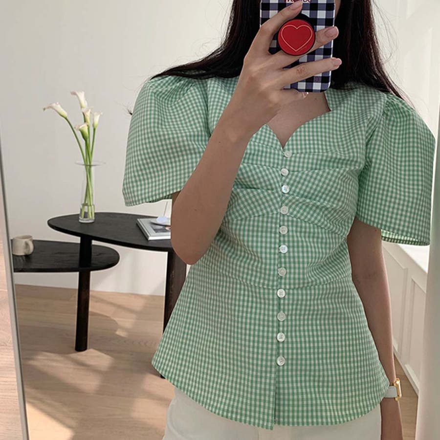 Vネックボリュームパフスリーブレトロ小花柄半袖ブラウスシャツ
