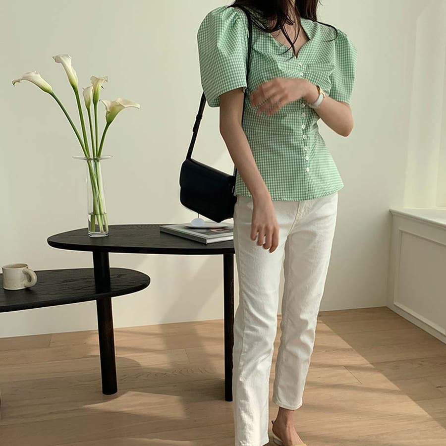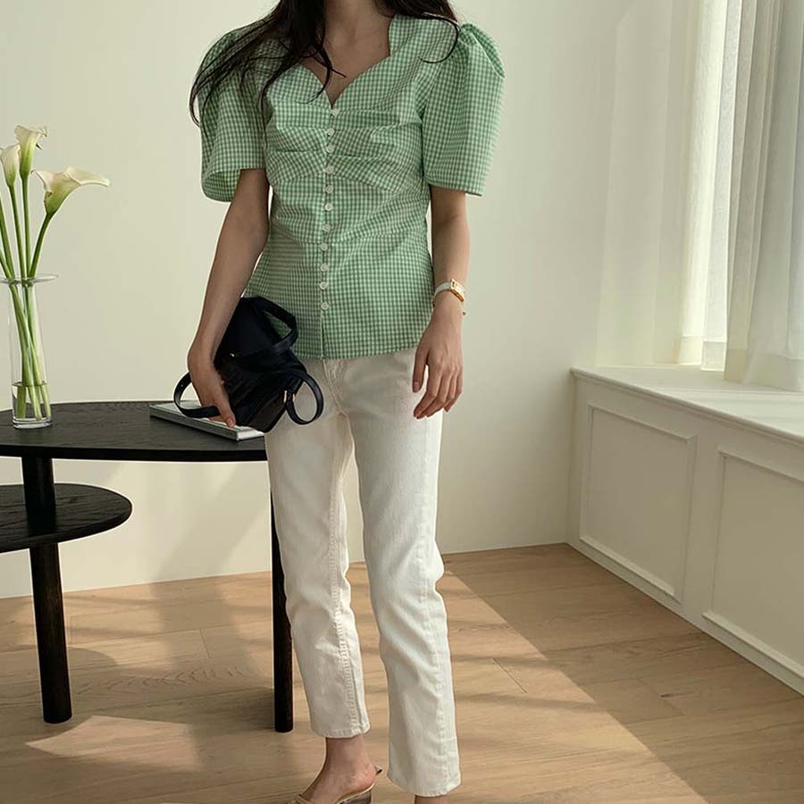 爽やかなパンツと合わせて女性らしくまとめるのが◎
