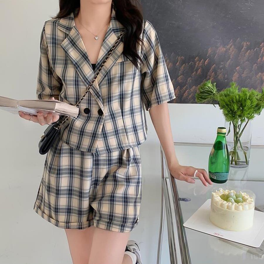 テーラードジャケットもチェック柄でカジュアルに