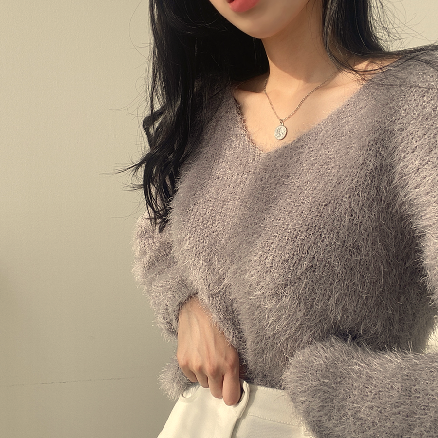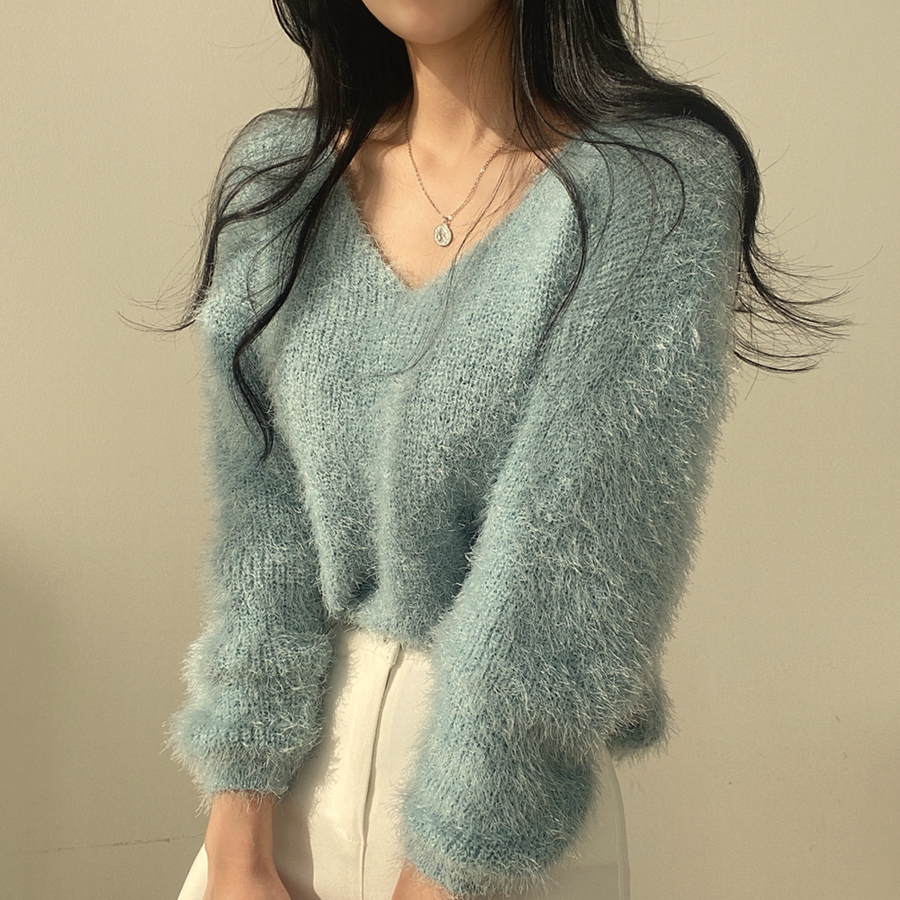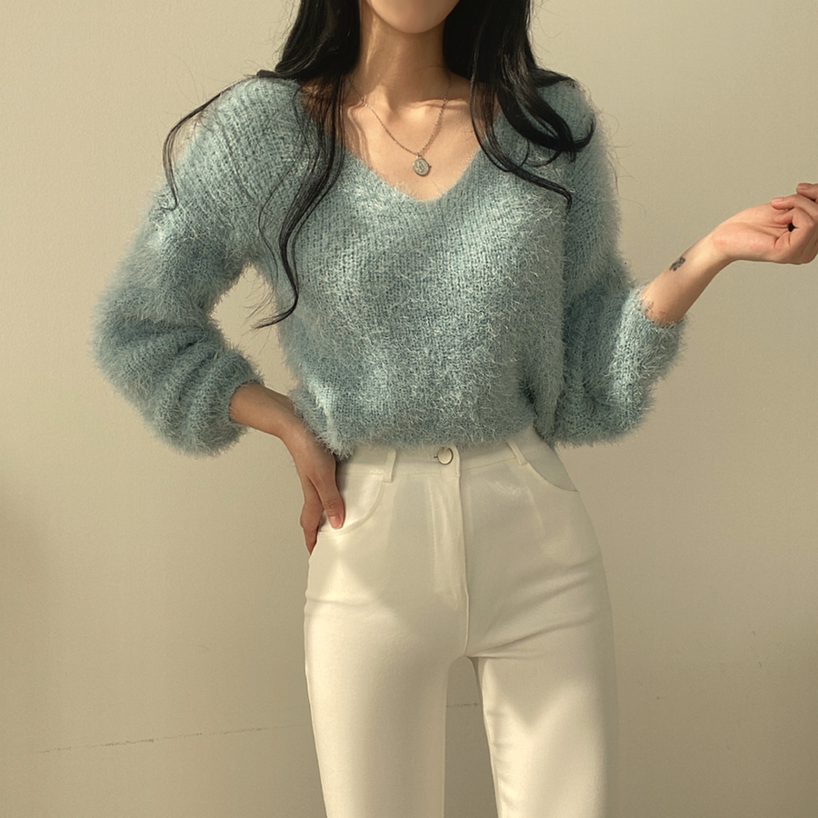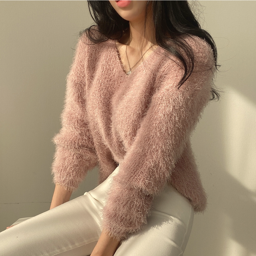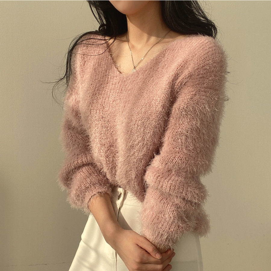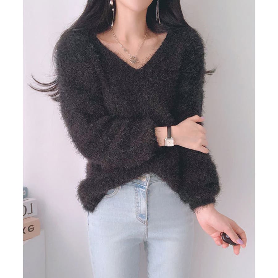 Vネックカラーシャギーニット【韓国ファッション】