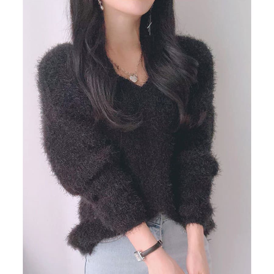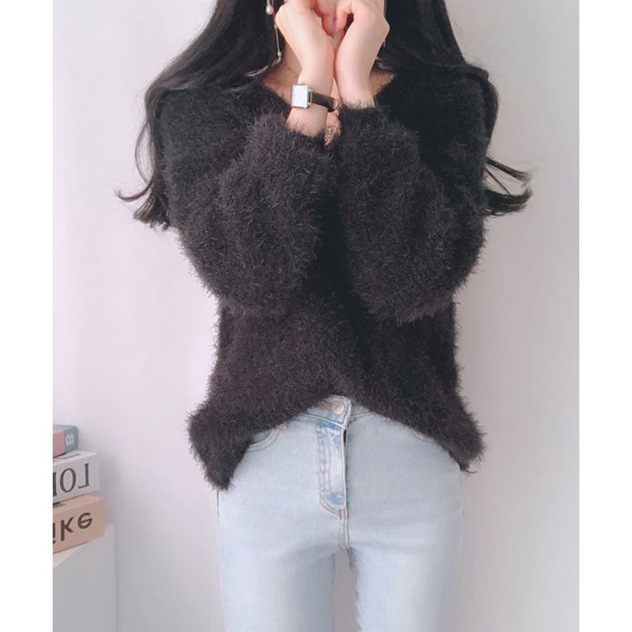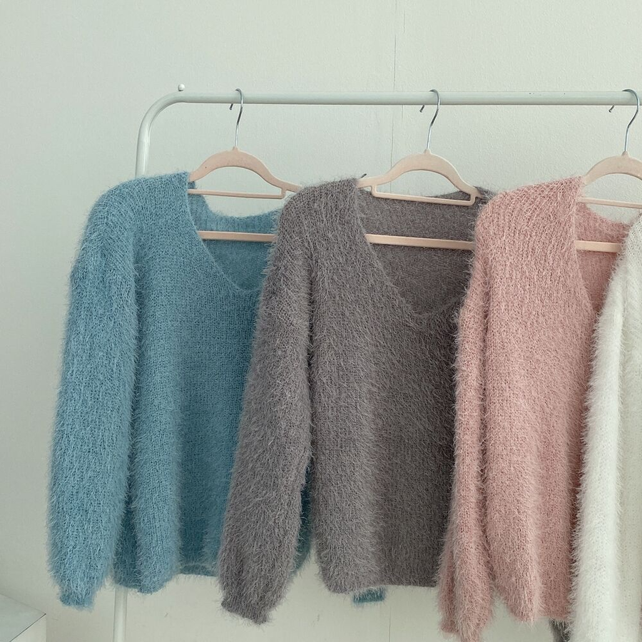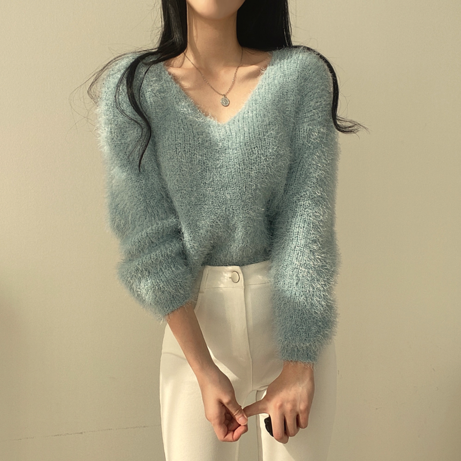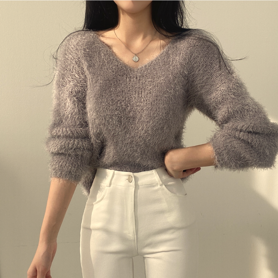 Vネックカラーシャギーニット【韓国ファッション】