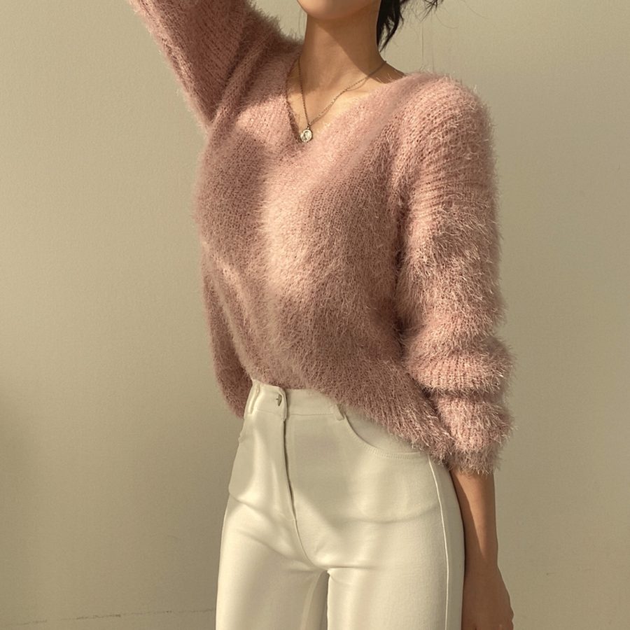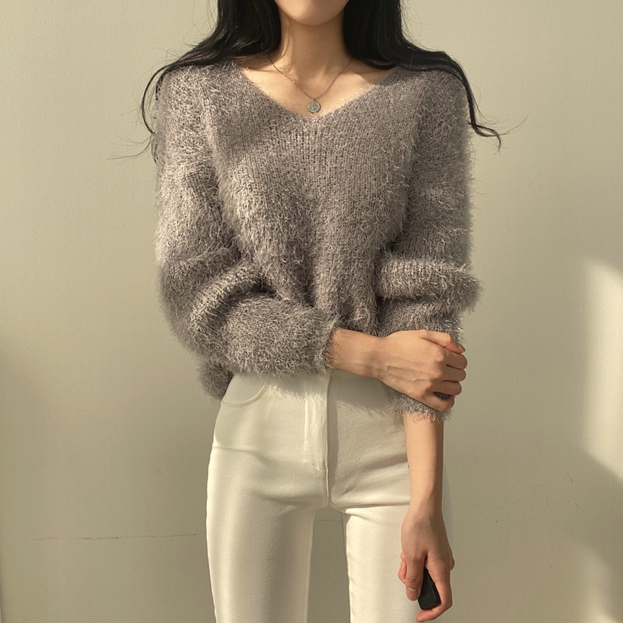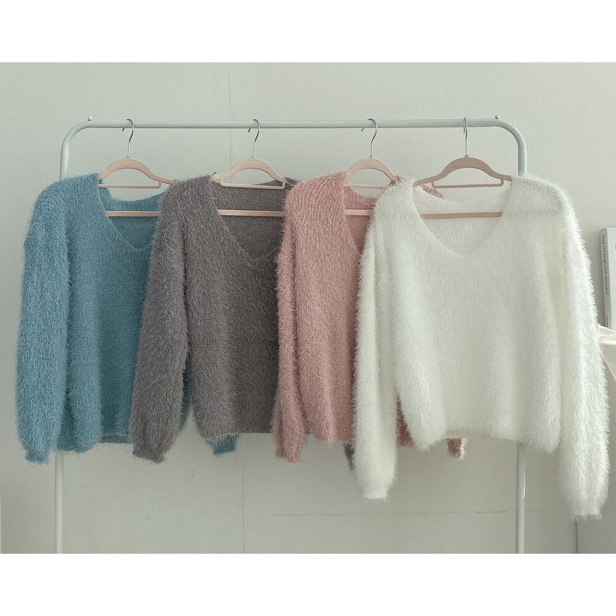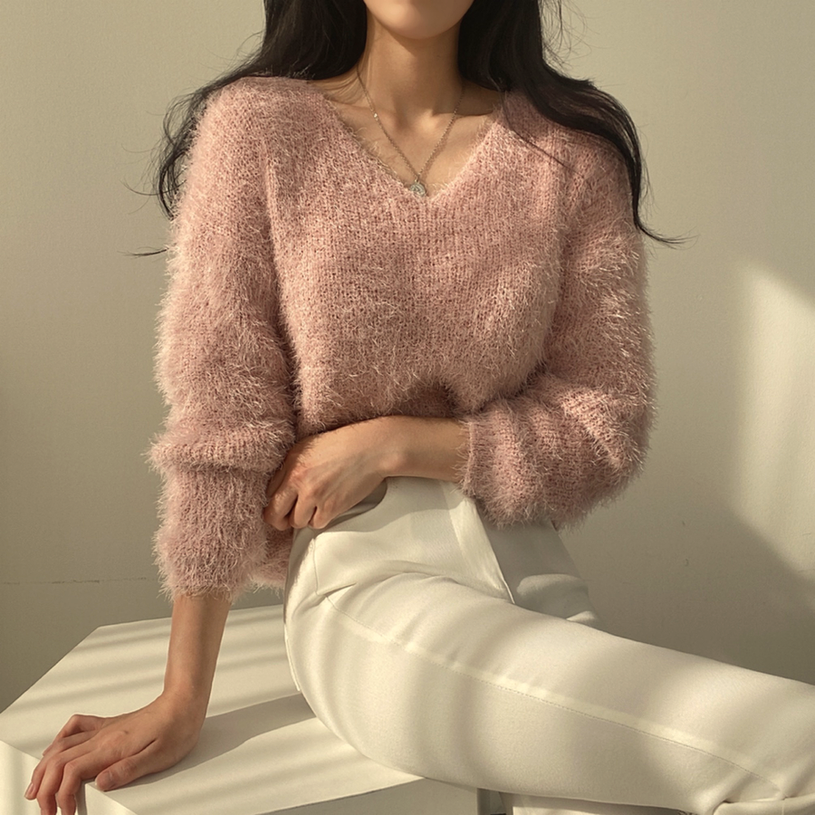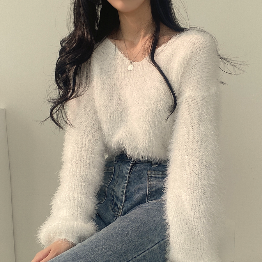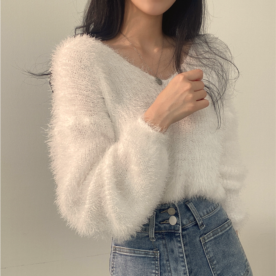 Vネックカラーシャギーニット【韓国ファッション】