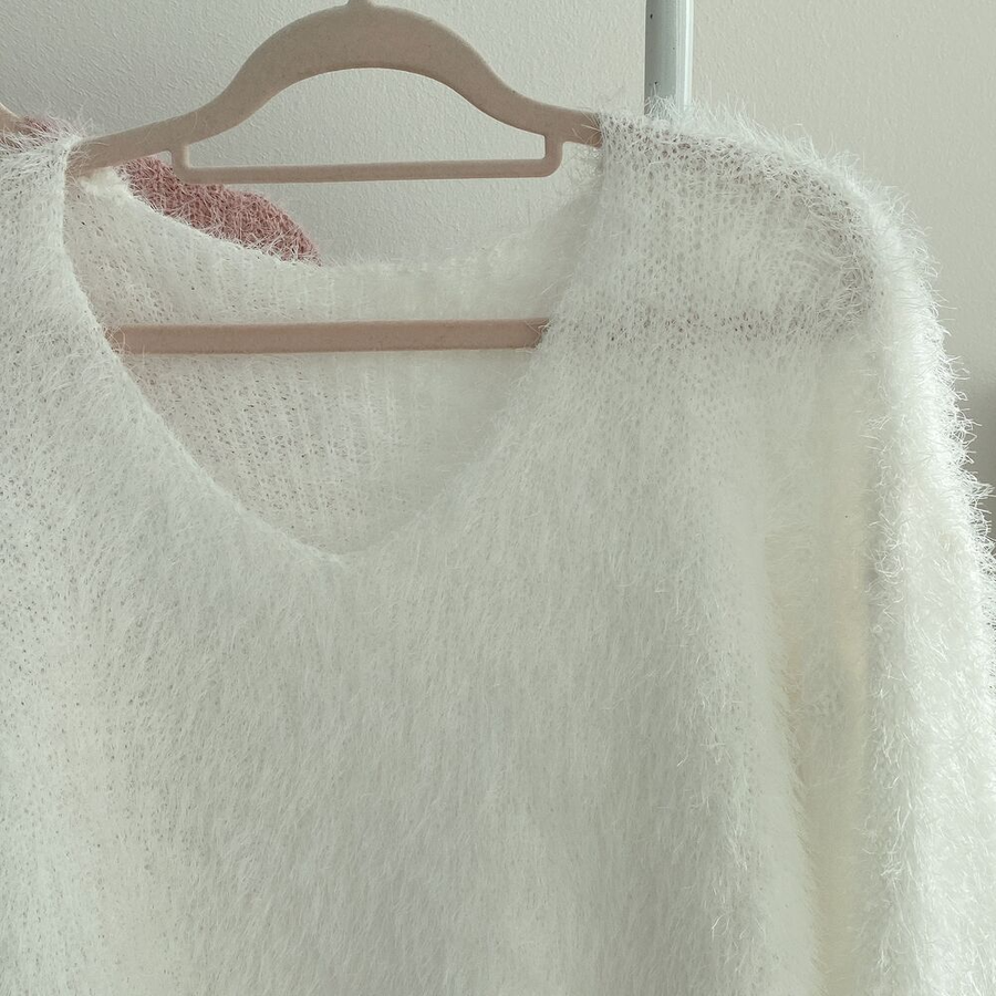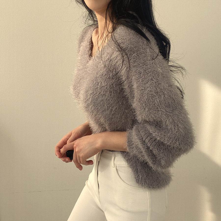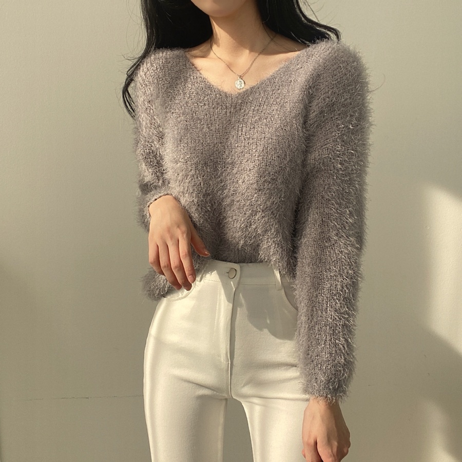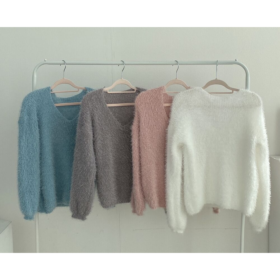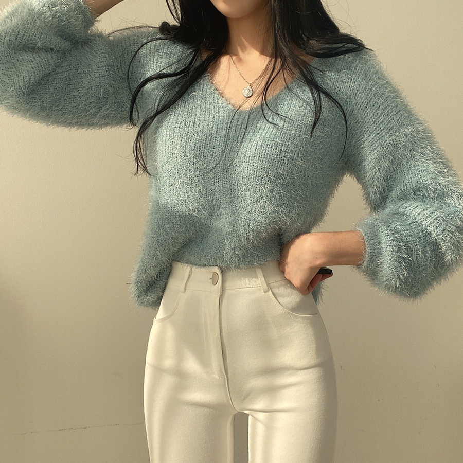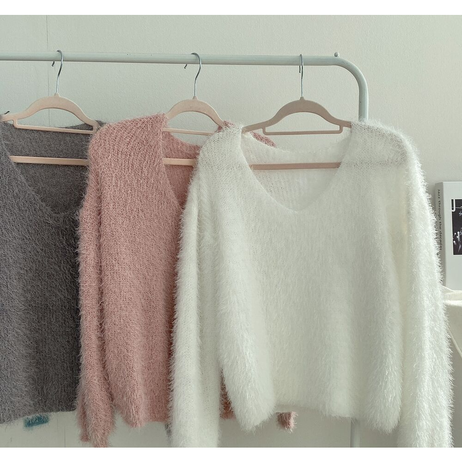 Vネックカラーシャギーニット【韓国ファッション】