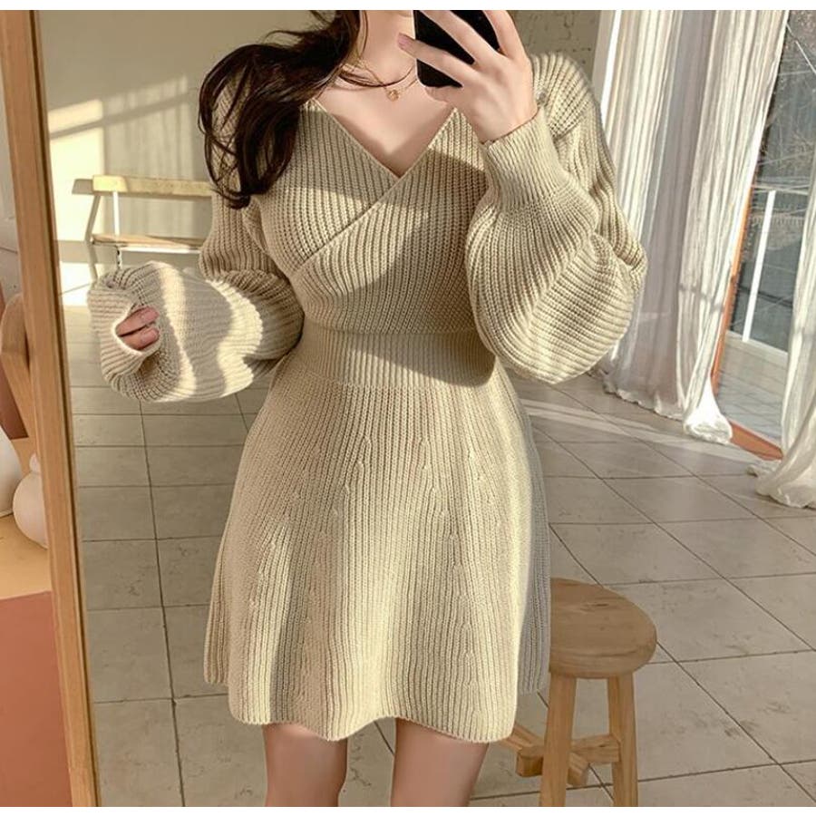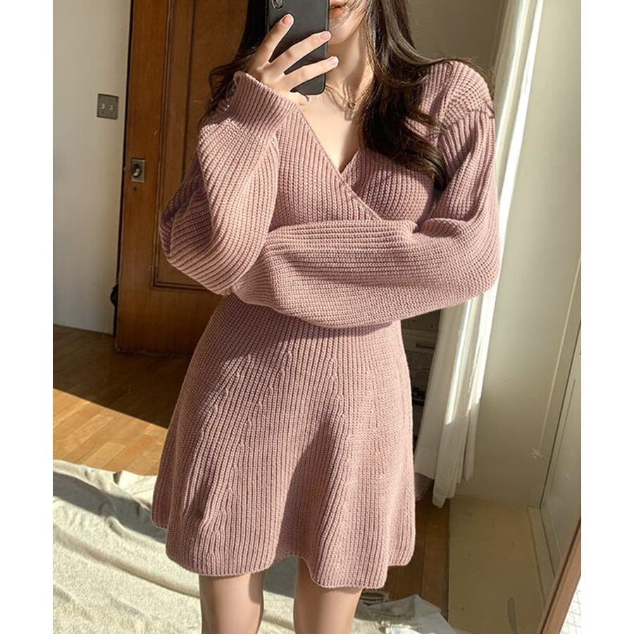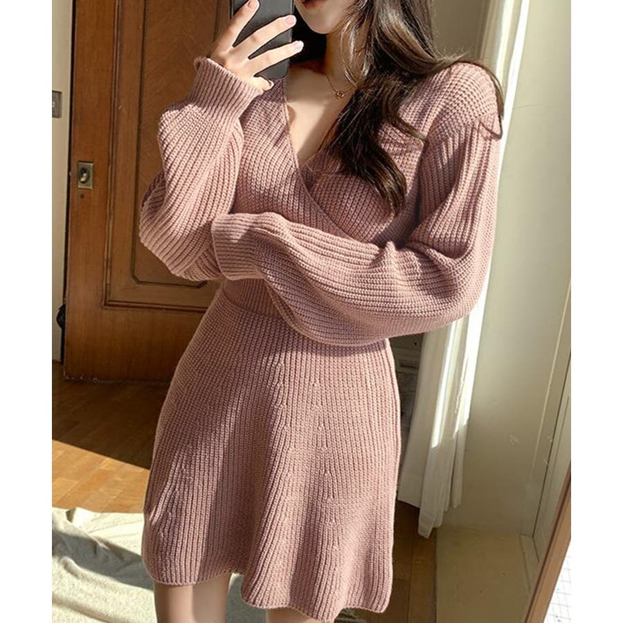 リブニットの柔らかい素材が女性らしいカシュクールワンピース♪