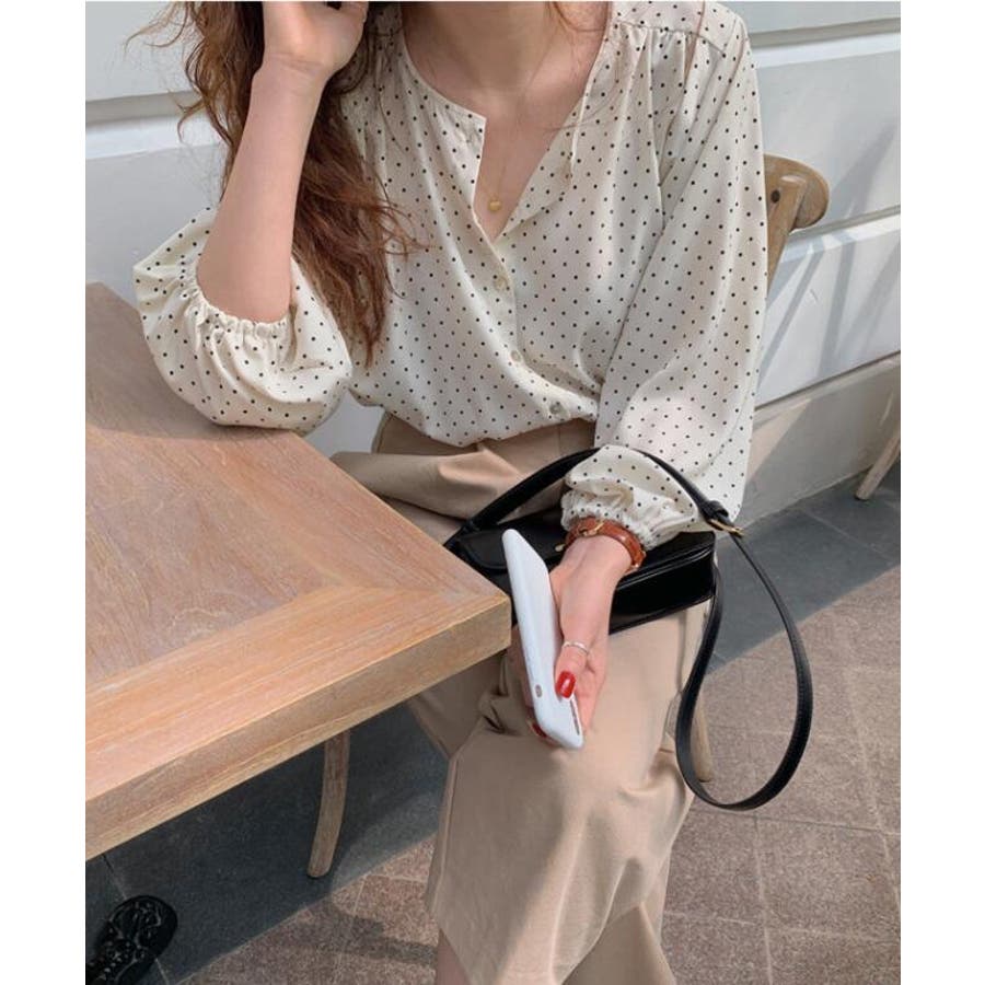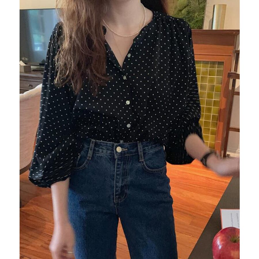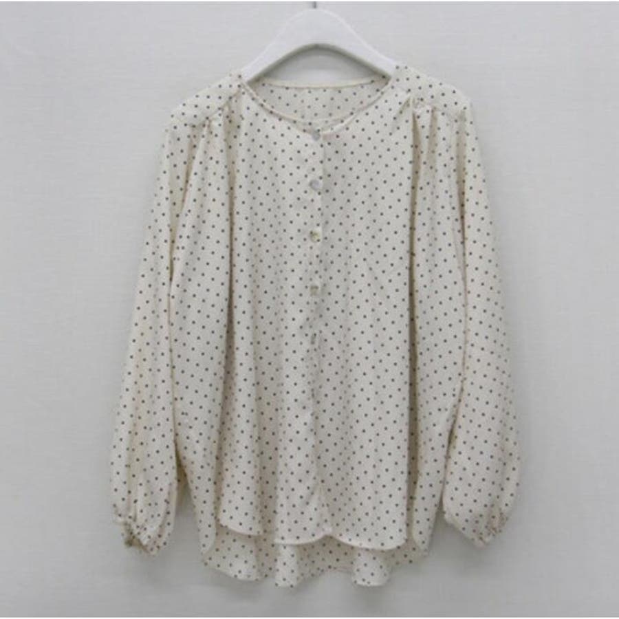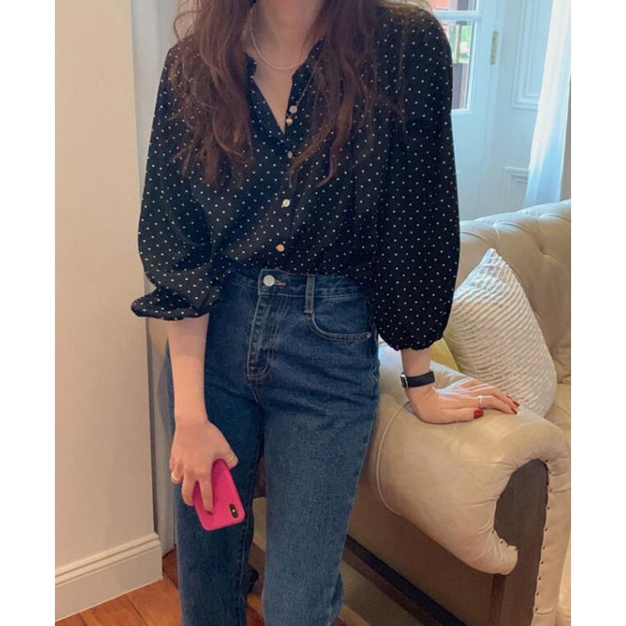 小さめドットで上品な華やかさを演出するデザインブラウス。