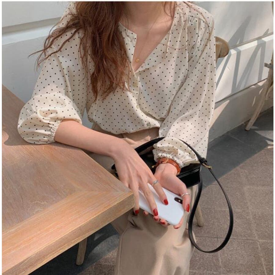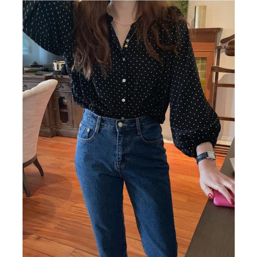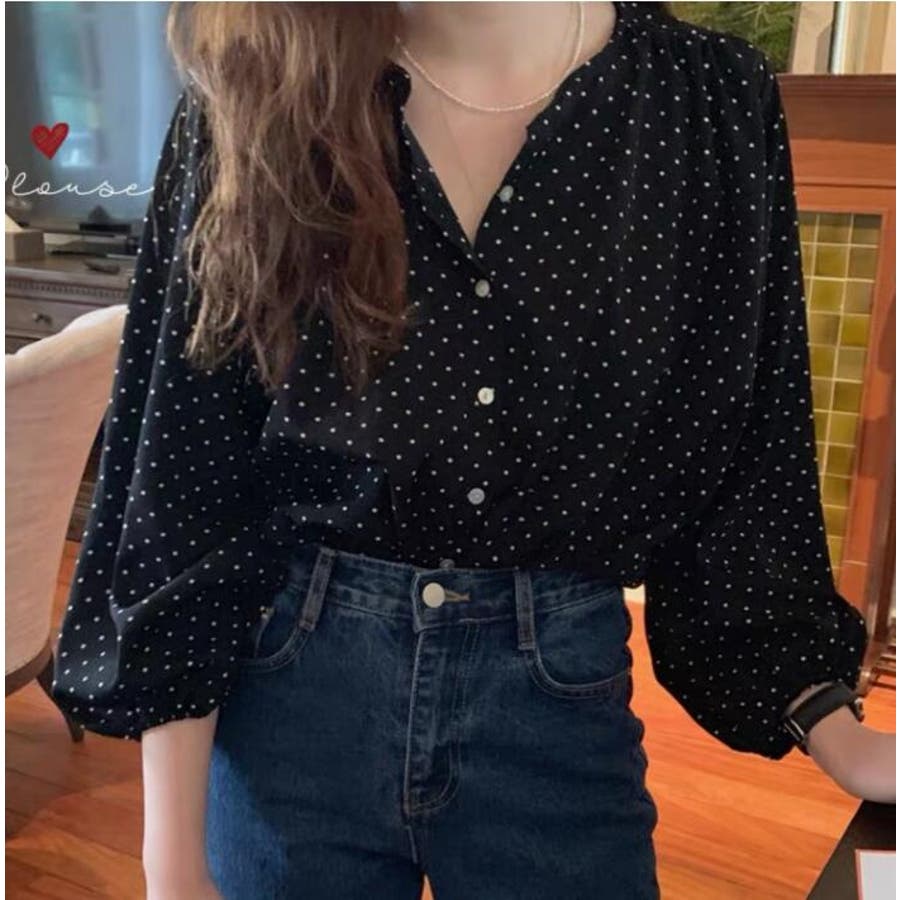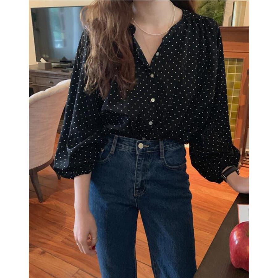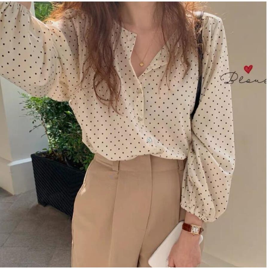 小さめドットで上品な華やかさを演出するデザインブラウス。