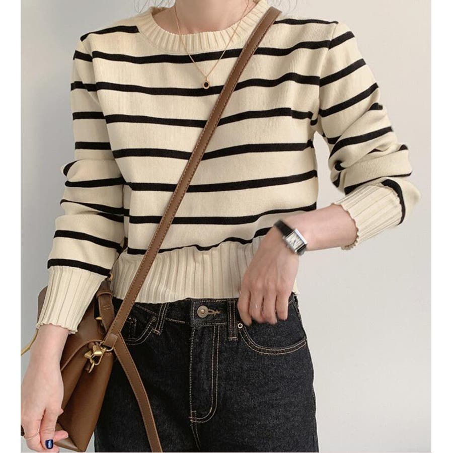 《スッキリ見え、大人ナチュラルな配色ボーダーサマーニット♪》