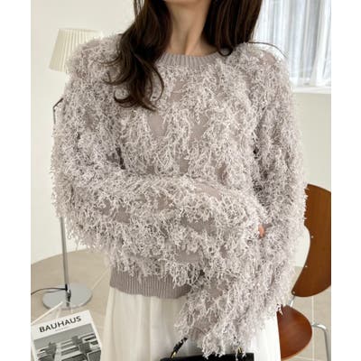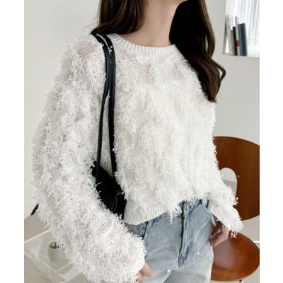 フェザーテープ糸を編み込んだふぁさっとした表面感が今季らしいデザインのニット