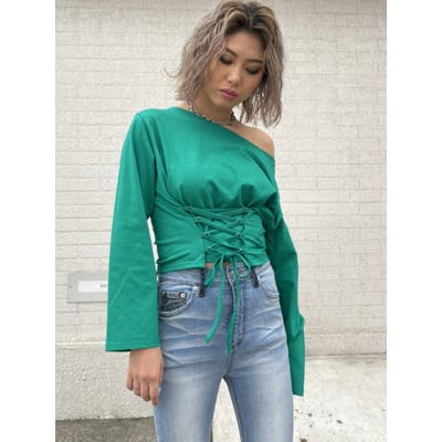 ウエストのレースアップの絞り方で見え感が変わるデザイントップス。