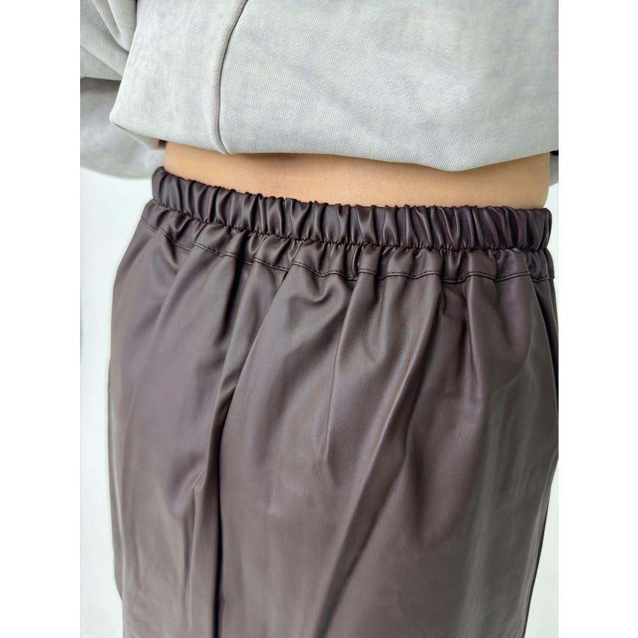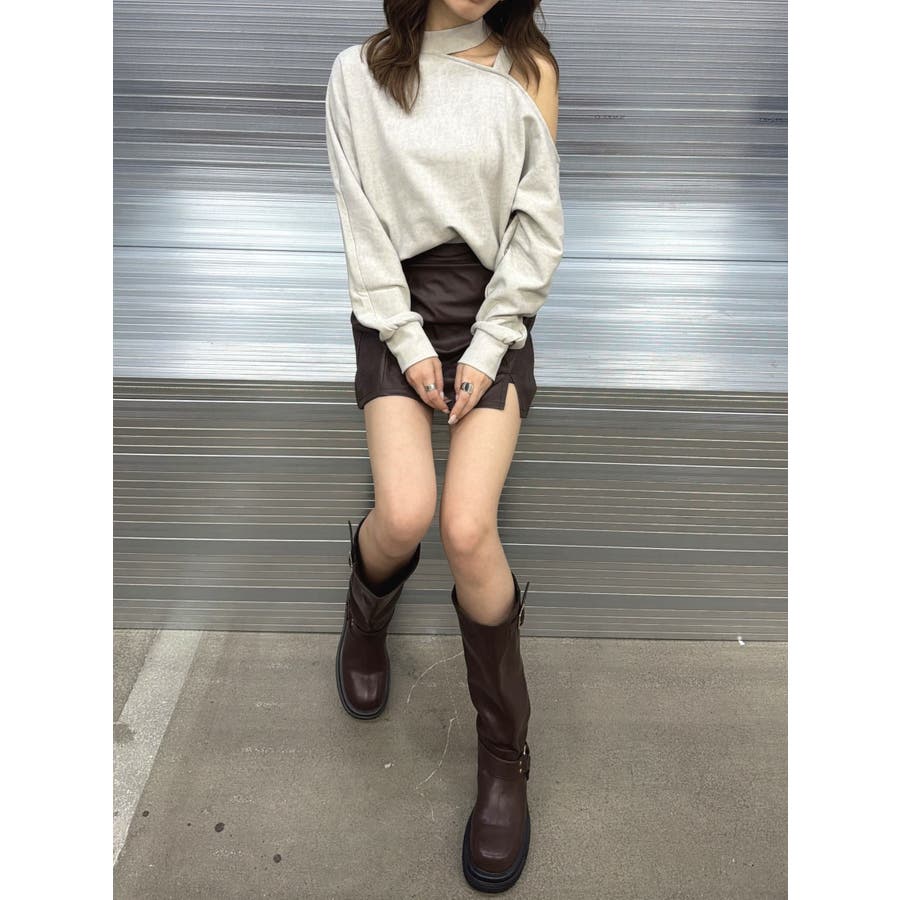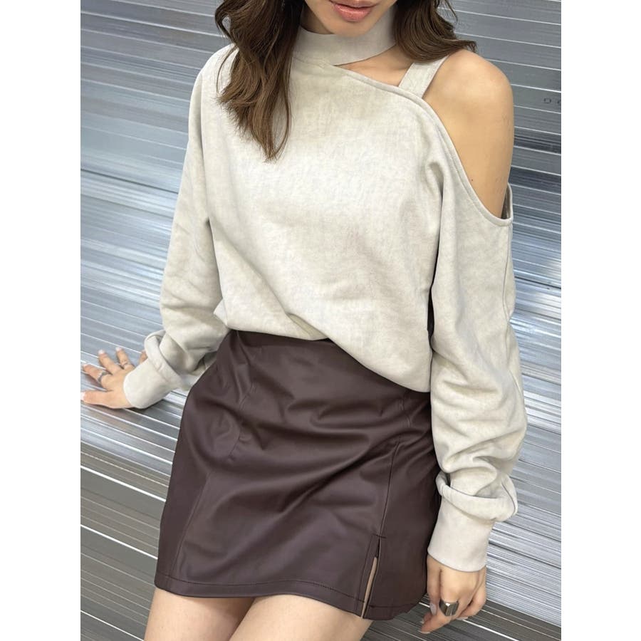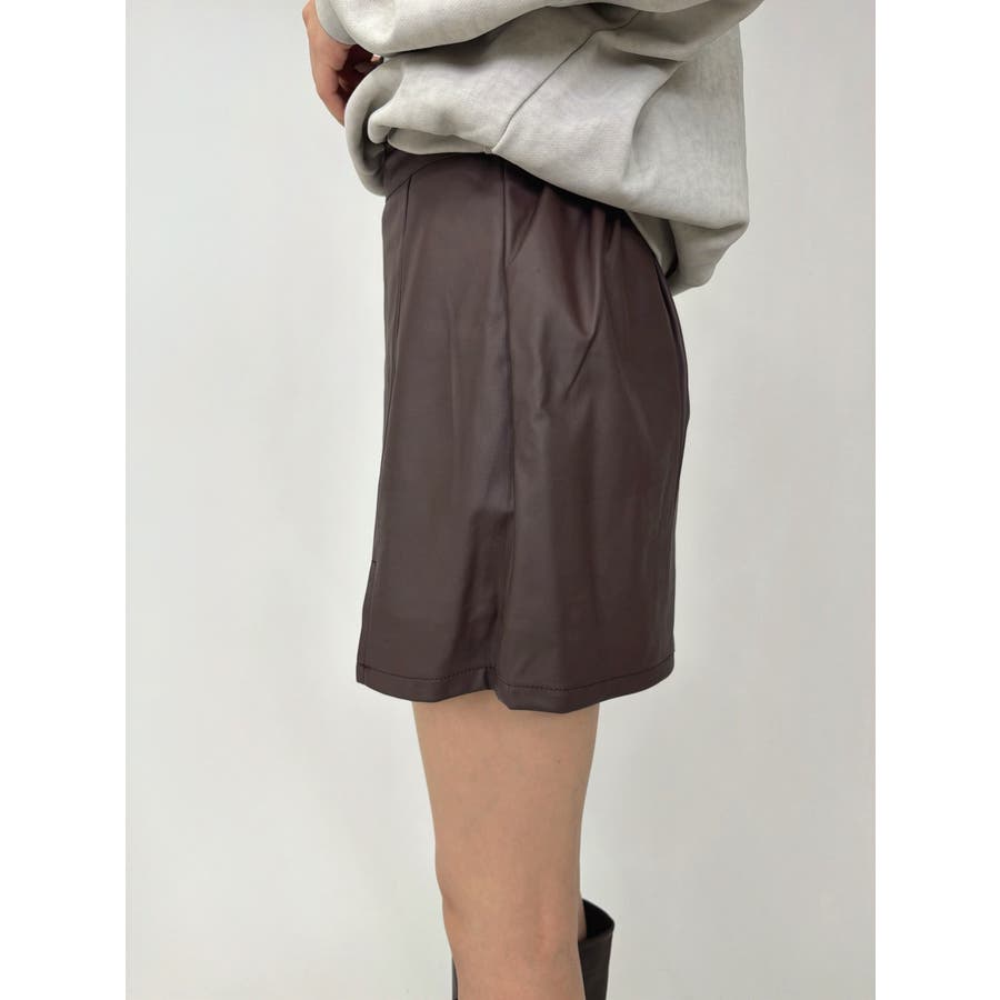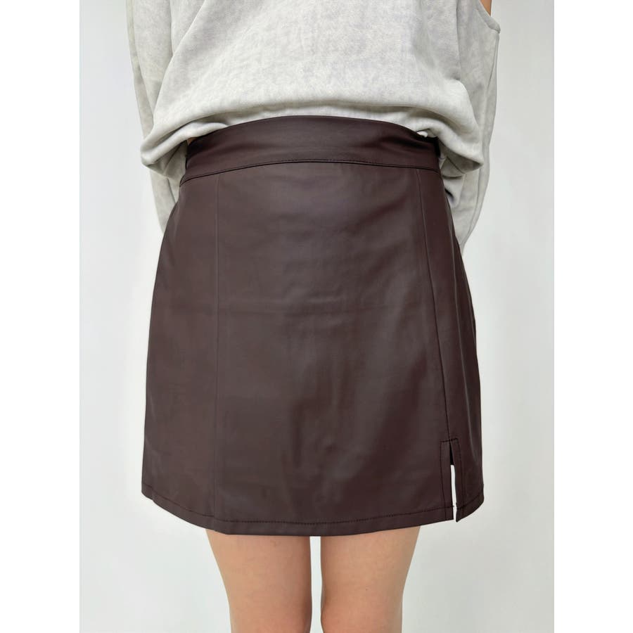 トレンド感溢れる裾スリットを施したフェイクレザーミニスカート。