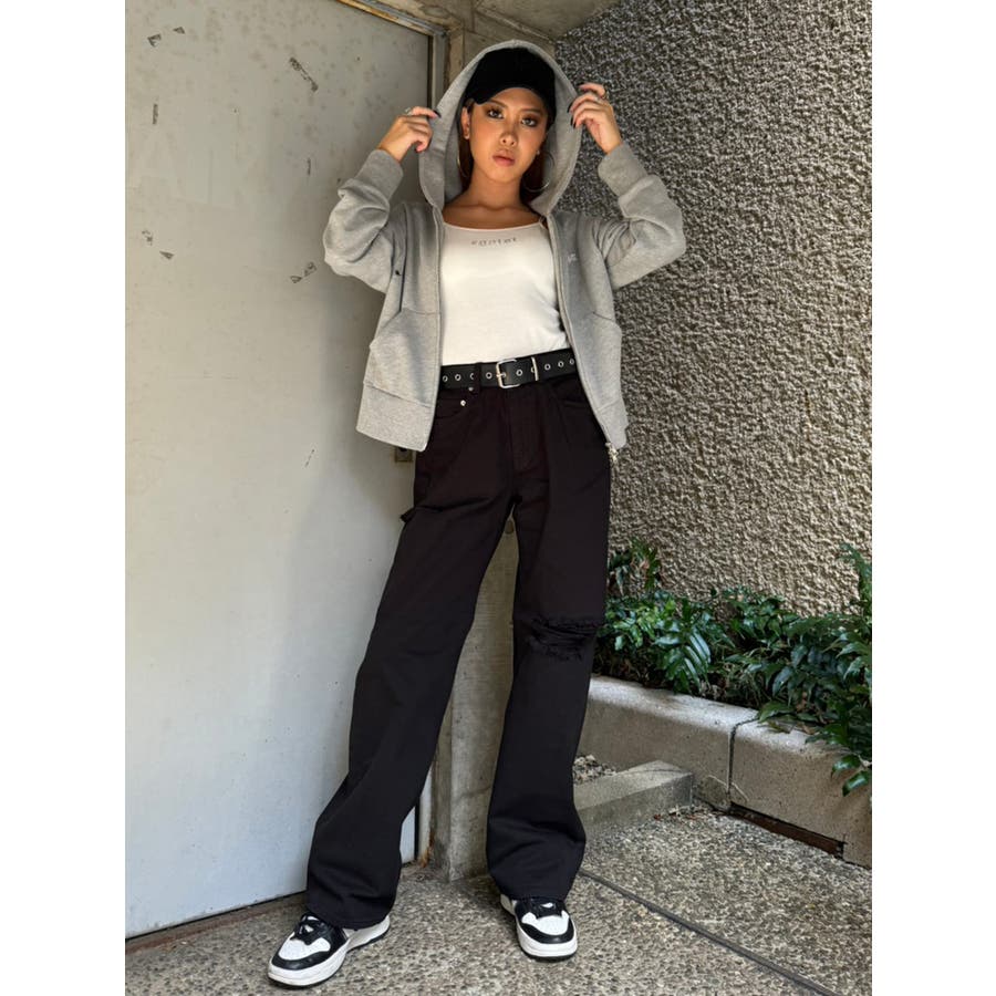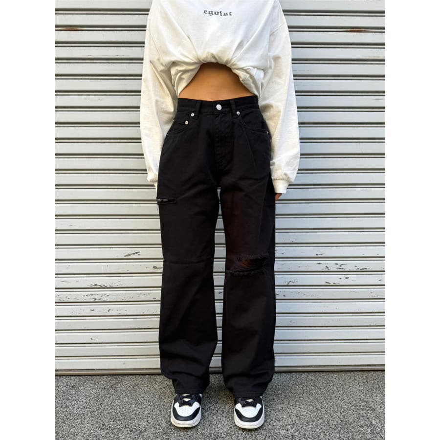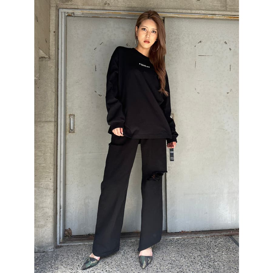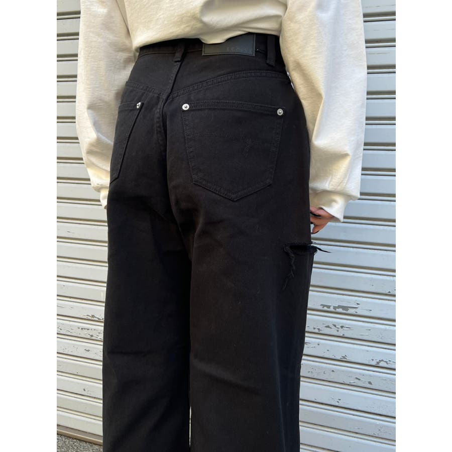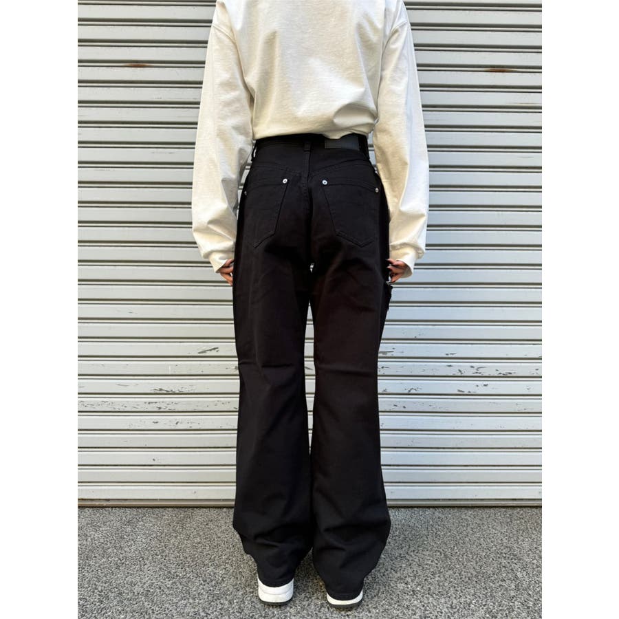 シーズン問わずに使えるのが嬉しいBLACKツイルパンツ。ずるっとルーズなストレートワイドシルエットでトレンド要素をプラス。スニーカーで合わせたときに裾が溜まるよう、少し長めの股下設定にしています。メンズライクなシルエットなので、コンパクトなトップス合わせで女性らしさをプラスしメリハリを付けるのがオススメ。オリジナル感を出す為、後ろウエストにはEGOISTロゴが入ったBLACKの牛革パッチを付けています。