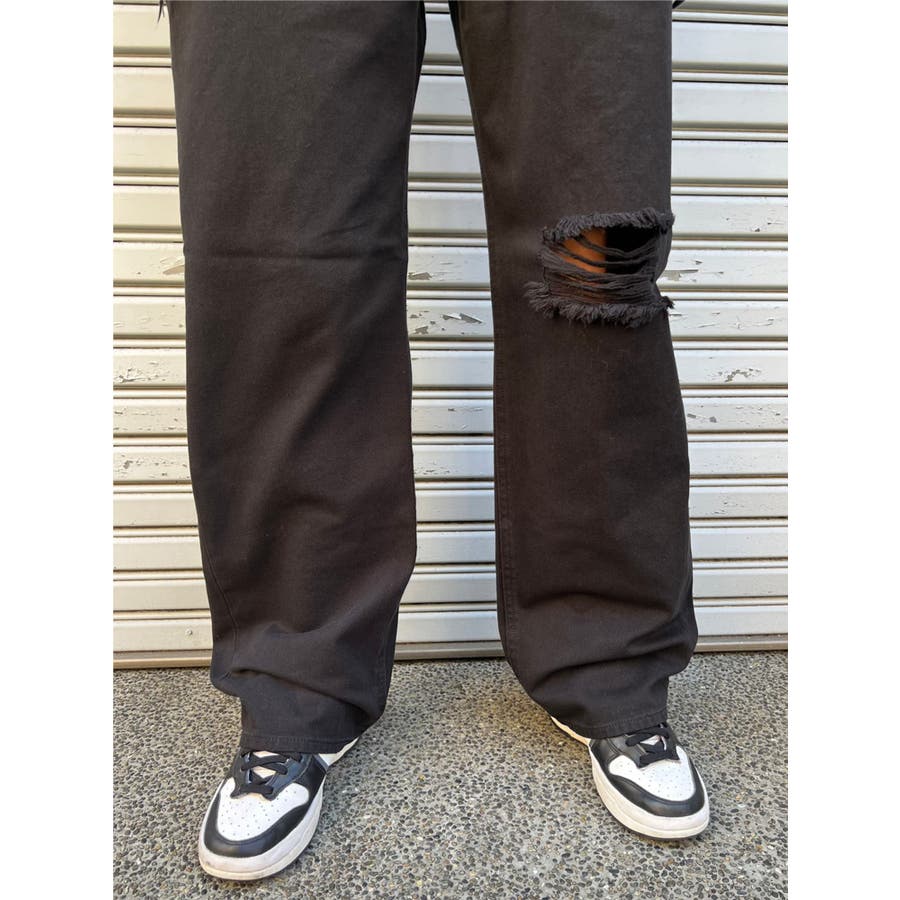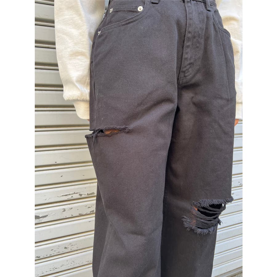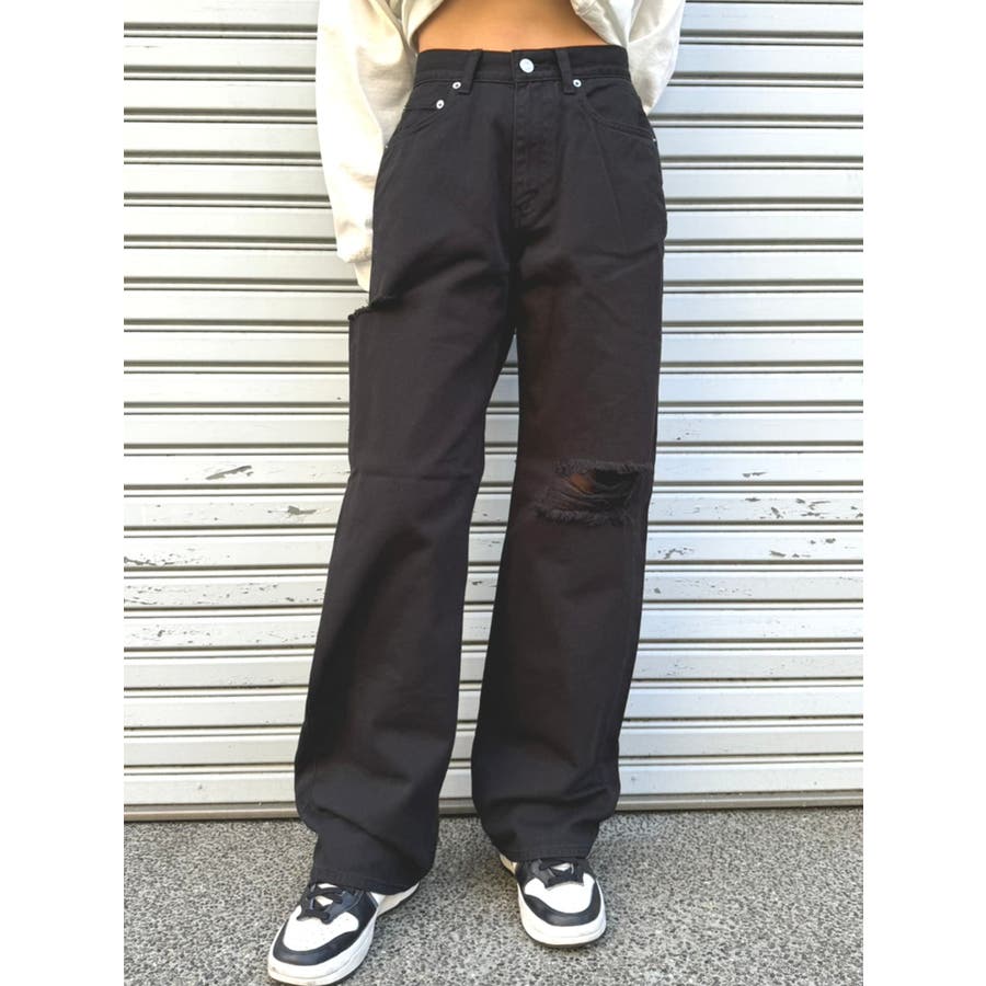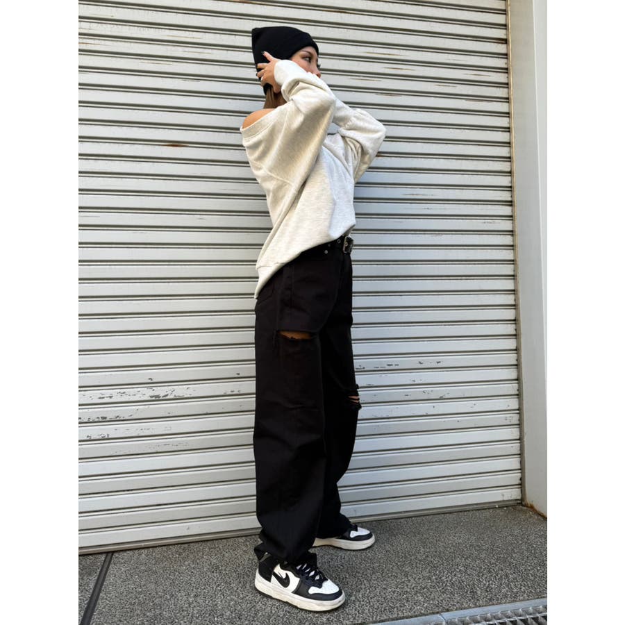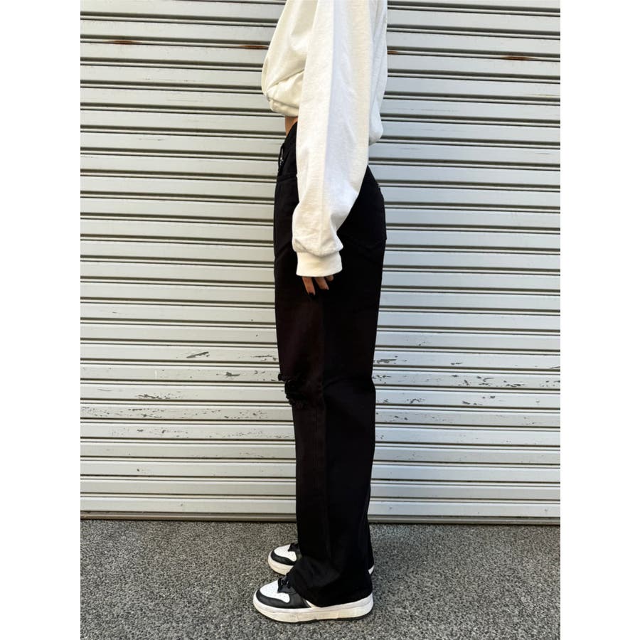 シーズン問わずに使えるのが嬉しいBLACKツイルパンツ。ずるっとルーズなストレートワイドシルエットでトレンド要素をプラス。スニーカーで合わせたときに裾が溜まるよう、少し長めの股下設定にしています。メンズライクなシルエットなので、コンパクトなトップス合わせで女性らしさをプラスしメリハリを付けるのがオススメ。オリジナル感を出す為、後ろウエストにはEGOISTロゴが入ったBLACKの牛革パッチを付けています。