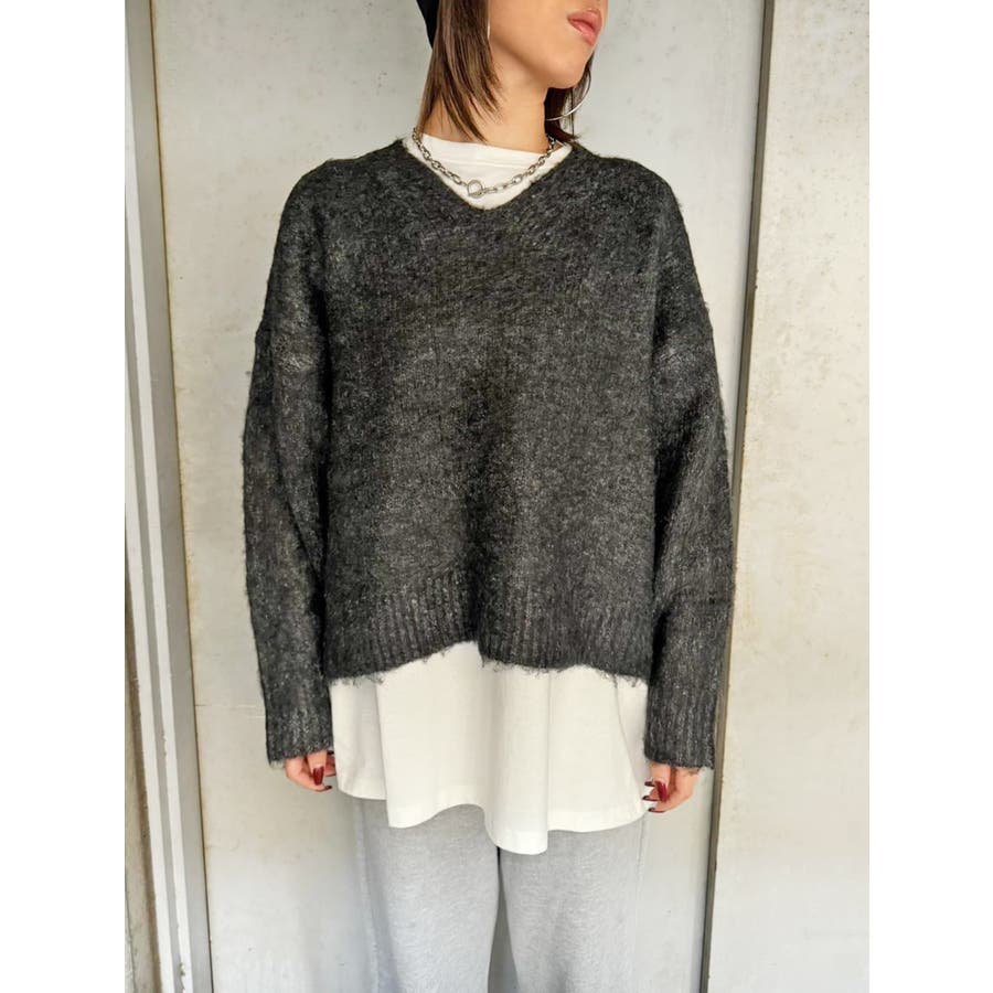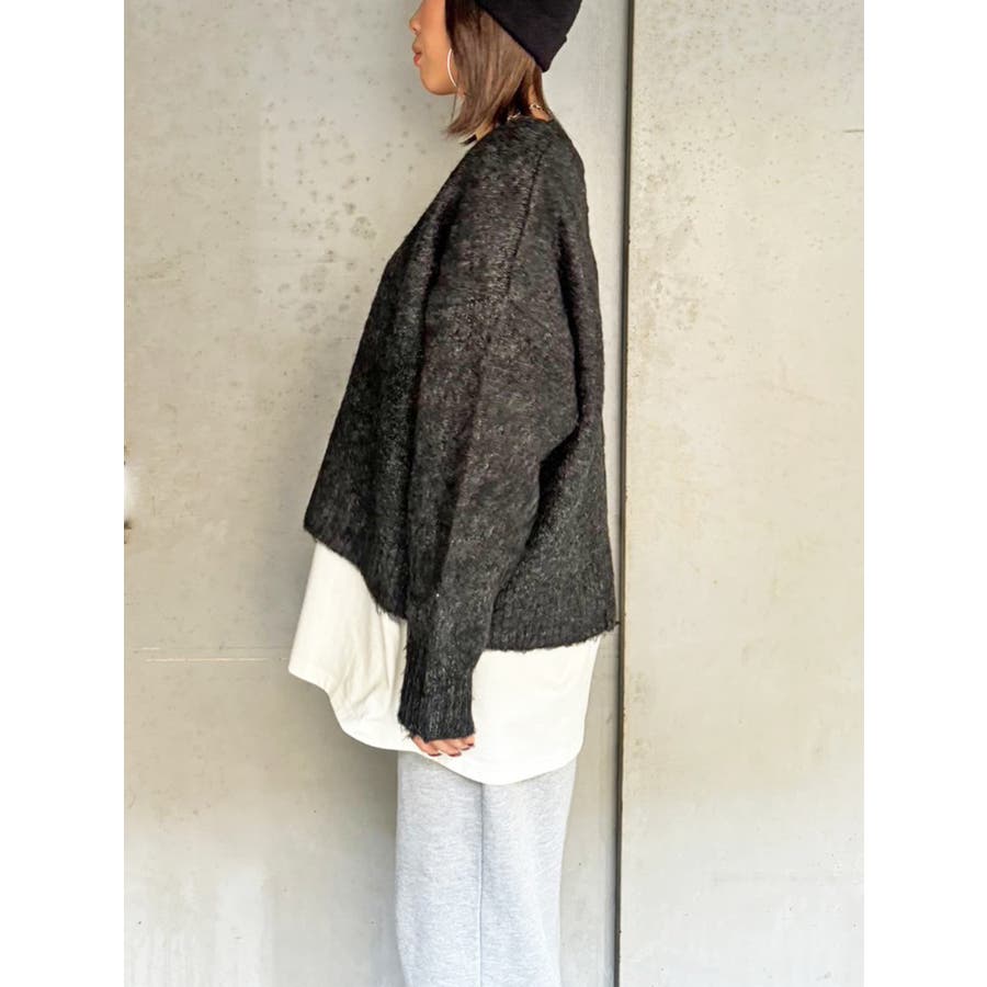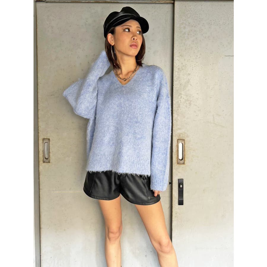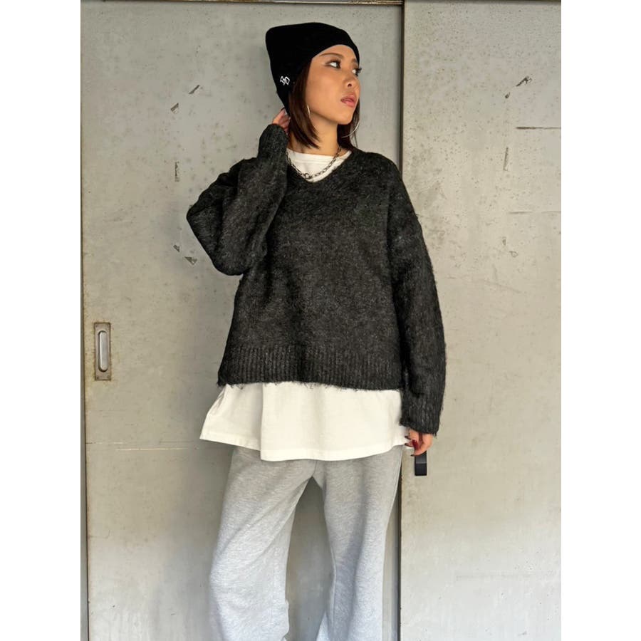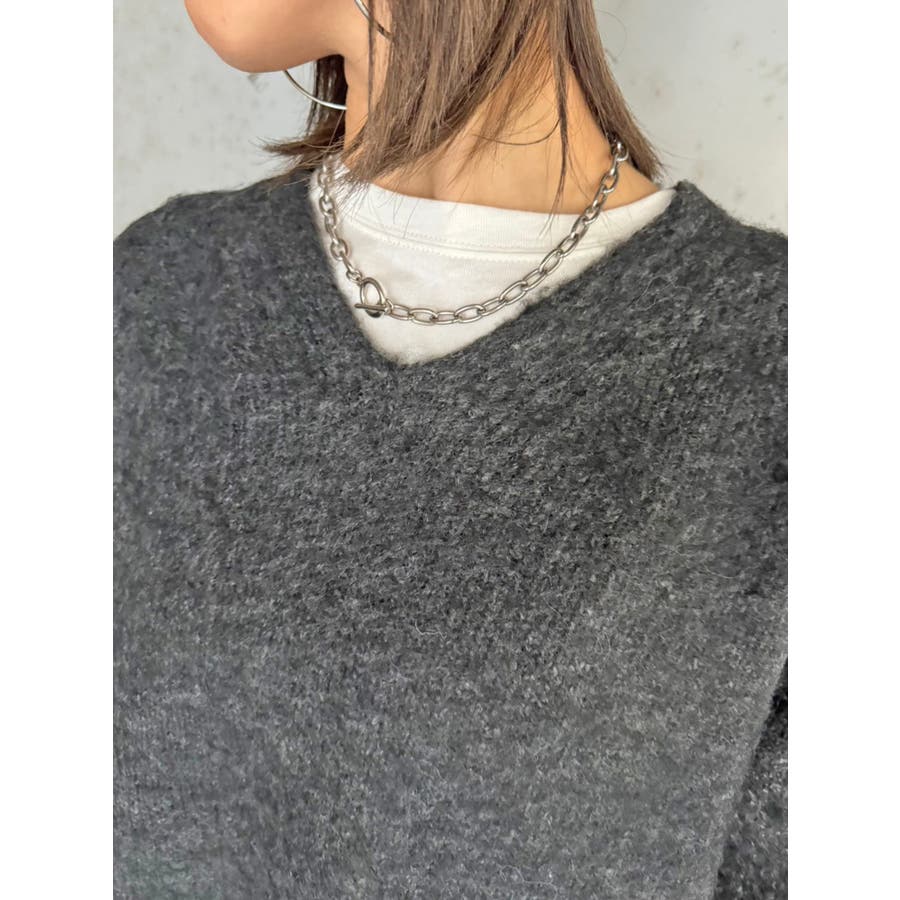 トレンドの毛足が長いシャギーニットを使用したVネックニットトップス。柔らかい肌触りとふんわりとした風合いが魅力的です。1枚で着て首回りをスッキリ見せるのはもちろん、タートルネックやロンT・シャツなどをレイヤードして着るのもおススメ。身頃もゆったりシルエットでドロップショルダー仕様なため、ルーズなこなれ感を演出します。ウエストの隠れる適度な丈感でボトムスとのバランスが取りやすいのも◎。コーデの主役になるロングシャギーニットのアイテムは今季マストハブ。