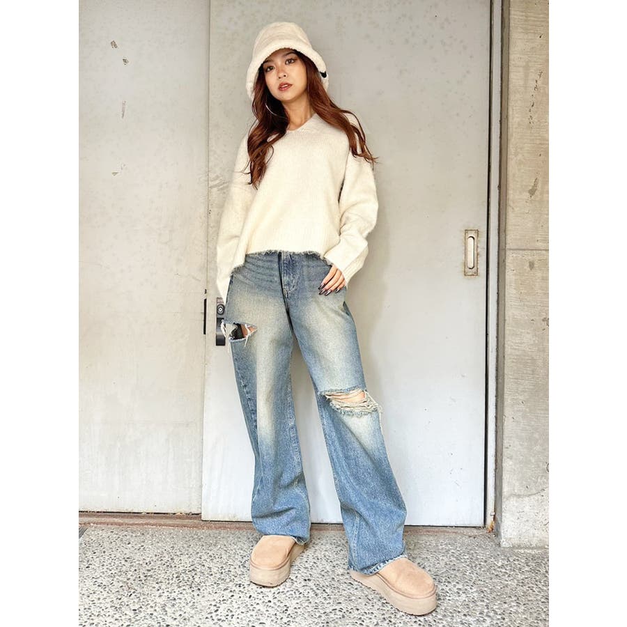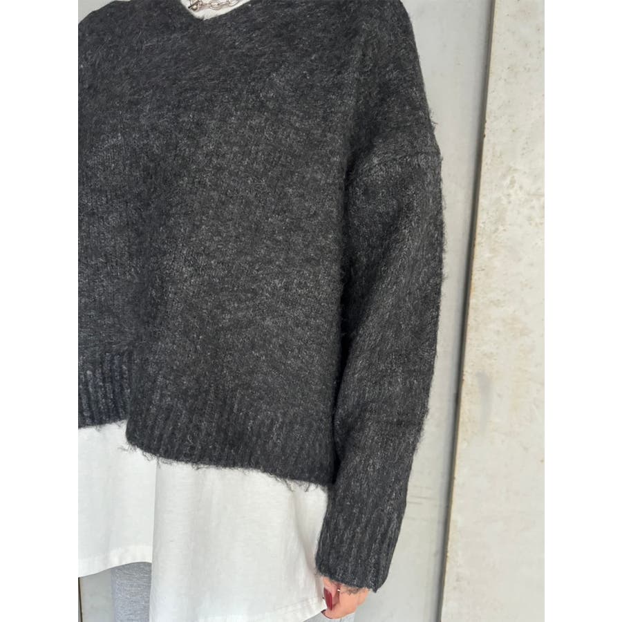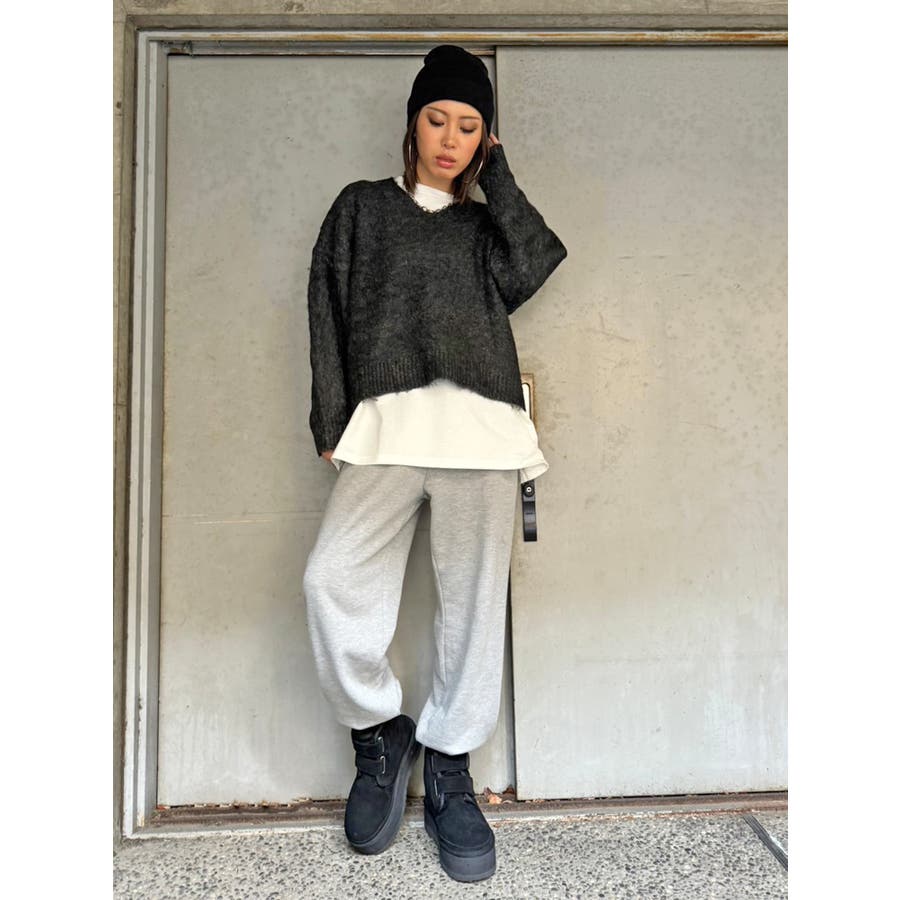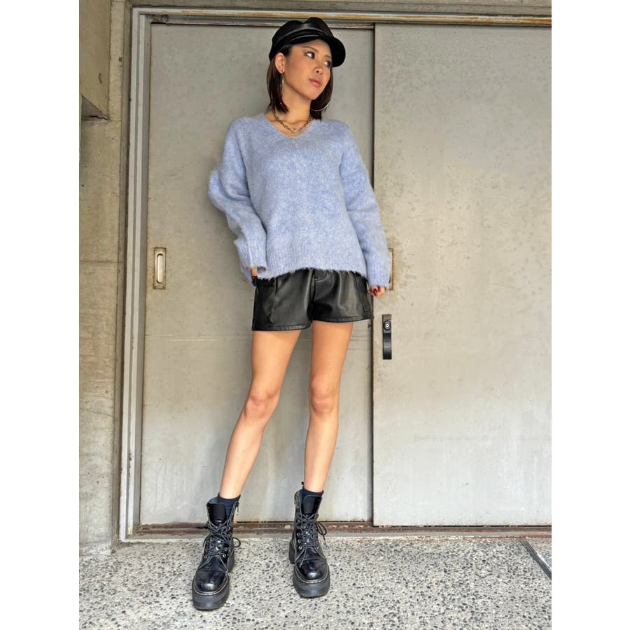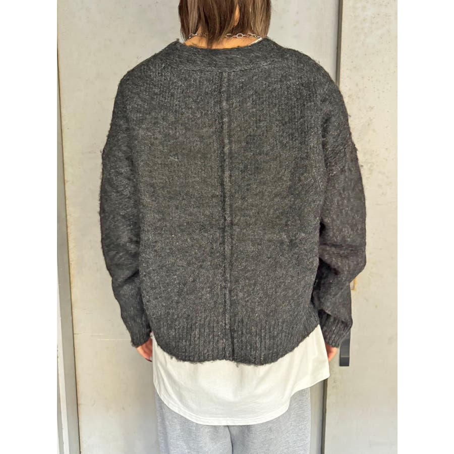 トレンドの毛足が長いシャギーニットを使用したVネックニットトップス。柔らかい肌触りとふんわりとした風合いが魅力的です。1枚で着て首回りをスッキリ見せるのはもちろん、タートルネックやロンT・シャツなどをレイヤードして着るのもおススメ。身頃もゆったりシルエットでドロップショルダー仕様なため、ルーズなこなれ感を演出します。ウエストの隠れる適度な丈感でボトムスとのバランスが取りやすいのも◎。コーデの主役になるロングシャギーニットのアイテムは今季マストハブ。