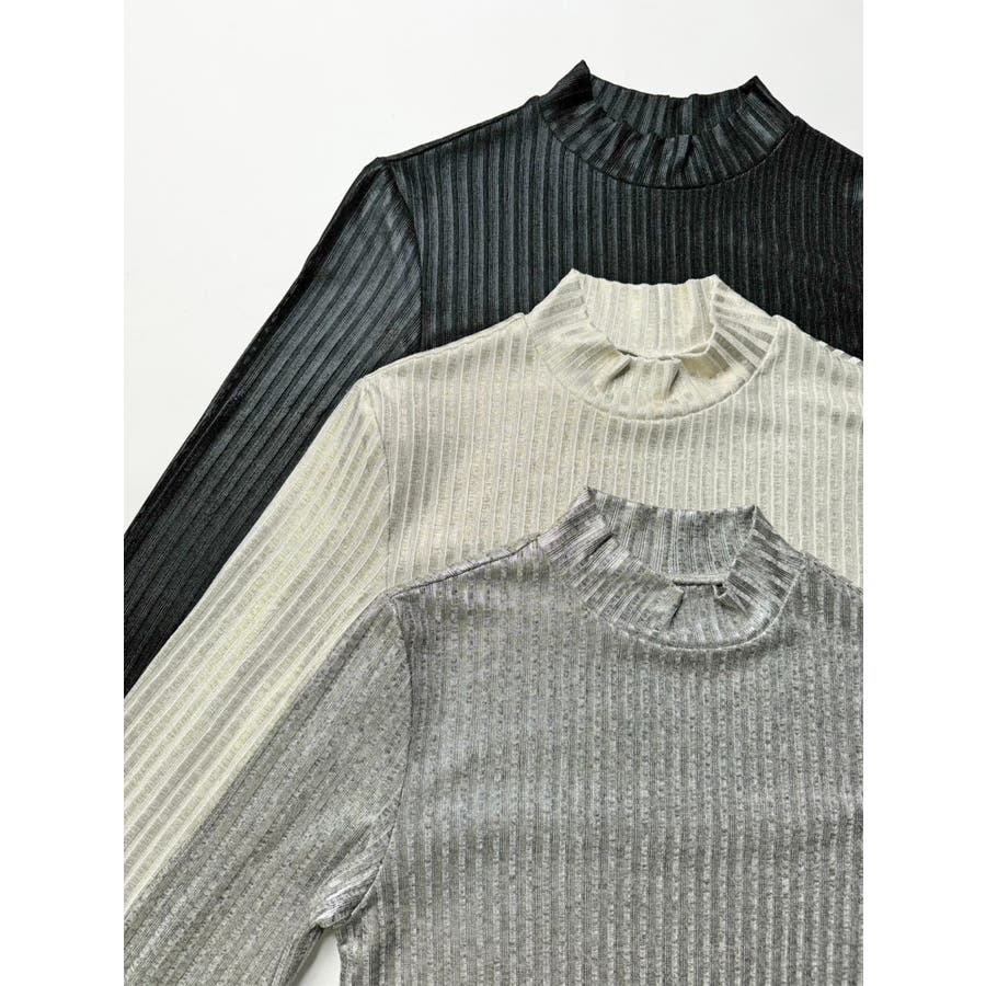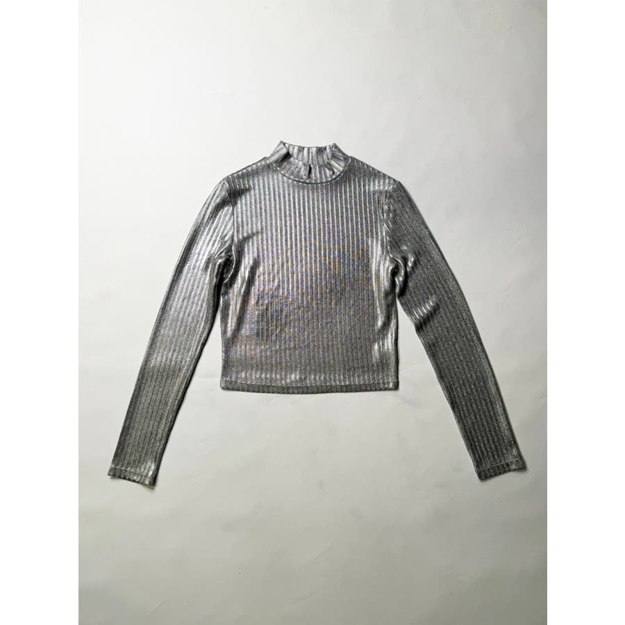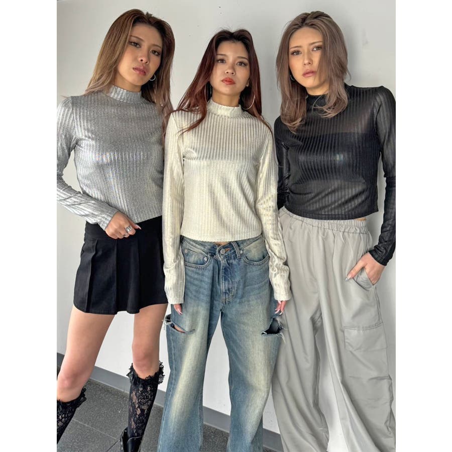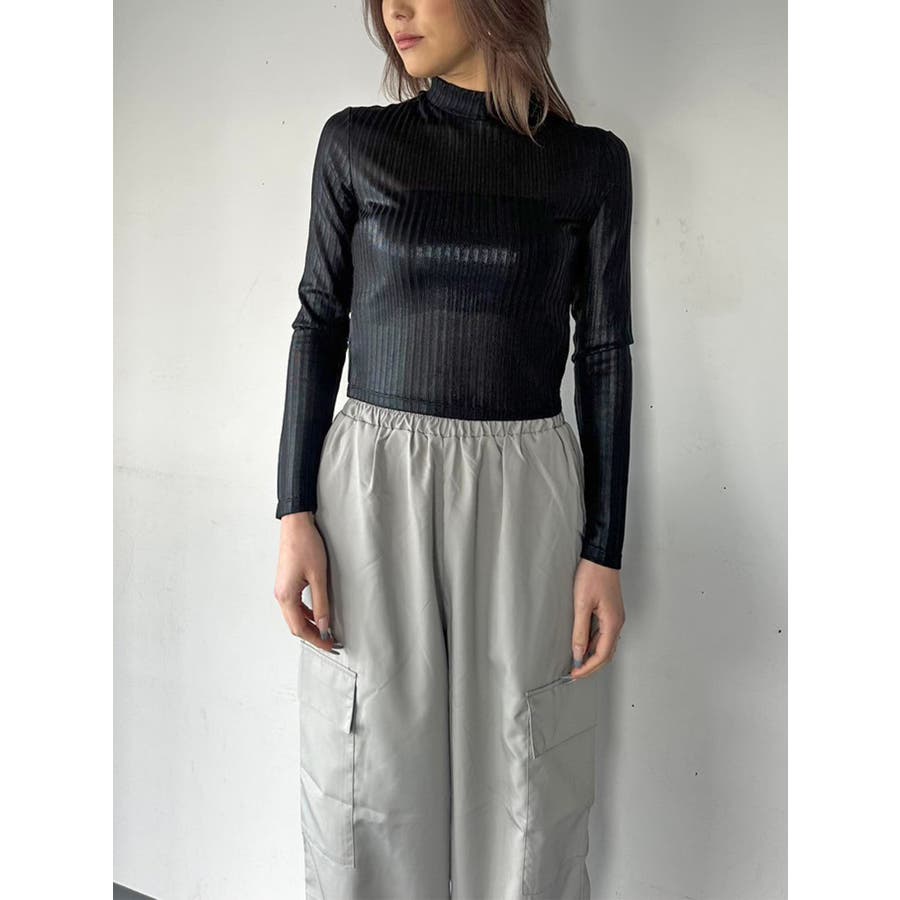 今季トレンドのホイルプリントを施したボトルネックのリブトップス。着丈をジャストウエストに設定し、スタイリングの邪魔にならないようにしています。1枚で着ていただくことはもちろん、シアーやメッシュといった異素材のキャミやトップスとレイヤードするのもおススメ。タイトなアイテムなのでボトムスはワイドシルエットと合わせるとメリハリのバランスが取れるので◎