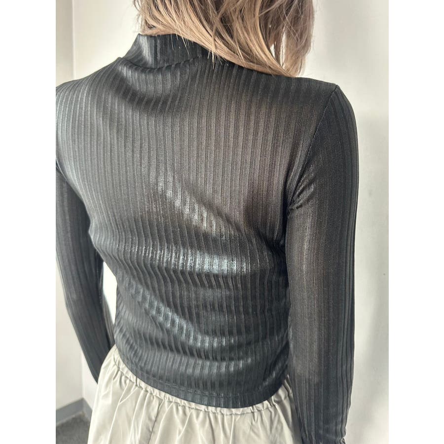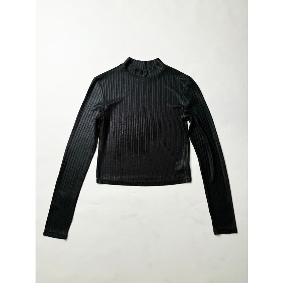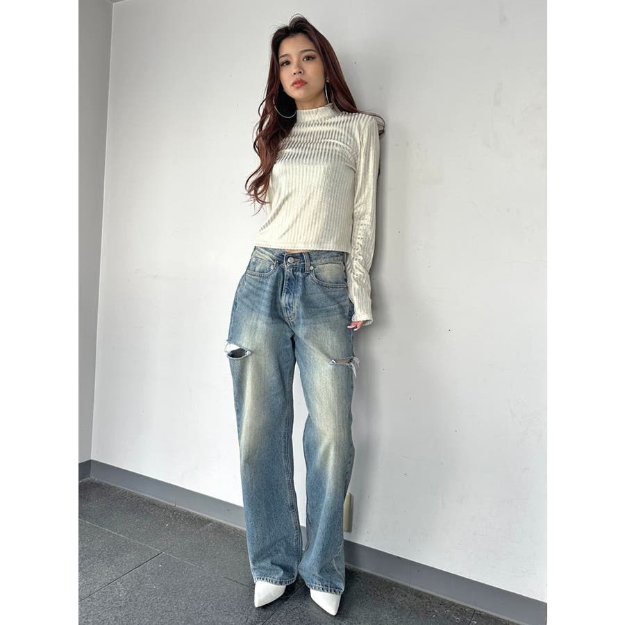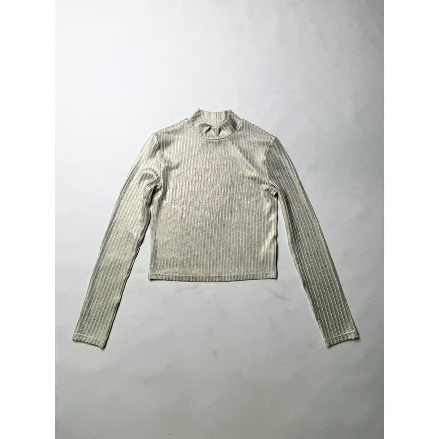 今季トレンドのホイルプリントを施したボトルネックのリブトップス。着丈をジャストウエストに設定し、スタイリングの邪魔にならないようにしています。1枚で着ていただくことはもちろん、シアーやメッシュといった異素材のキャミやトップスとレイヤードするのもおススメ。タイトなアイテムなのでボトムスはワイドシルエットと合わせるとメリハリのバランスが取れるので◎