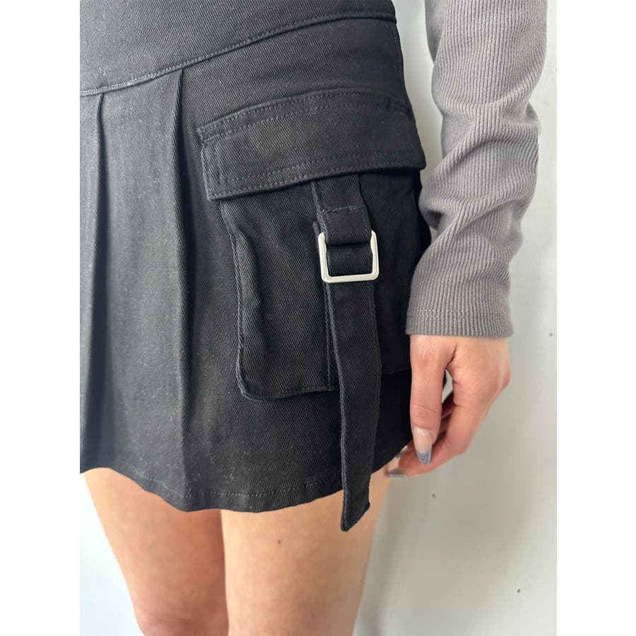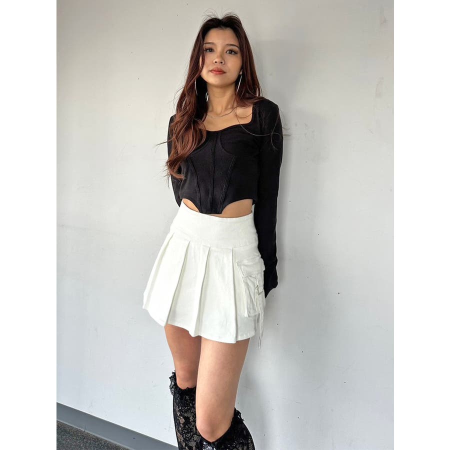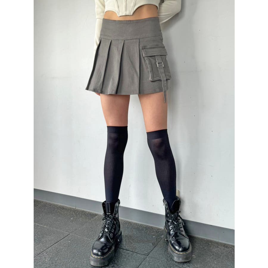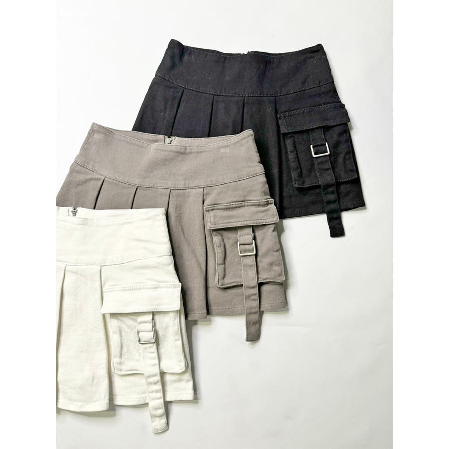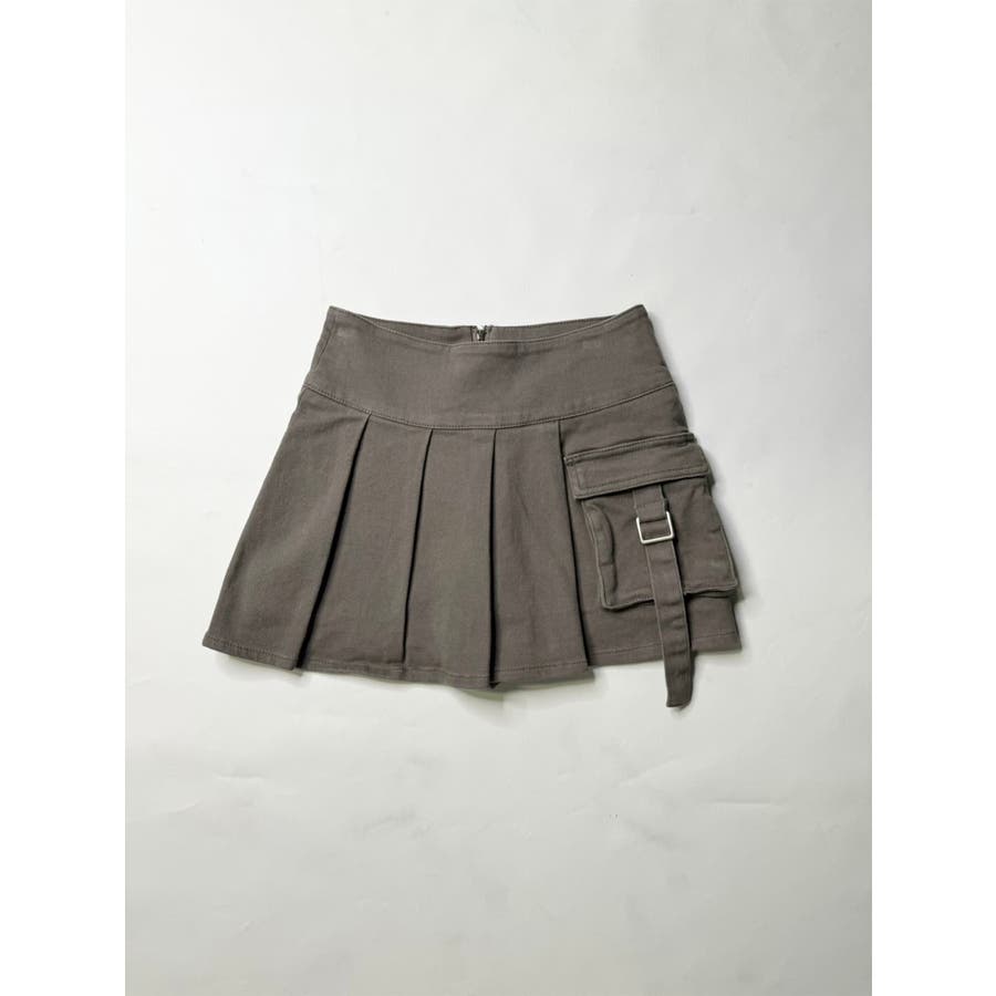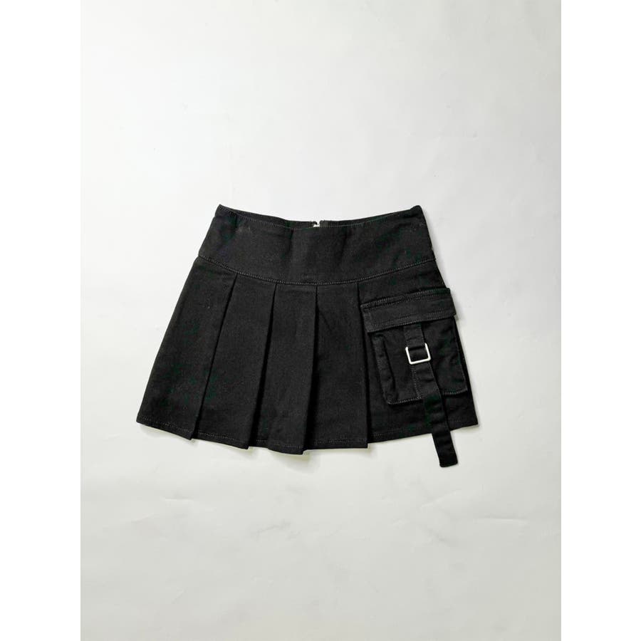 人気のカーゴポケットプリーツスカートが再登場。エッジの効いたBIGカーゴポケットが印象的な、ツイル生地のプリーツスカートです。ポケットに取り付けた紐はあえて裾からはみ出るよう長めに設定。見た目のインパクトに加え、マチがある大容量のポケットは利便性も優れています。フロントのみに入れたプリーツは幅を広く設定する事で可愛くなり過ぎないデザインに仕上げました。共地のインナーショートパンツ付きなので裾が広がるプリーツでも安心して着用可能です。太めのウエスト切替がY2K感漂う一枚になっています。