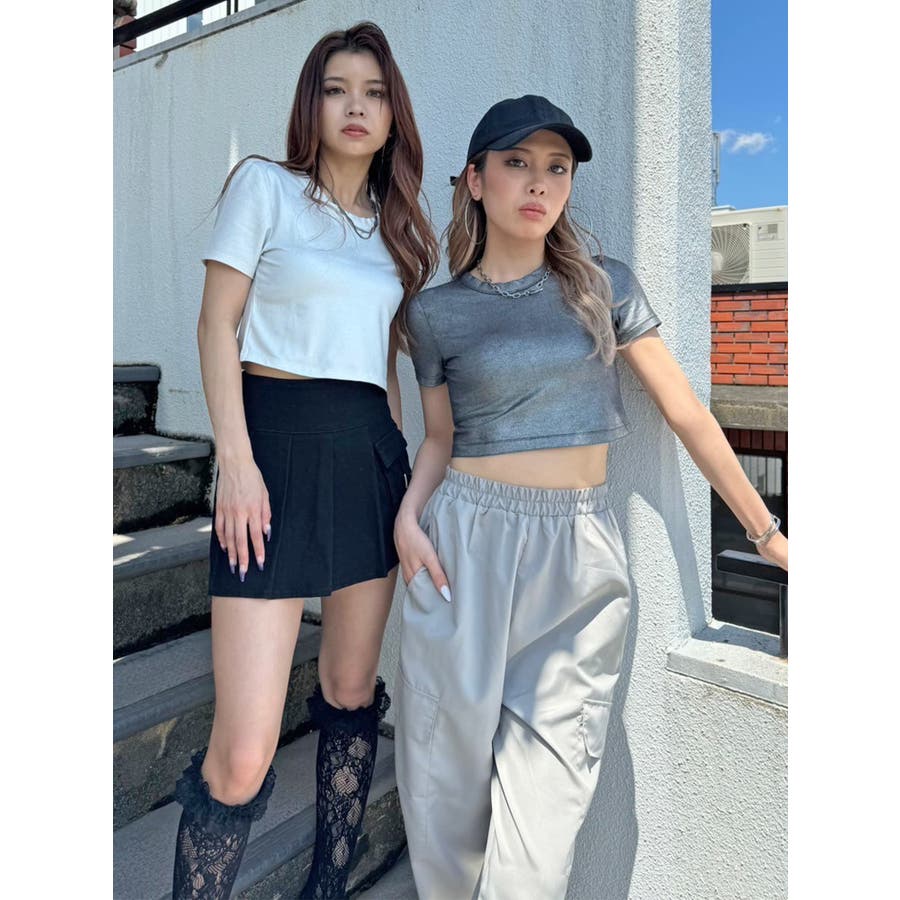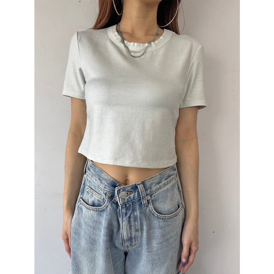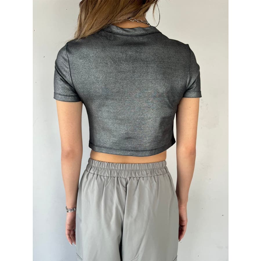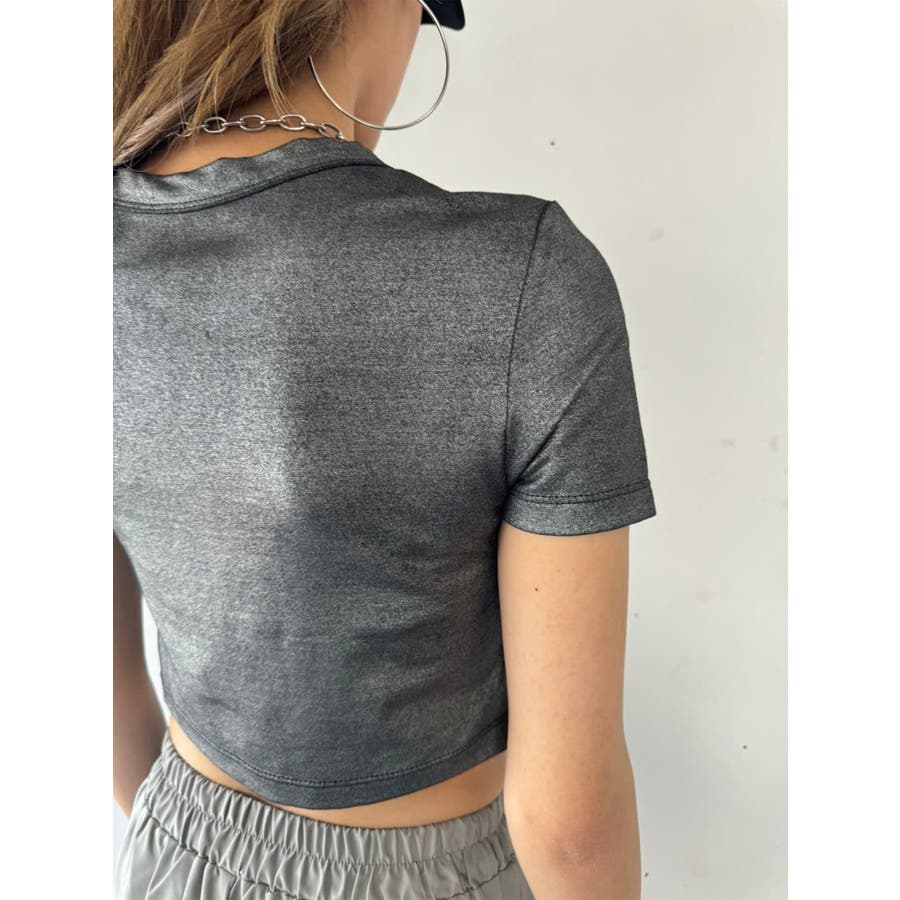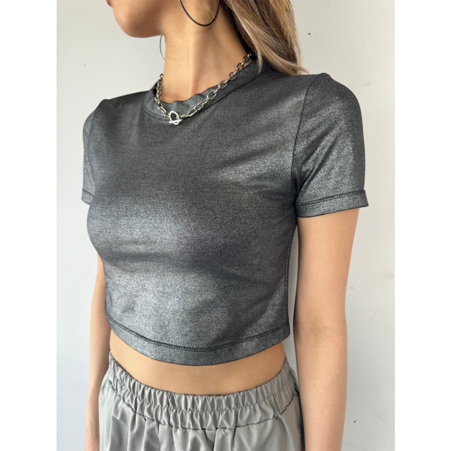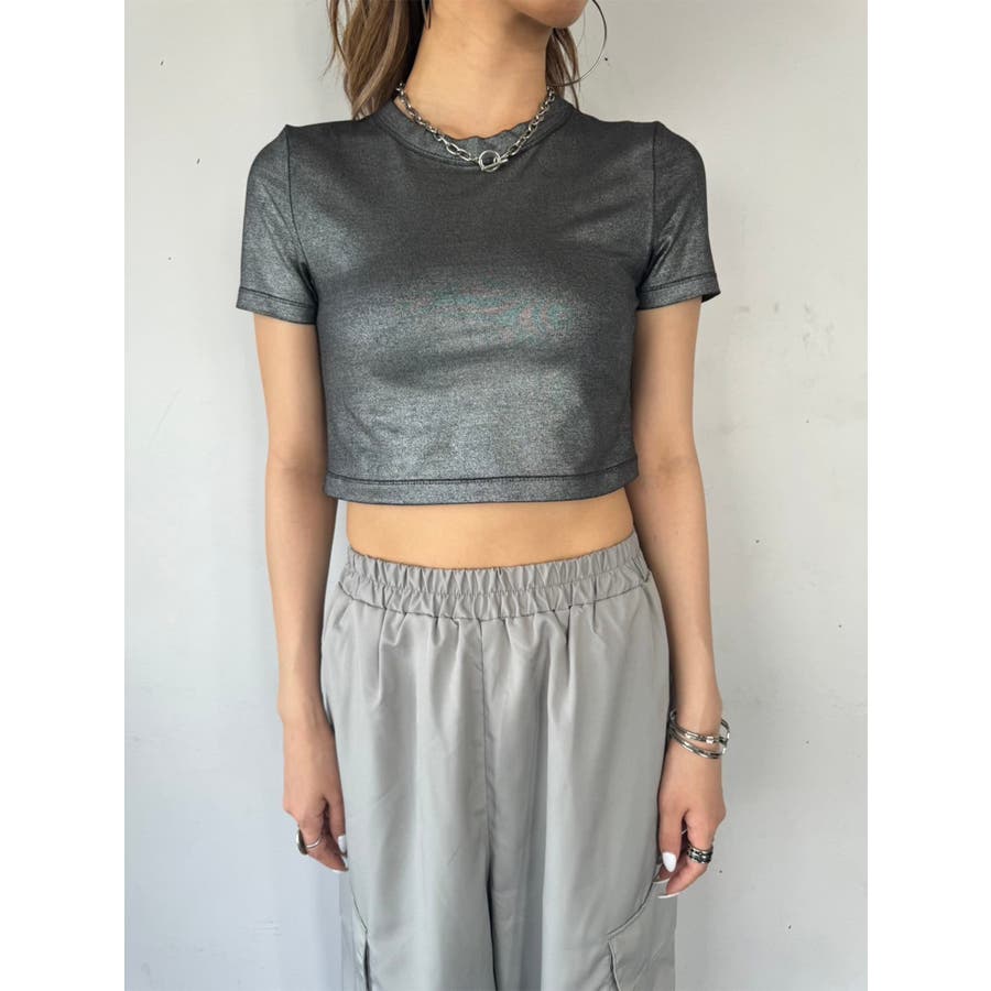 シャイニー感たっぷりのショート丈半袖トップス。コンパクトな仕様でトレンド要素を取り入れたトップスはお手持ちのアイテムに合わせるだけで今っぽいコーデに仕上がります。ベーシックなBLACKとWHITEの生地にシルバー系のラメをプリントしてどなたでも取り入れやすいカラーにしました。インナーとしても活躍するトップスはビスチェなどとのレイヤードスタイルにもアクセントとなるのでおススメです。
