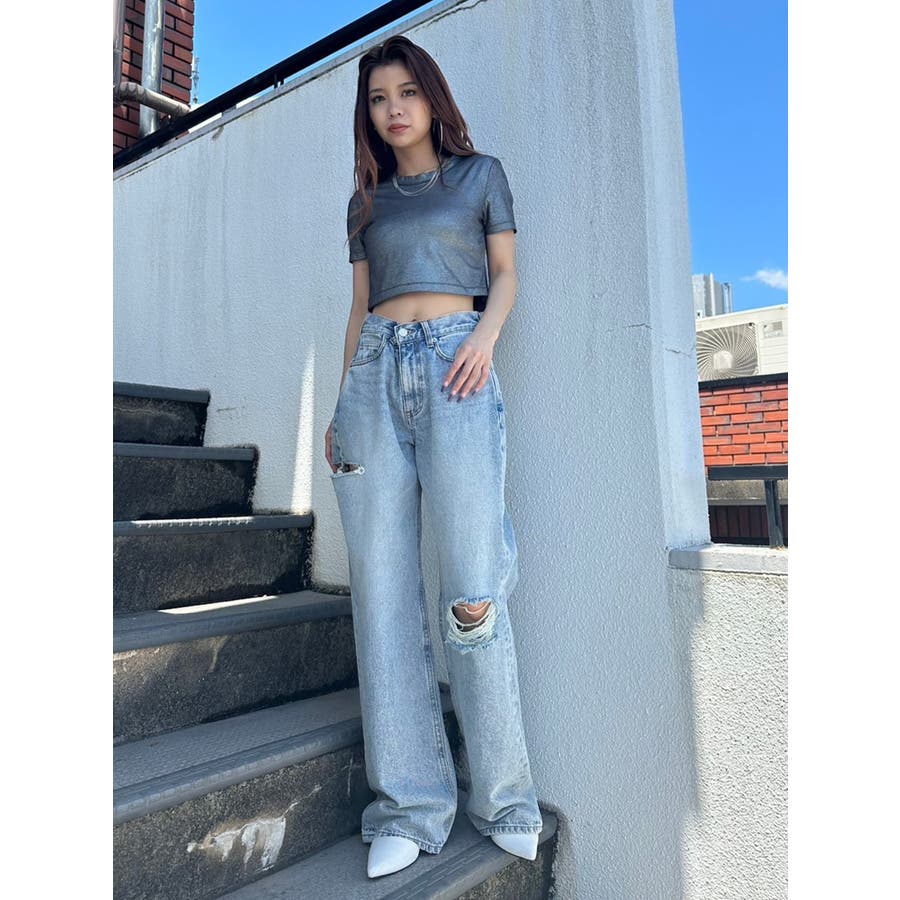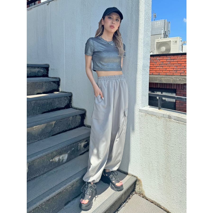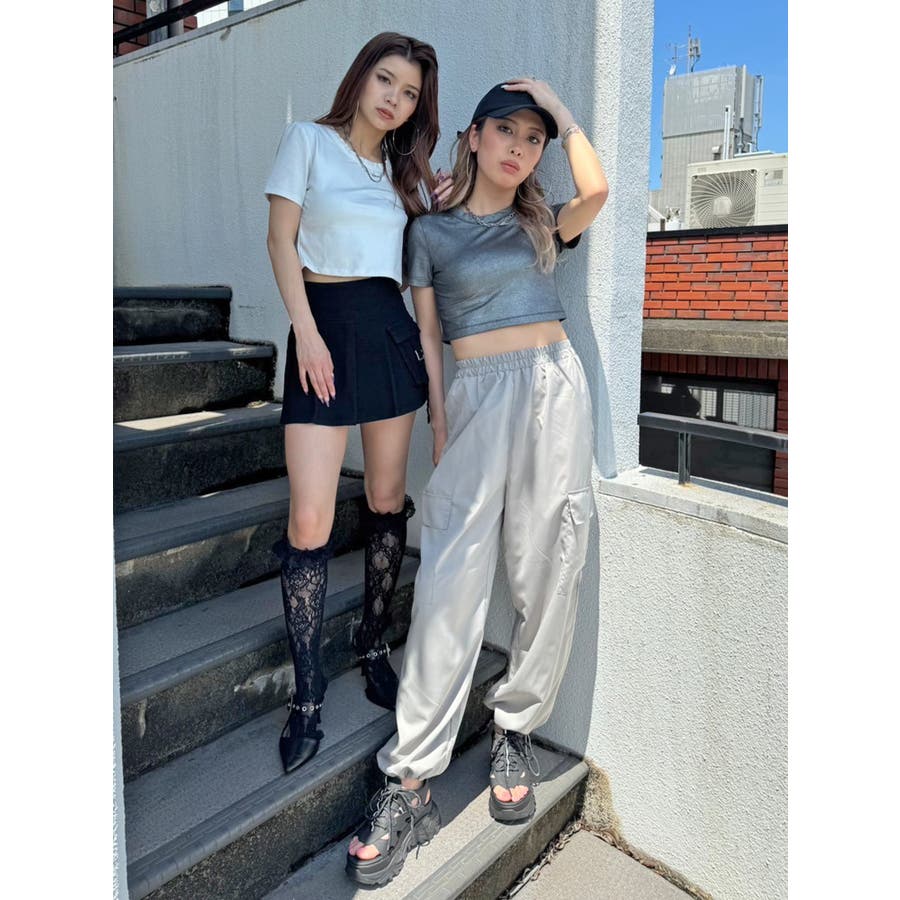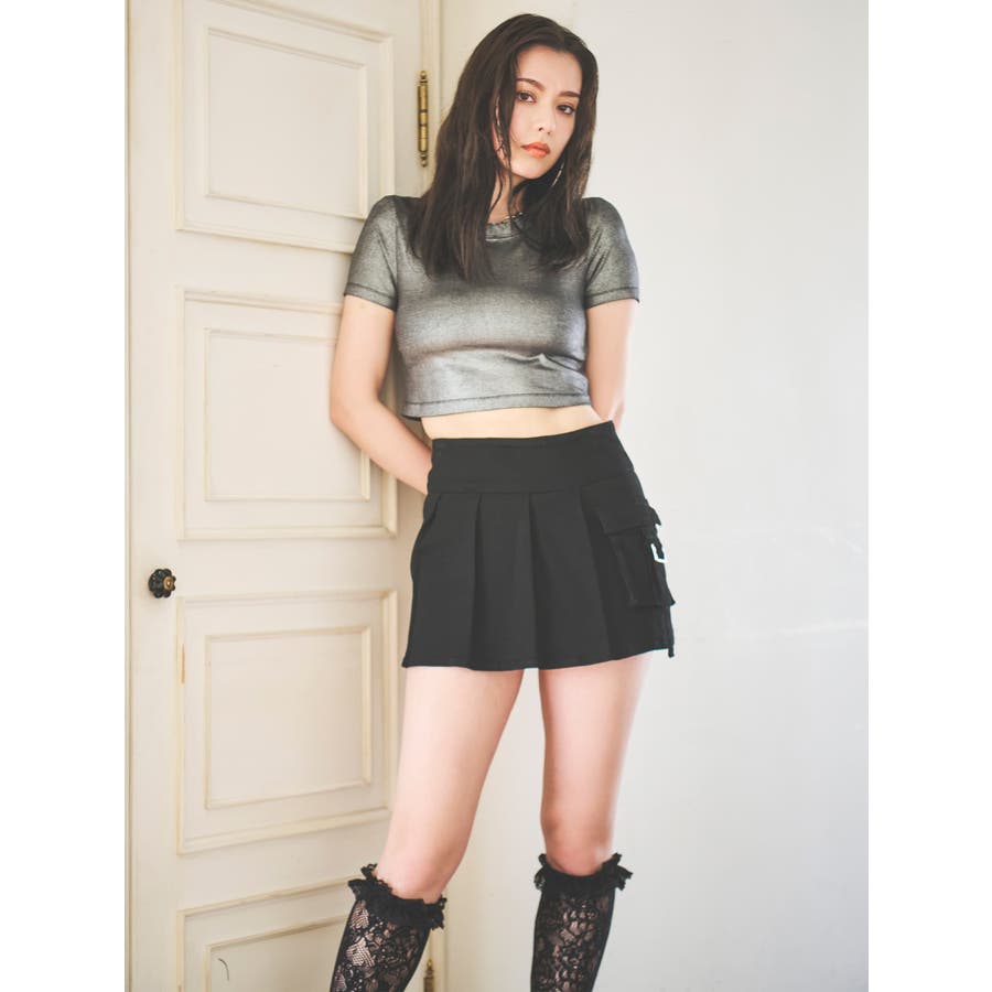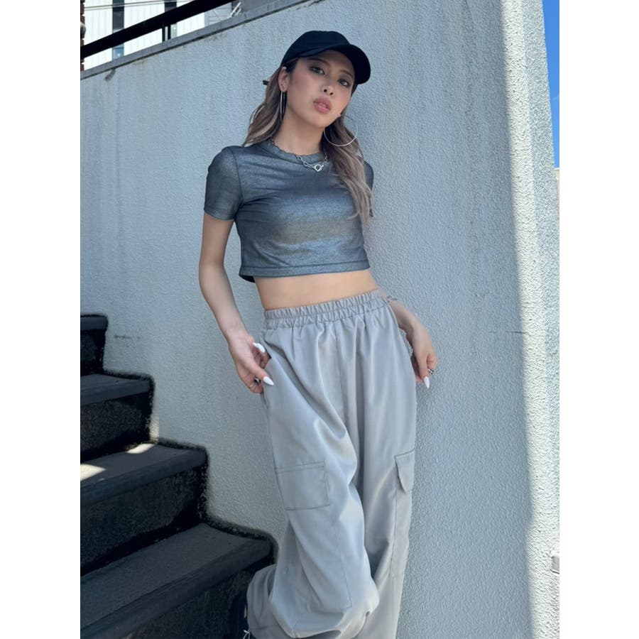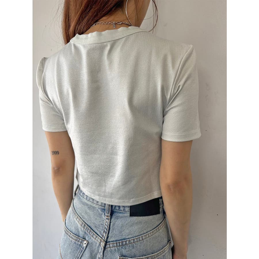 シャイニー感たっぷりのショート丈半袖トップス。コンパクトな仕様でトレンド要素を取り入れたトップスはお手持ちのアイテムに合わせるだけで今っぽいコーデに仕上がります。ベーシックなBLACKとWHITEの生地にシルバー系のラメをプリントしてどなたでも取り入れやすいカラーにしました。インナーとしても活躍するトップスはビスチェなどとのレイヤードスタイルにもアクセントとなるのでおススメです。