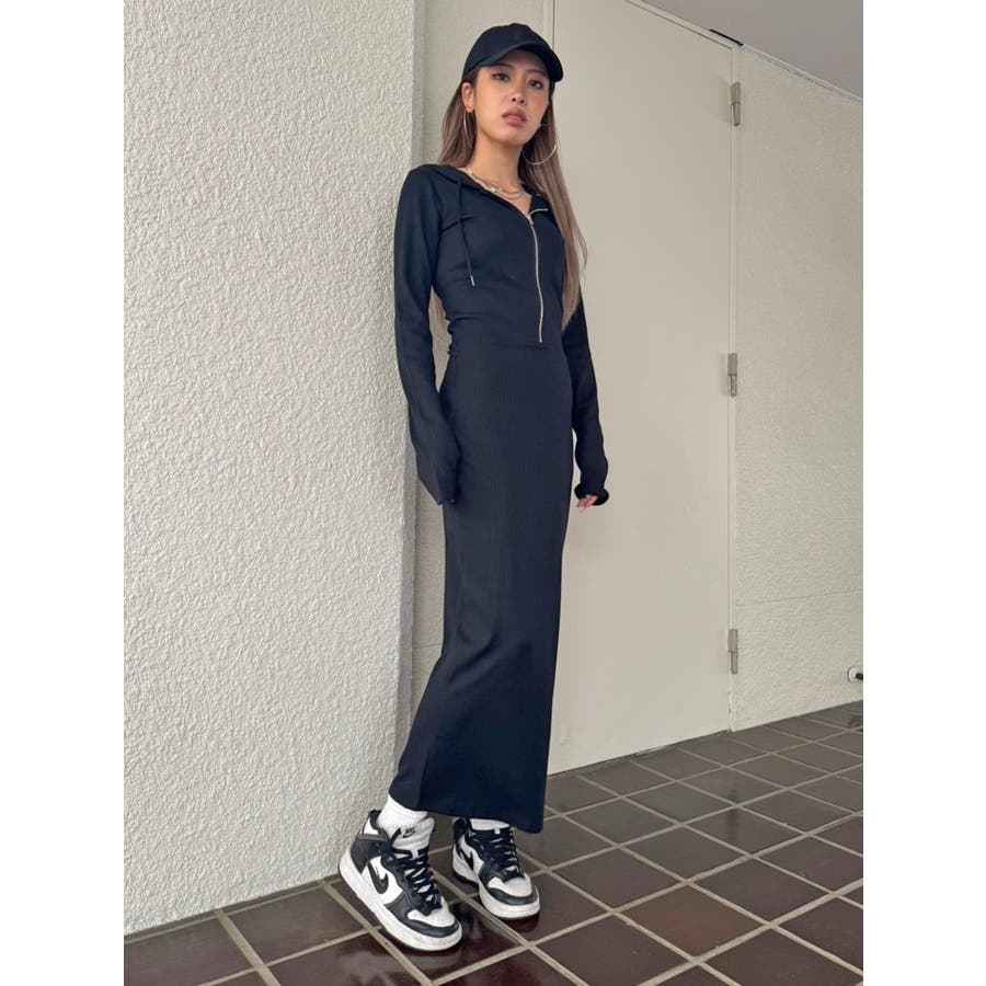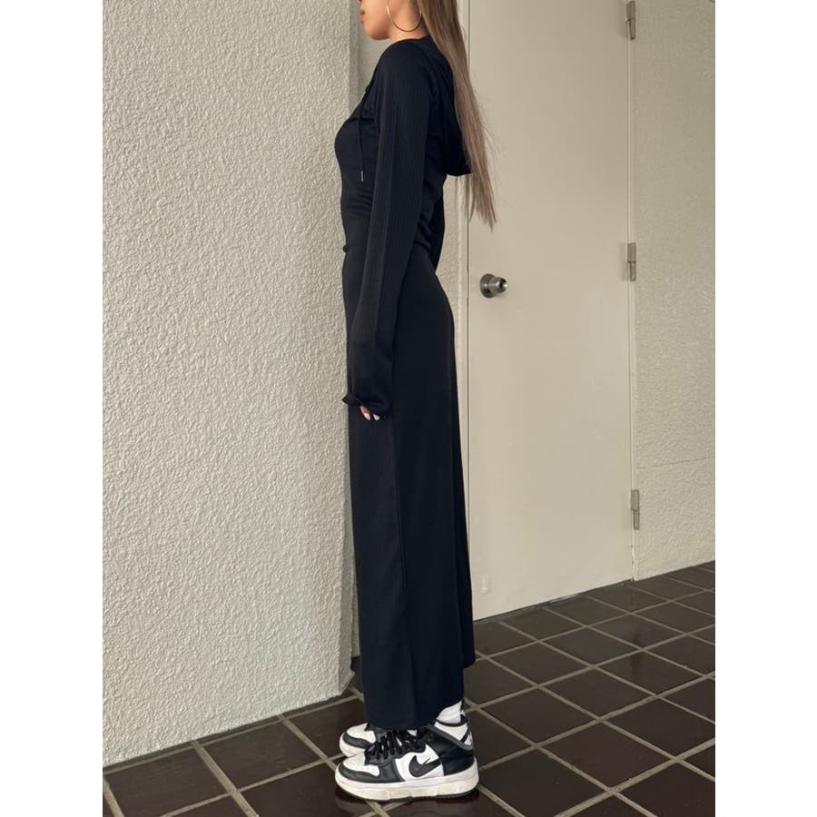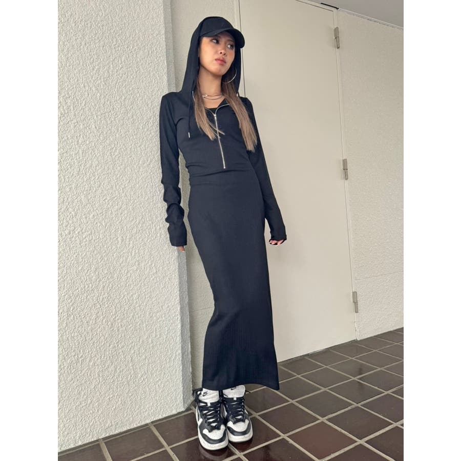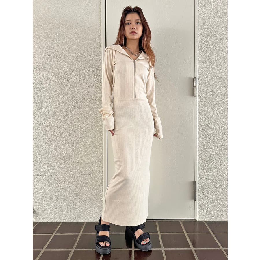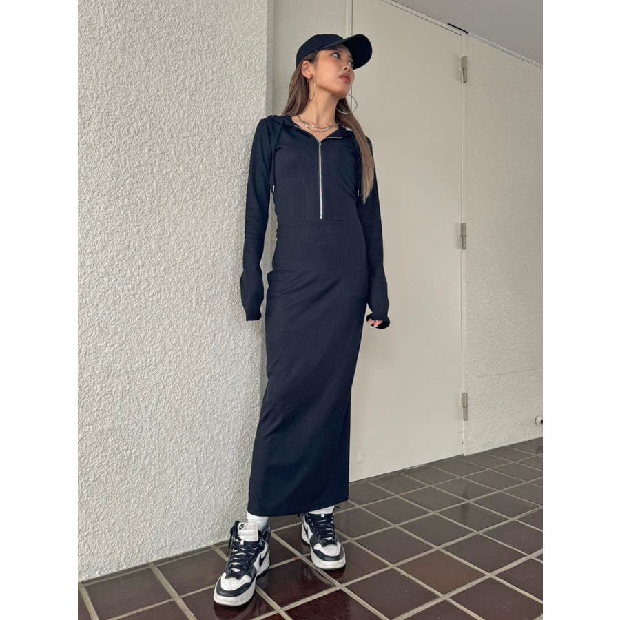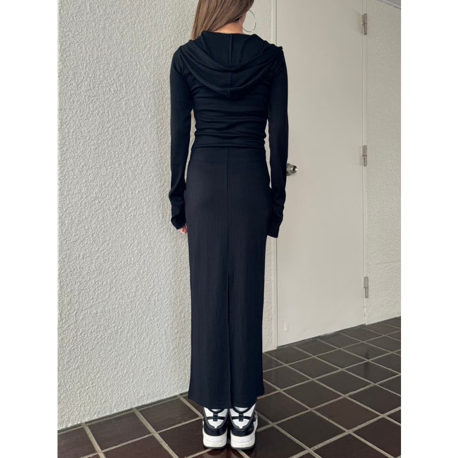 上身頃にフロントZIPを施したリブ編みのタイトなフーディロングワンピース。リブの縦ラインとウエスト位置の切替えでシンプルながらこの一着でスタイルアップが叶う優れもの。柔らかいカット生地は着心地が良くバックスリット仕様で動きやすさも抜群なためデイリー使いにおススメ。フロントのZIPはお好みで開き具合を調整でき、インナー使いでコーデの幅を広げられます。