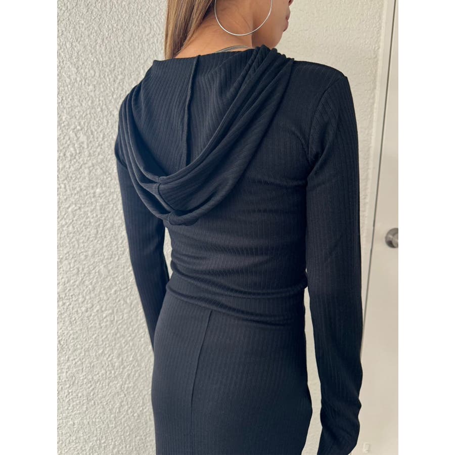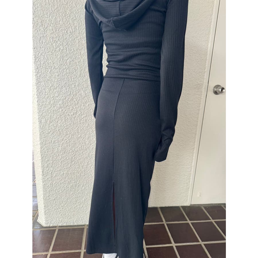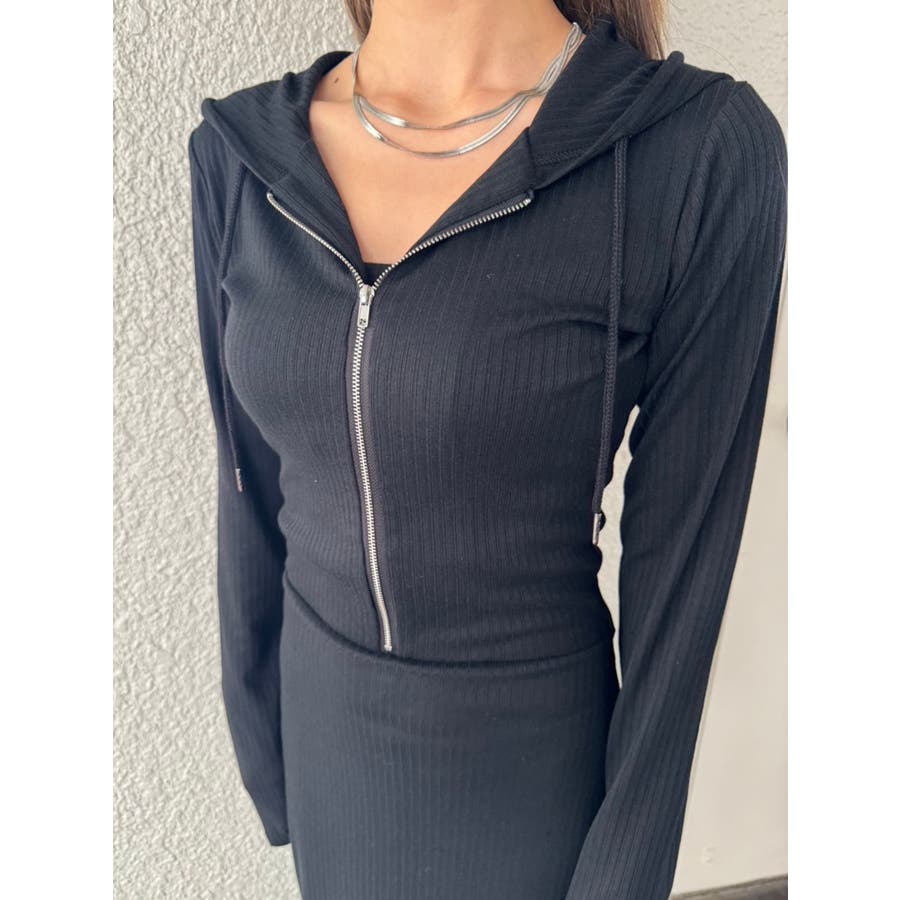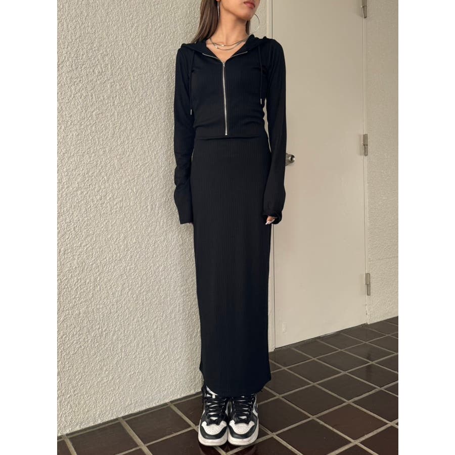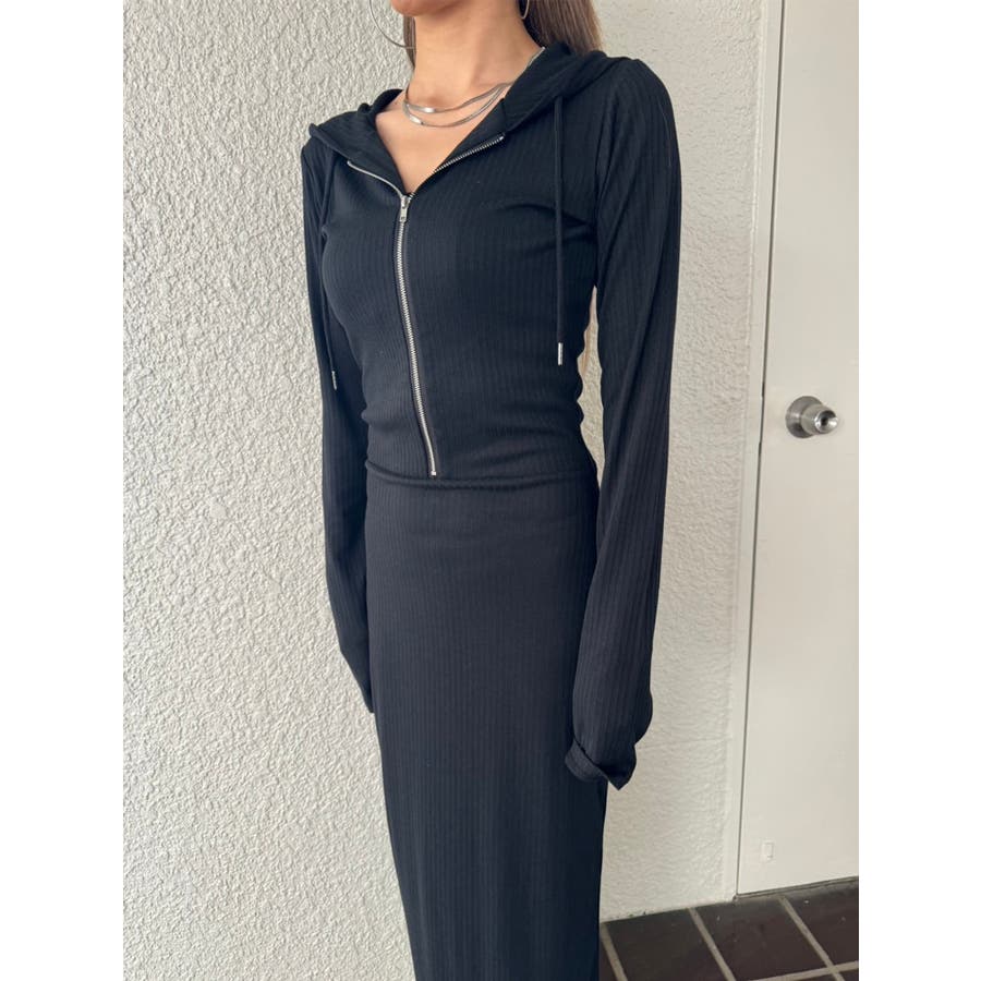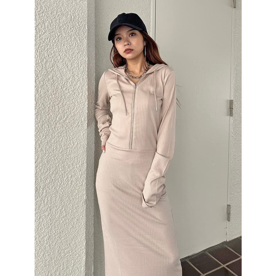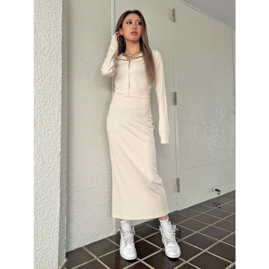 上身頃にフロントZIPを施したリブ編みのタイトなフーディロングワンピース。リブの縦ラインとウエスト位置の切替えでシンプルながらこの一着でスタイルアップが叶う優れもの。柔らかいカット生地は着心地が良くバックスリット仕様で動きやすさも抜群なためデイリー使いにおススメ。フロントのZIPはお好みで開き具合を調整でき、インナー使いでコーデの幅を広げられます。